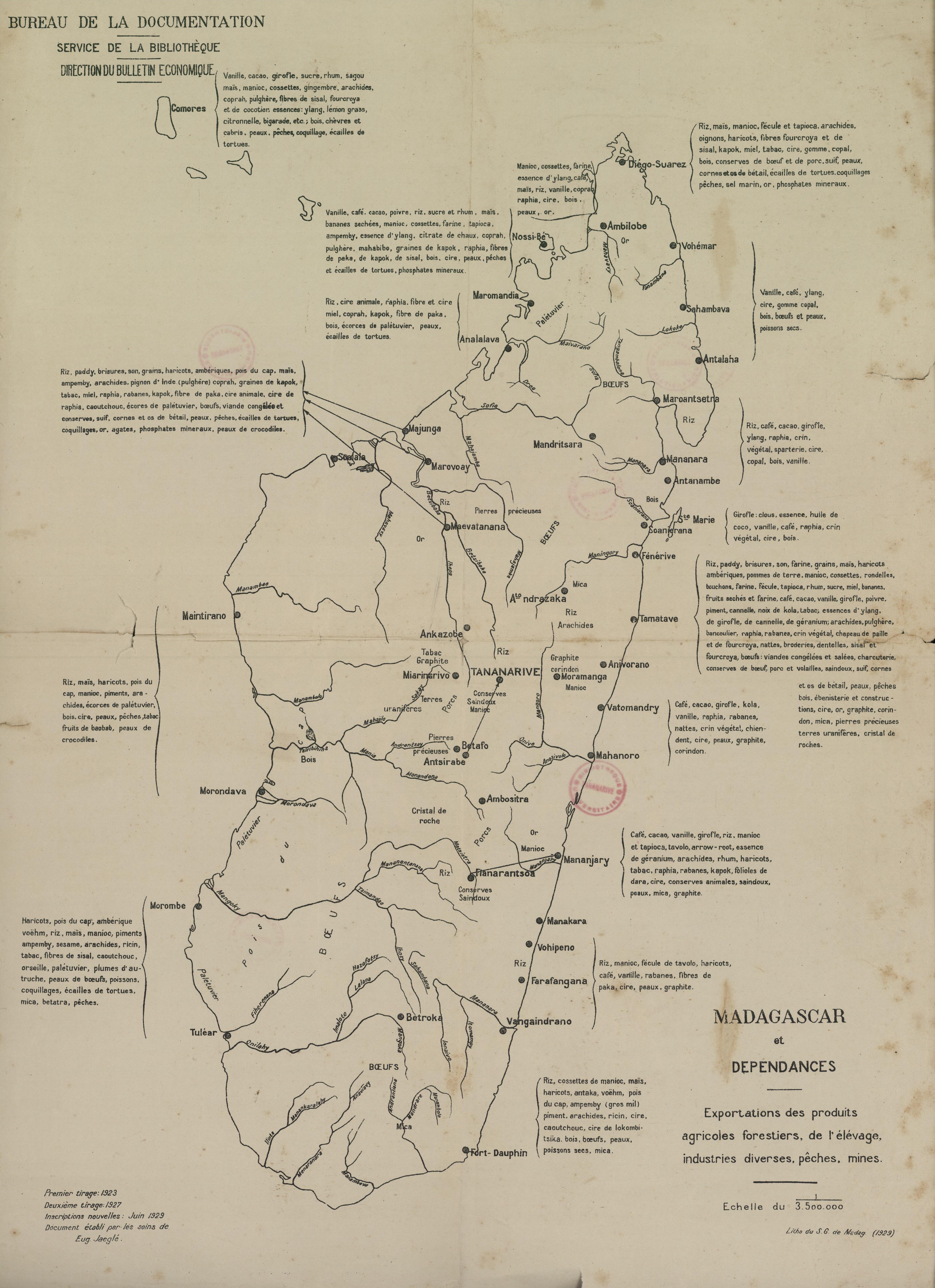 Madagascar et Dépendances : exportations des produits agricoles, forestiers, de l'élevage, industries diverses, pêches, mines. Echelle : 1/3.500.000