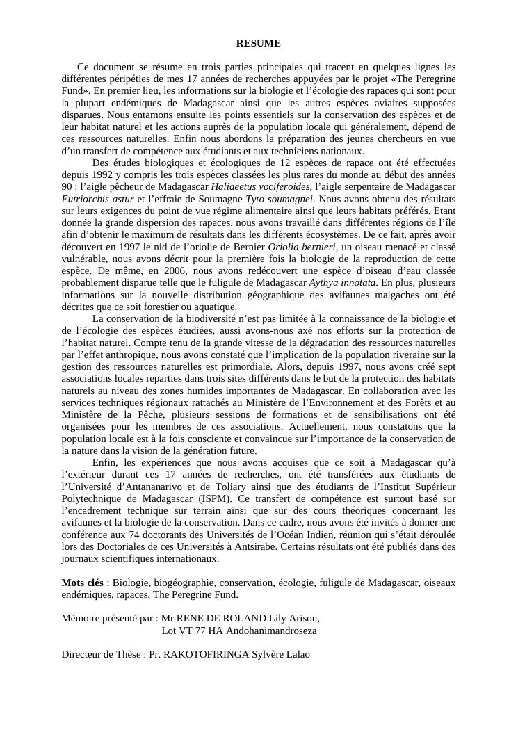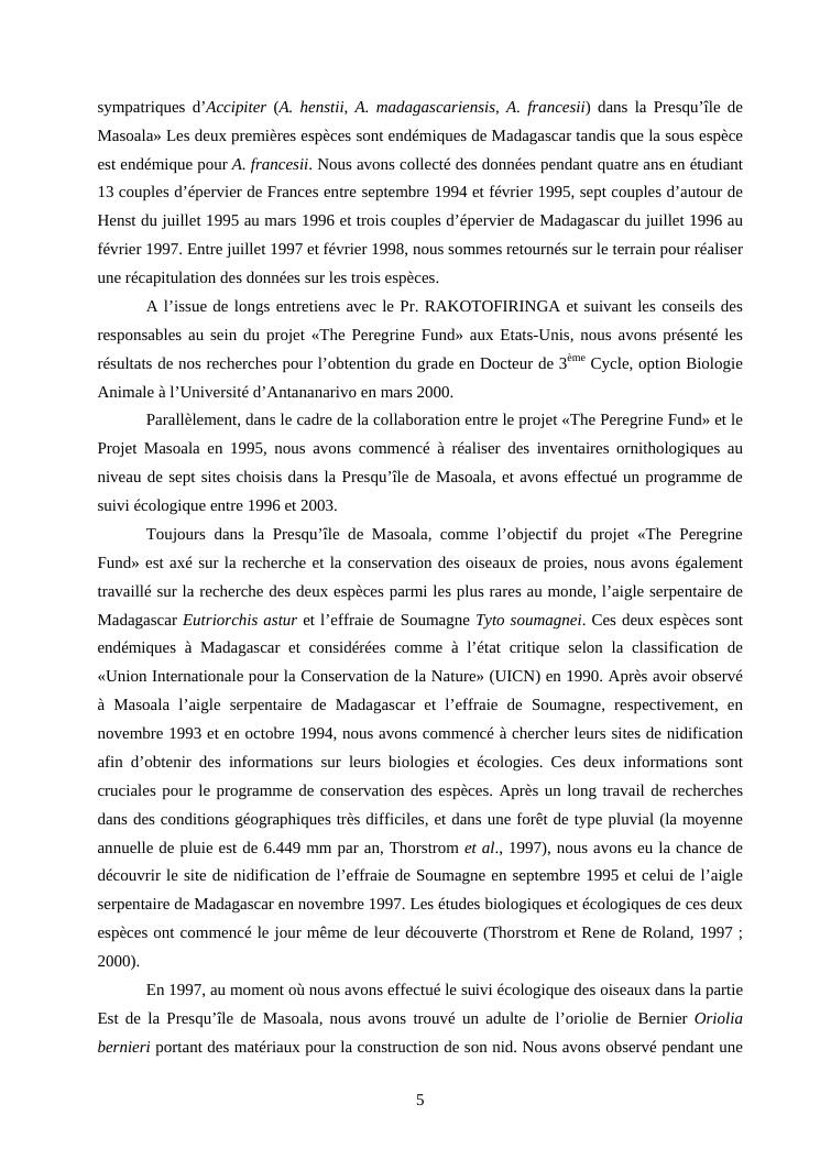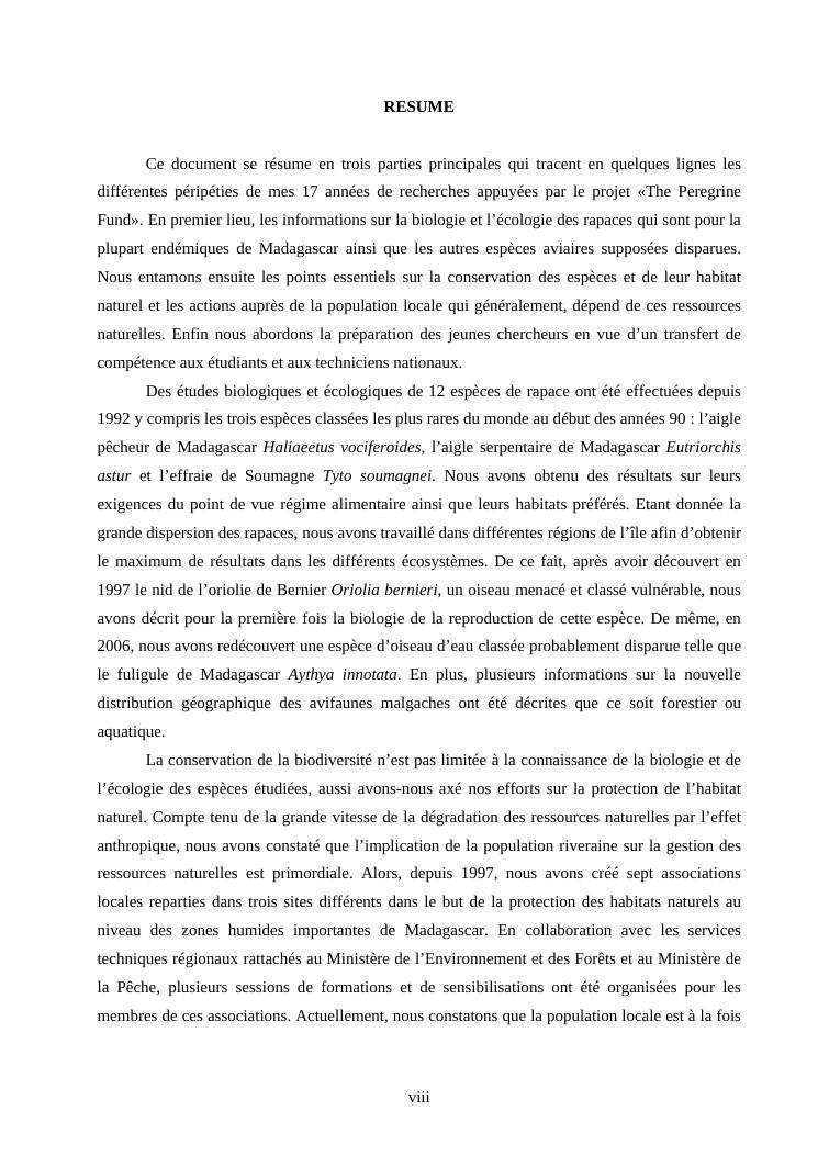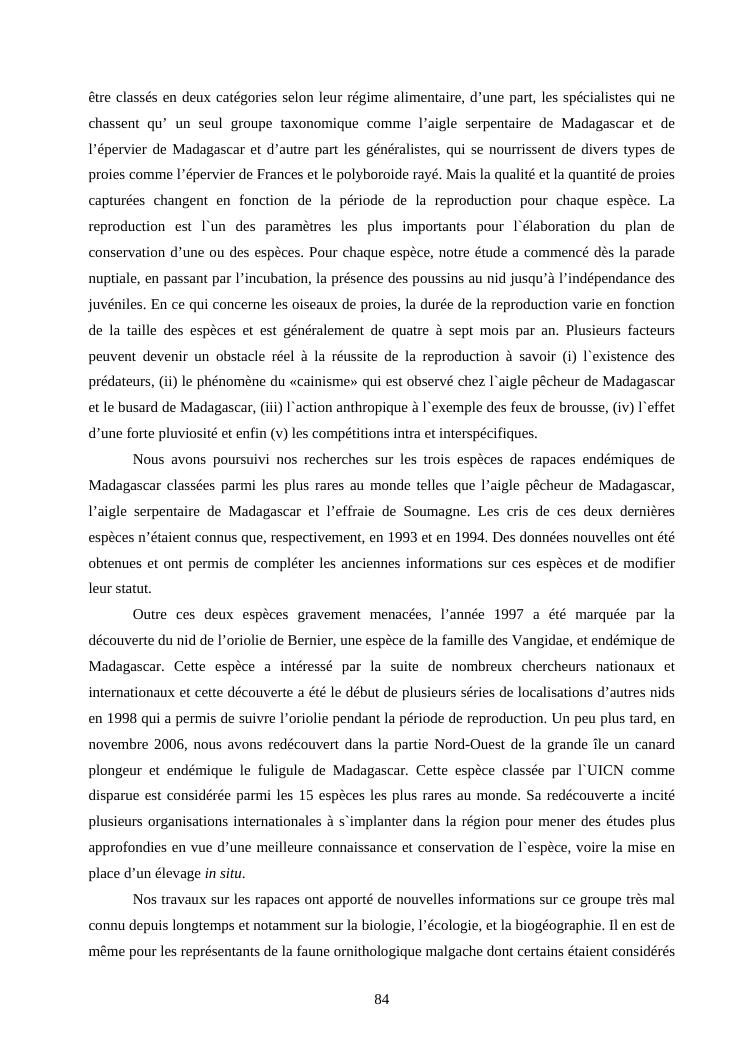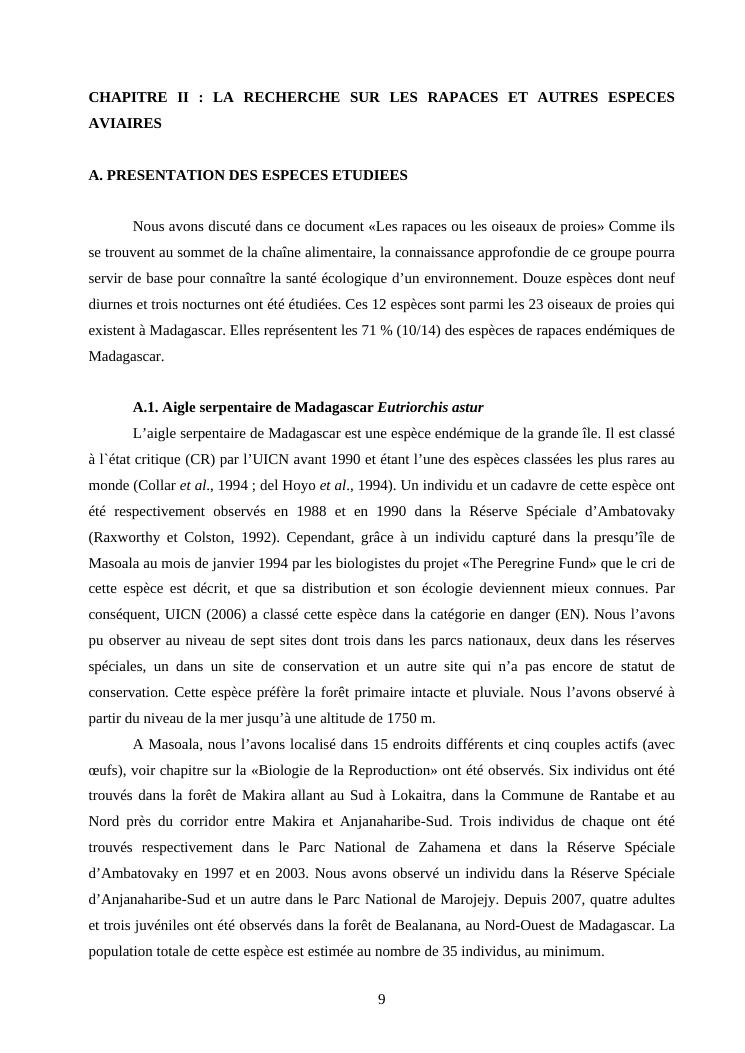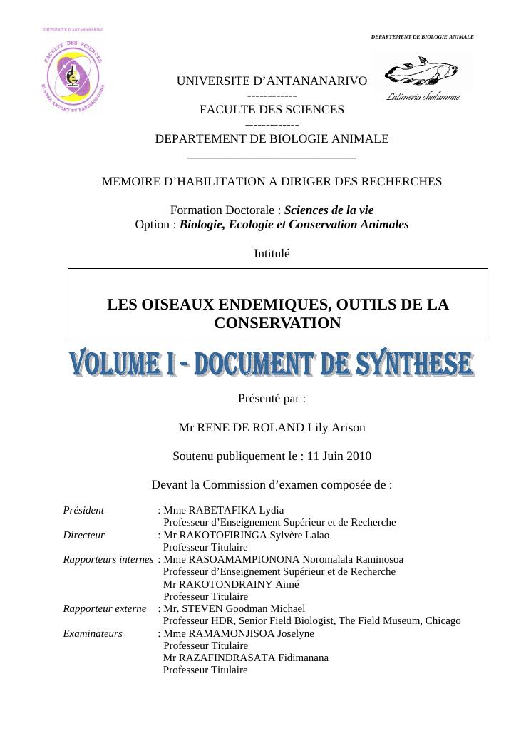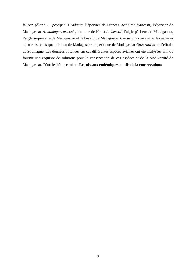 les oiseaux endemiques, outils de la conservation : volume i document de synthese