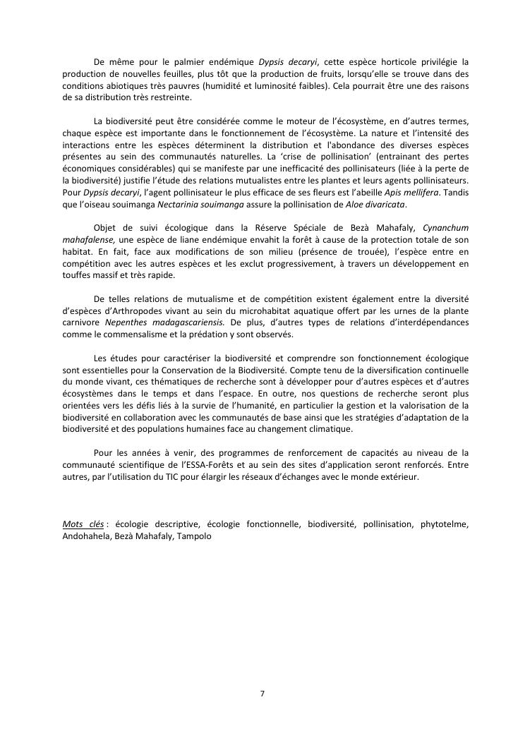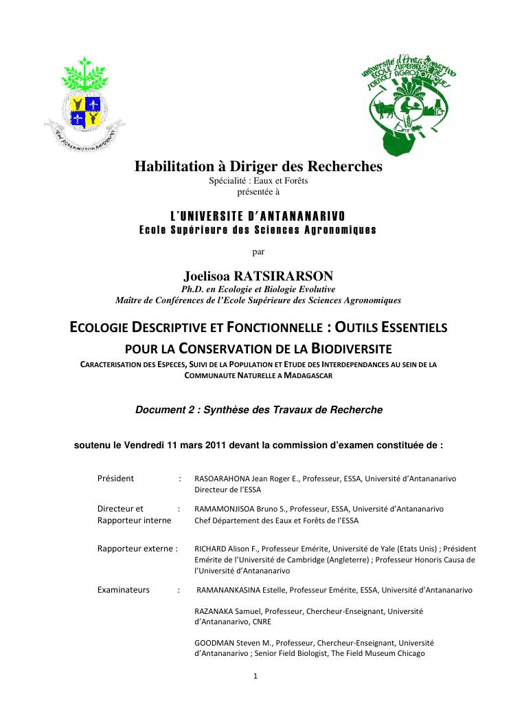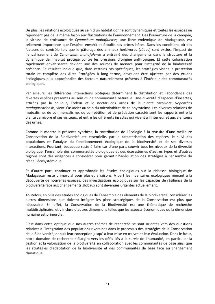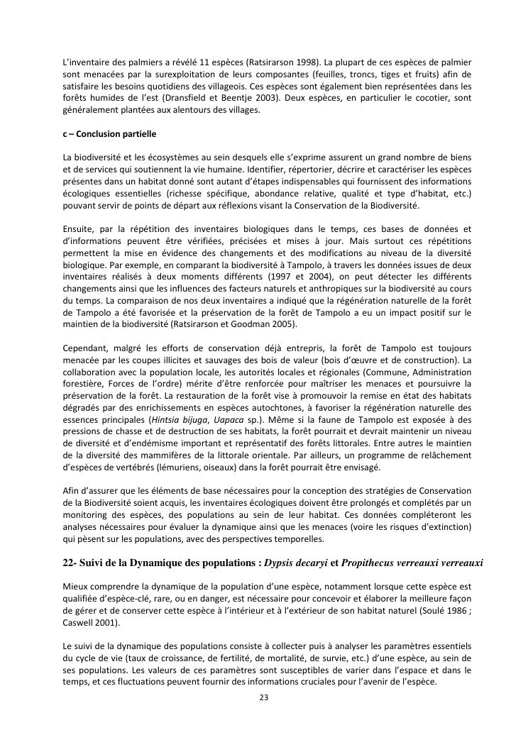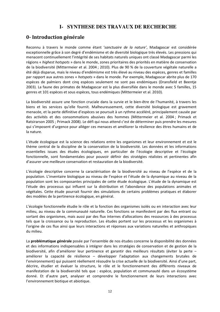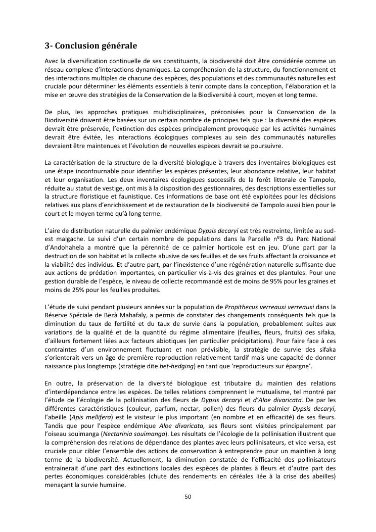 ecologie descriptive et fonctionnelle : outils essentiels pour la conservation de la biodiversite caracterisation des especes, suivi de la population et etude des interdependances au sein de la communaute naturelle a madagascar. document 2 : synthèse des travaux de recherche
