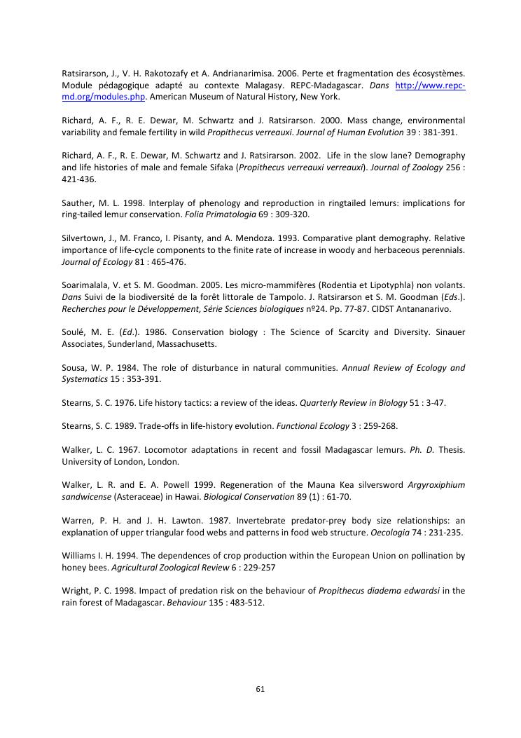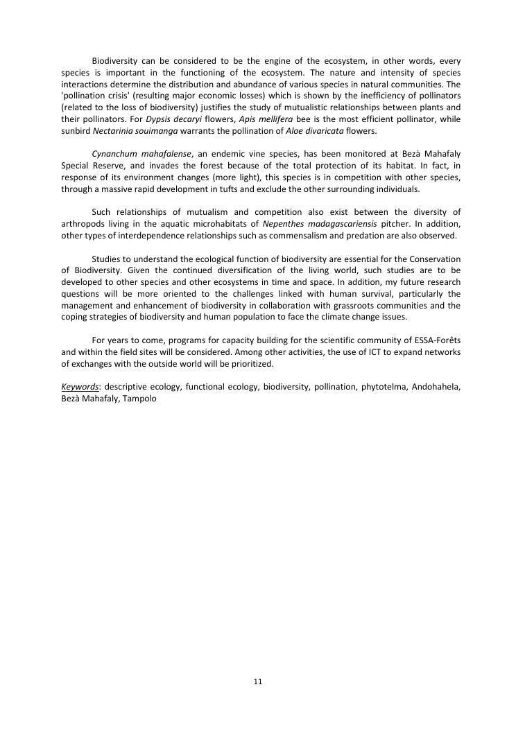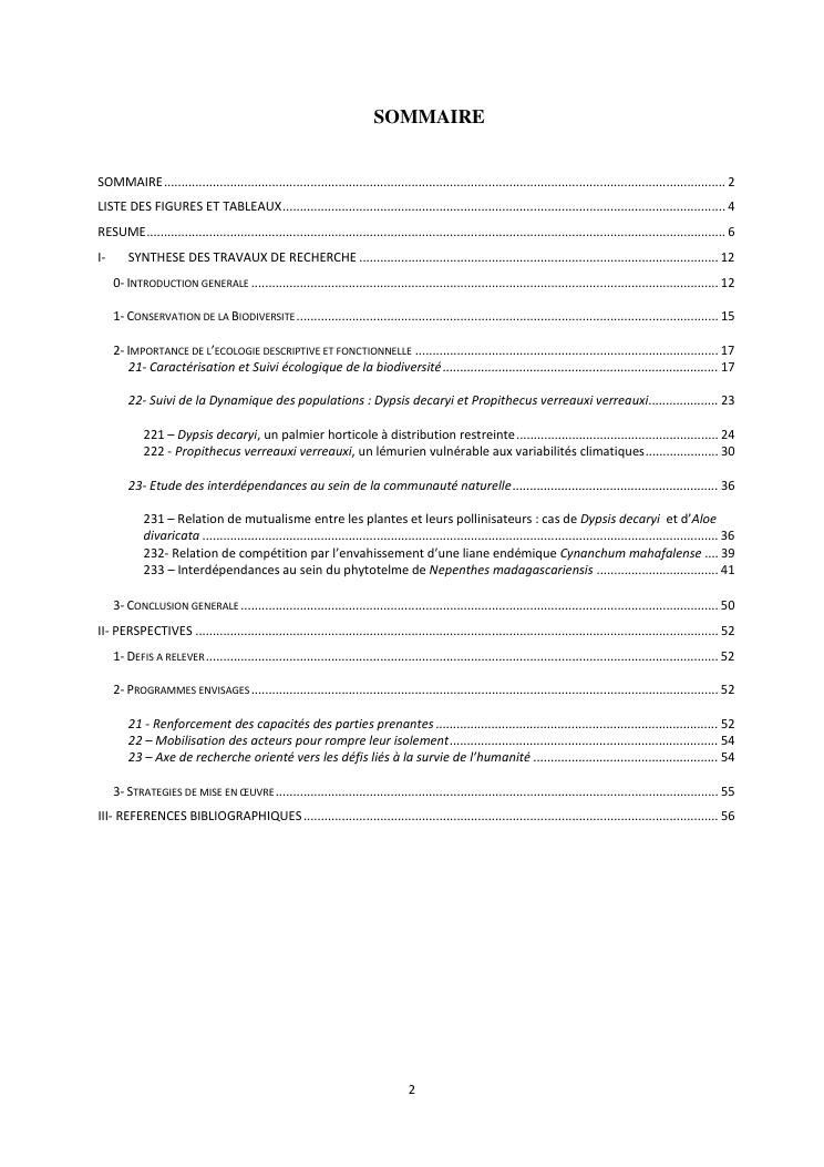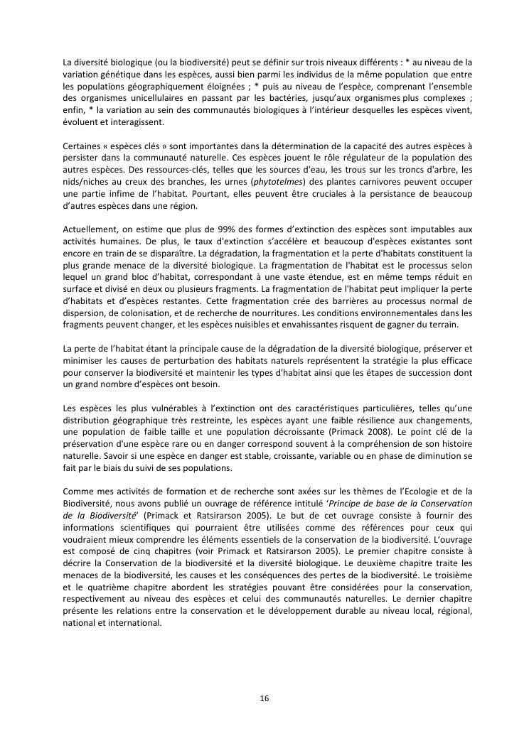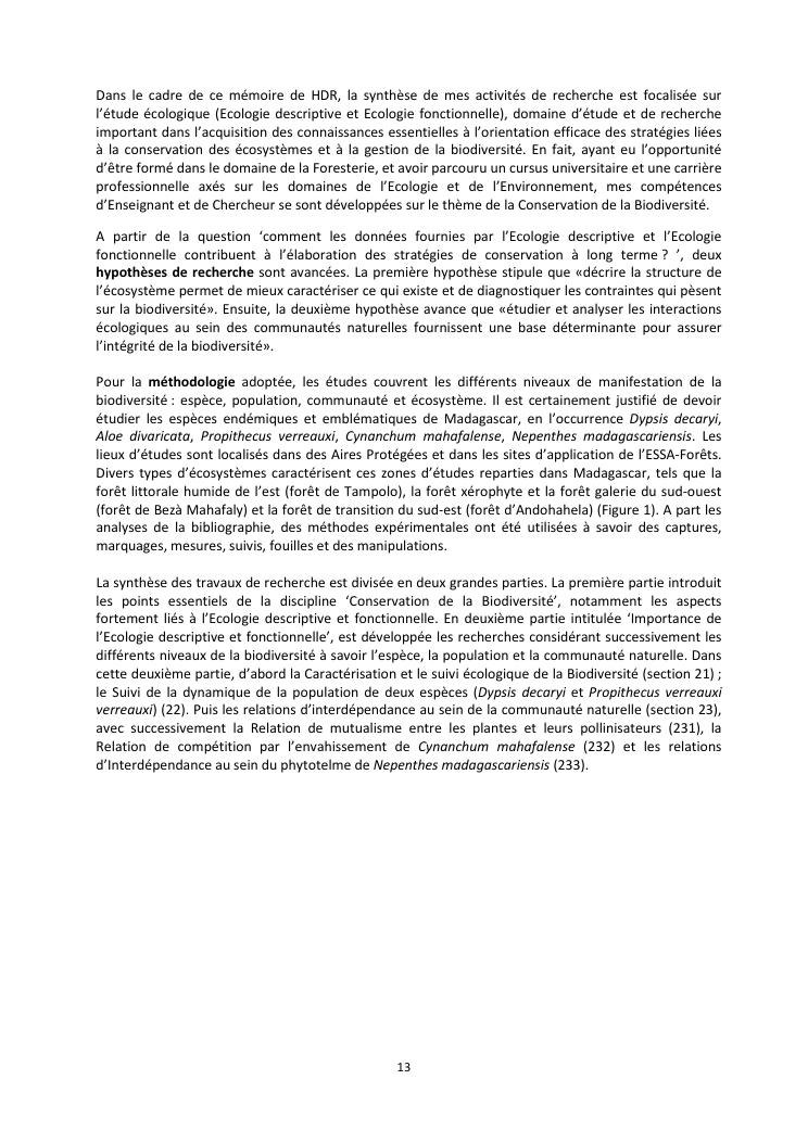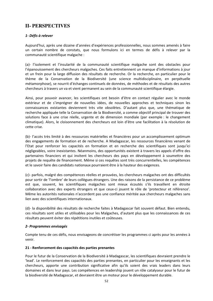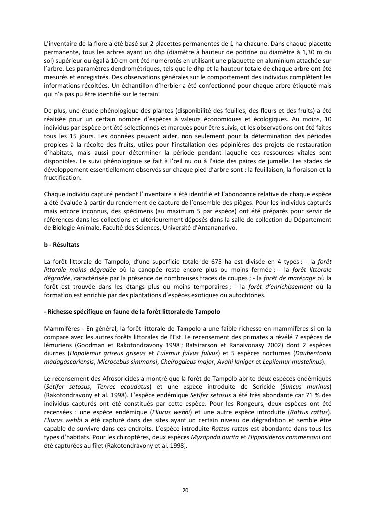 ecologie descriptive et fonctionnelle : outils essentiels pour la conservation de la biodiversite caracterisation des especes, suivi de la population et etude des interdependances au sein de la communaute naturelle a madagascar. document 2 : synthèse des travaux de recherche