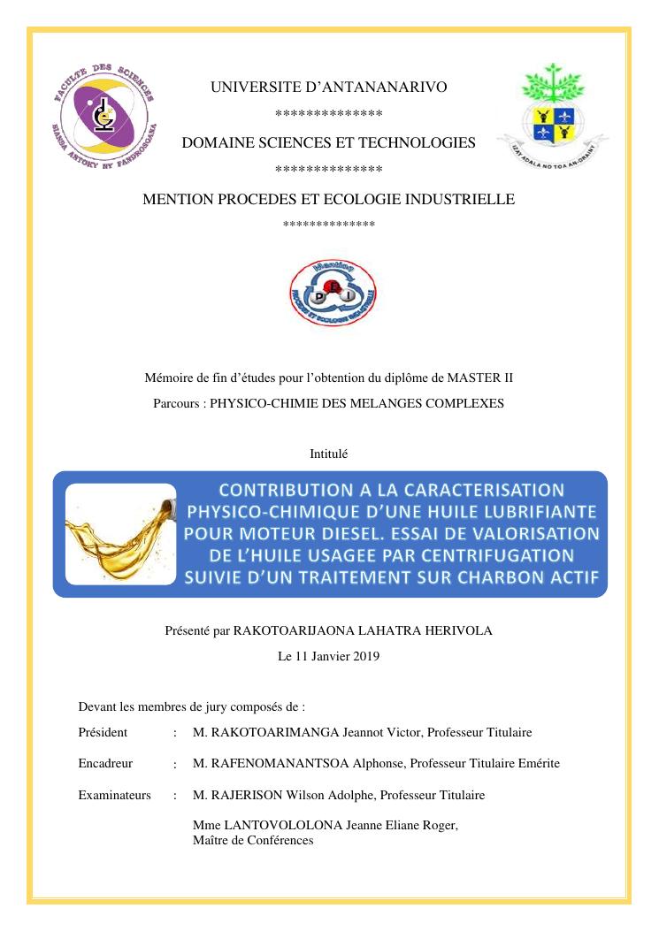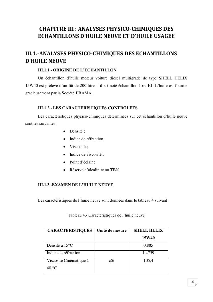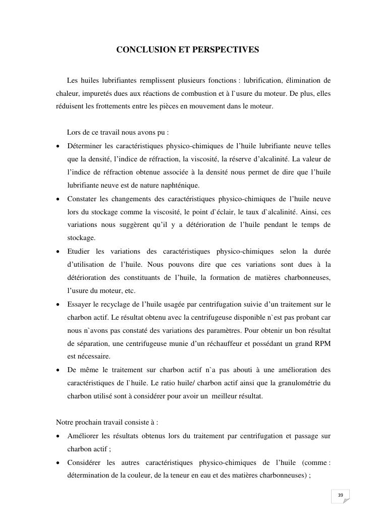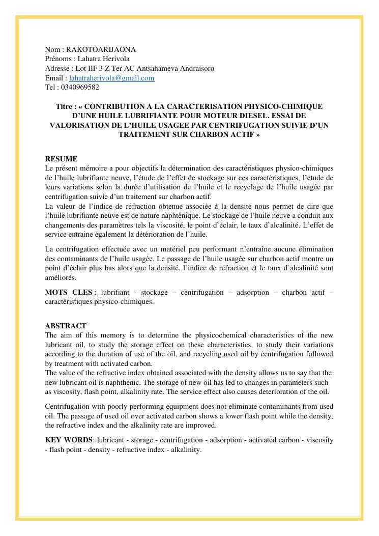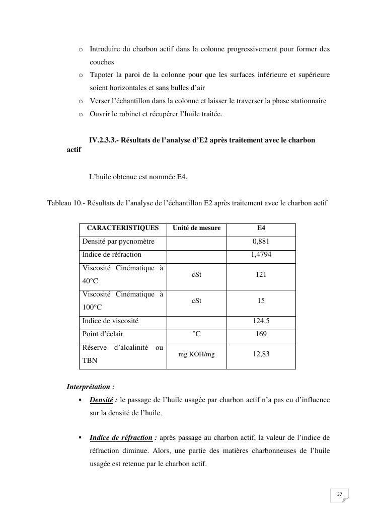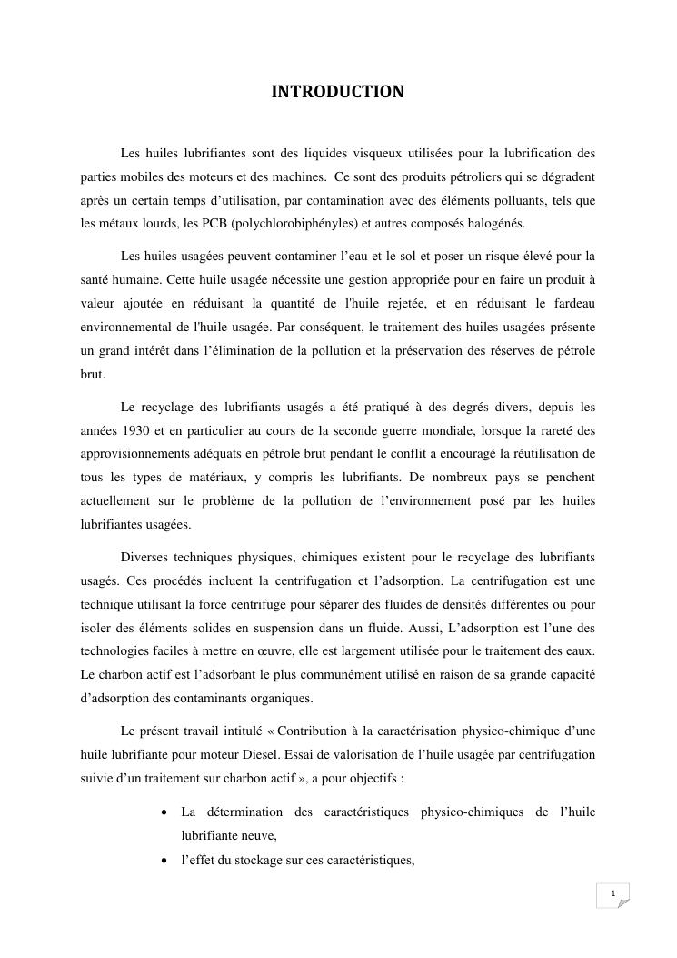 contribution a la caracterisation physico-chimique d'une huile lubrifiante pour moteur diesel. essai de valorisation de l'huile usagee par centrifugation suivie d'un traitement sur charbon actif