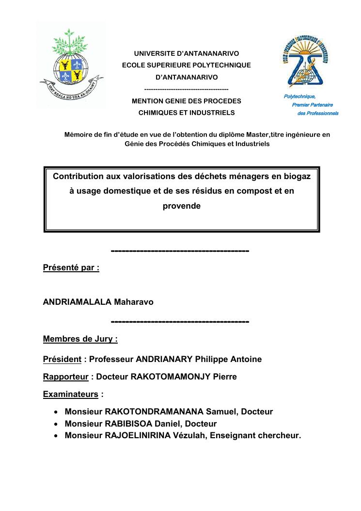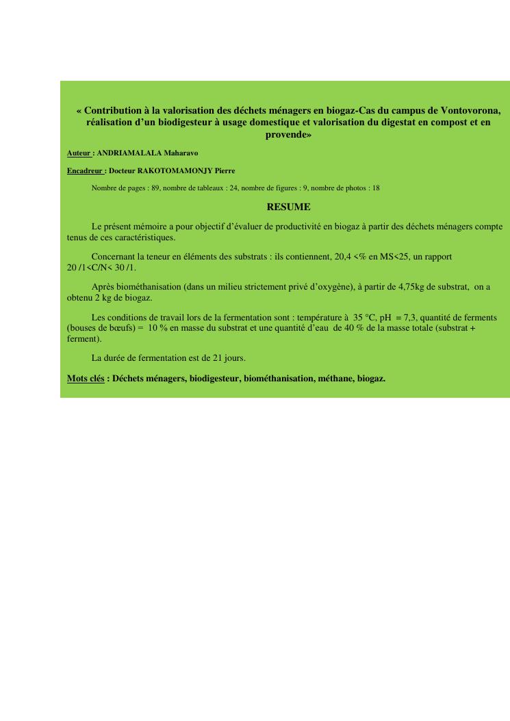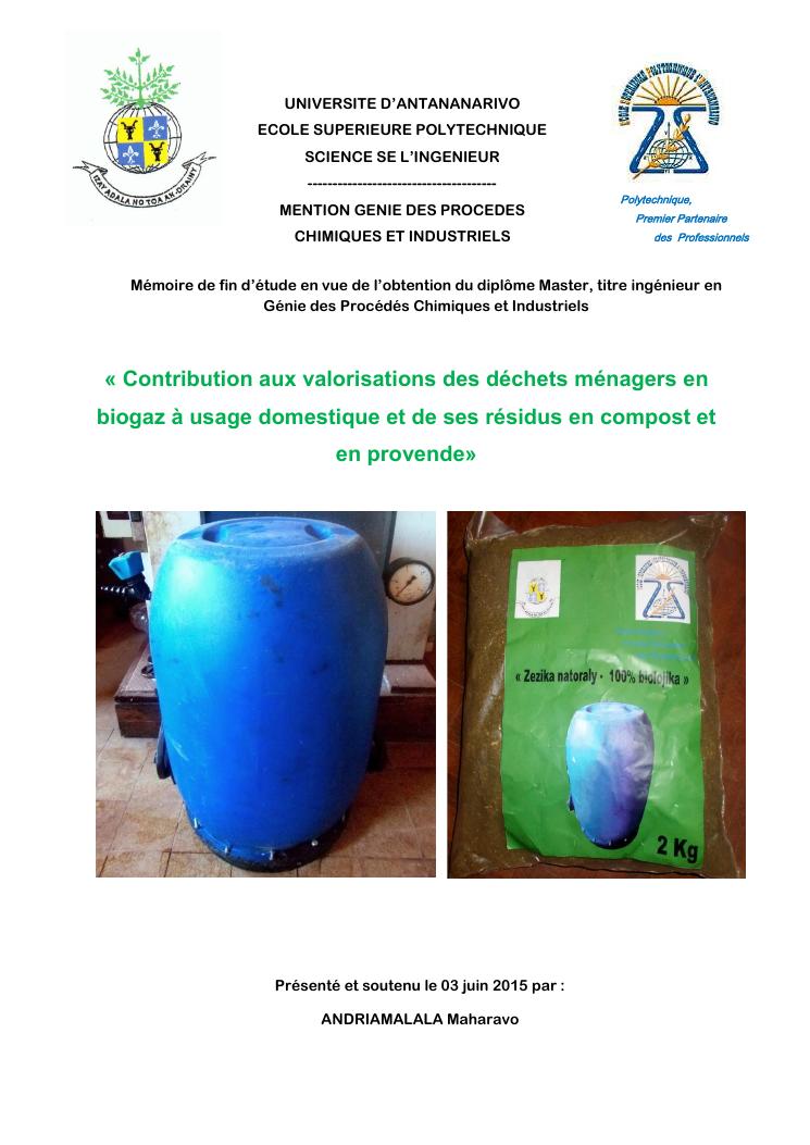 contribution aux valorisations des déchets ménagers en biogaz à usage domestique et de ses résidus en compost et en provende
