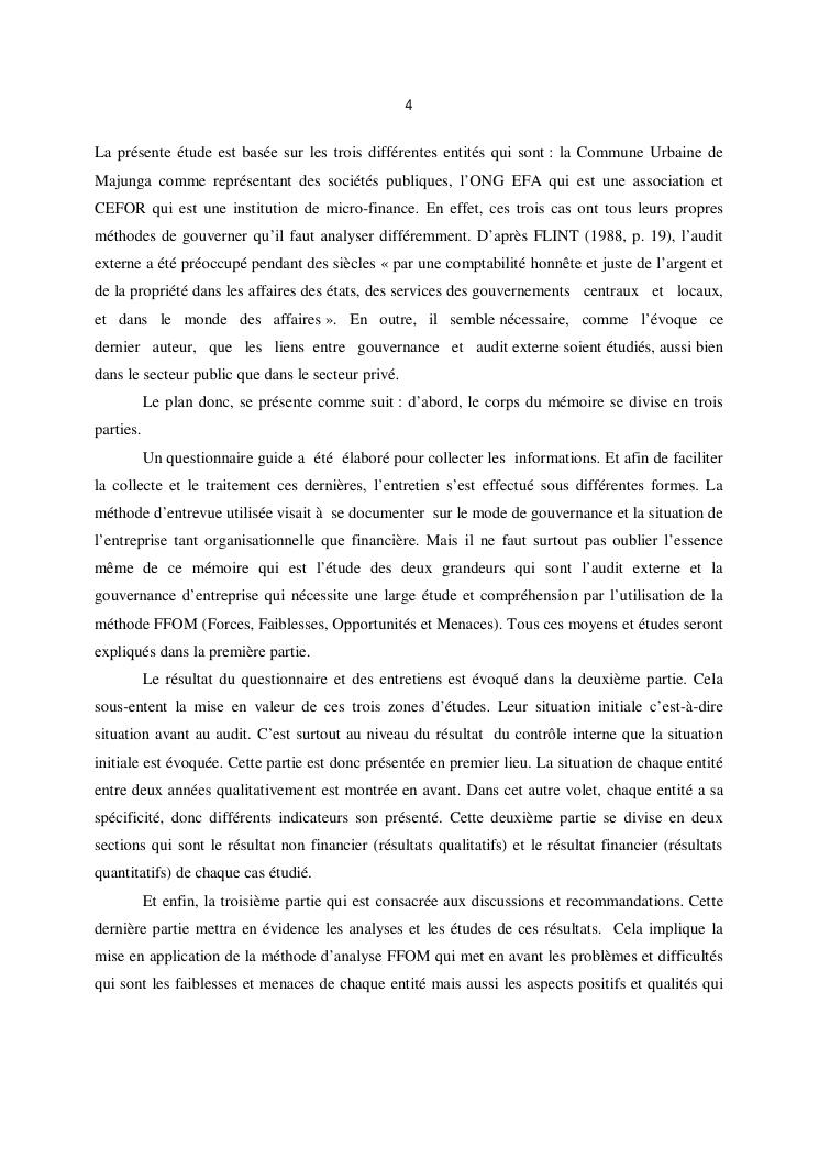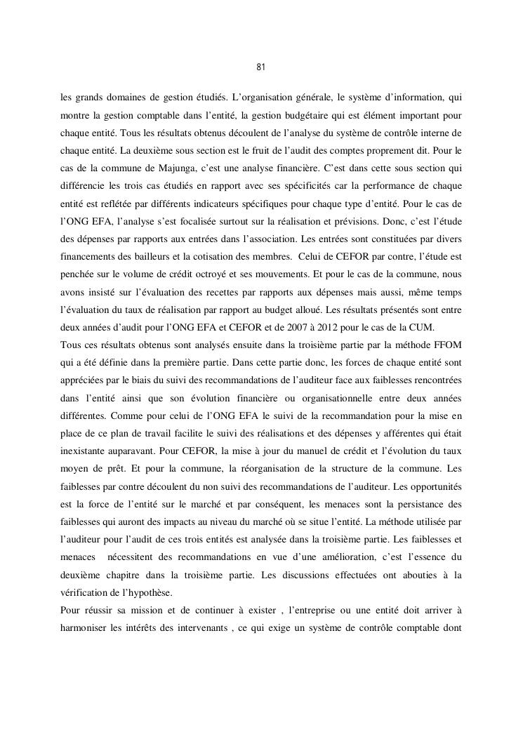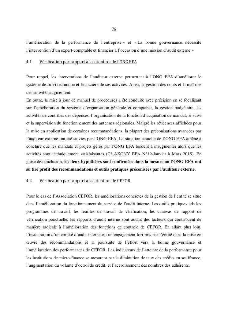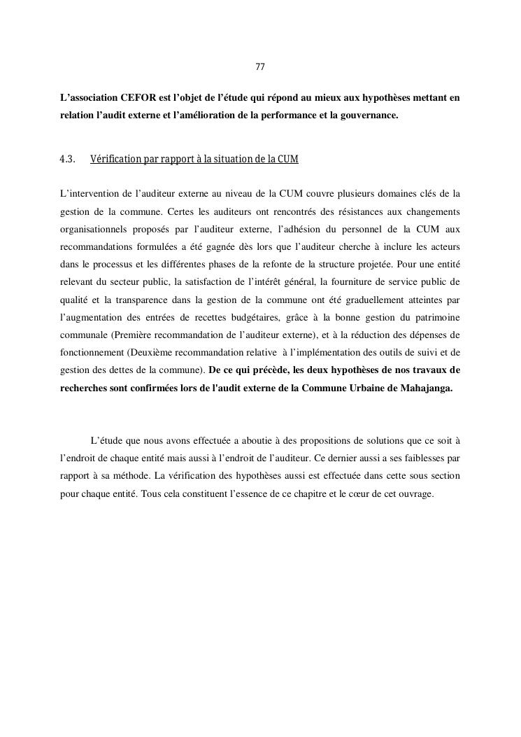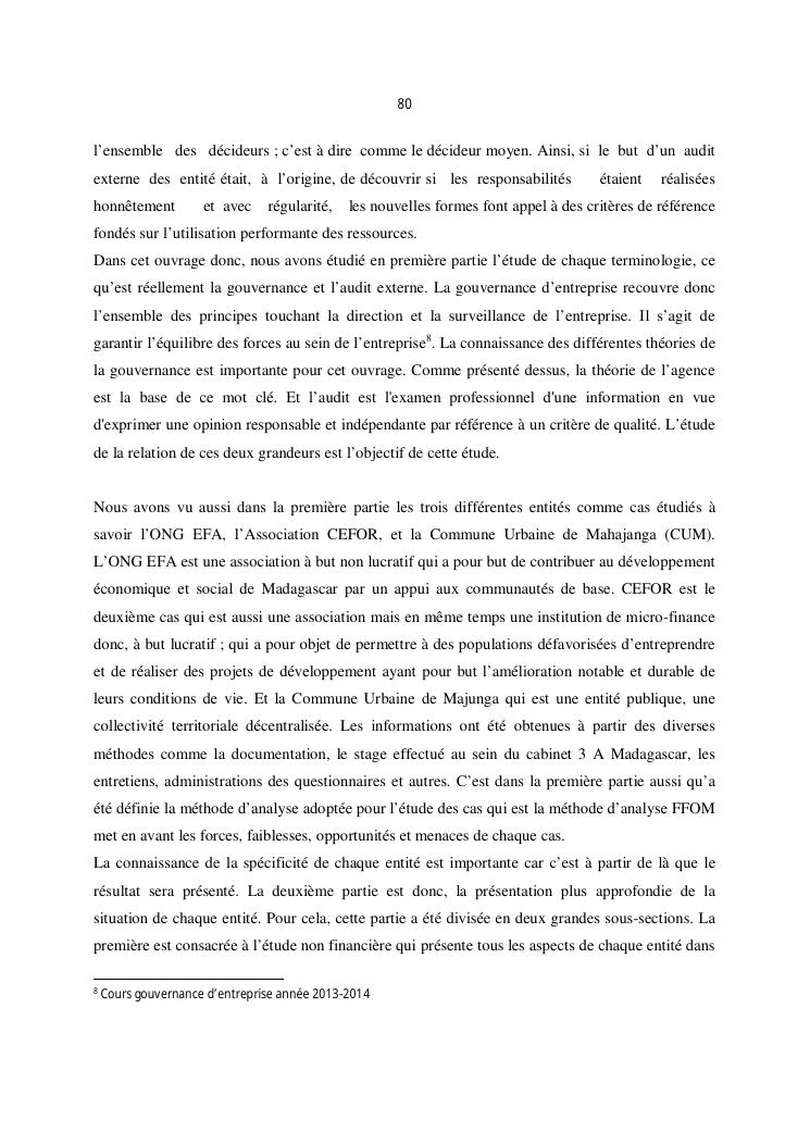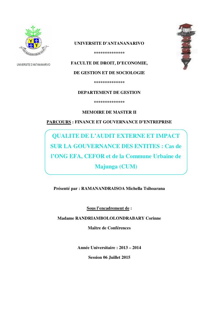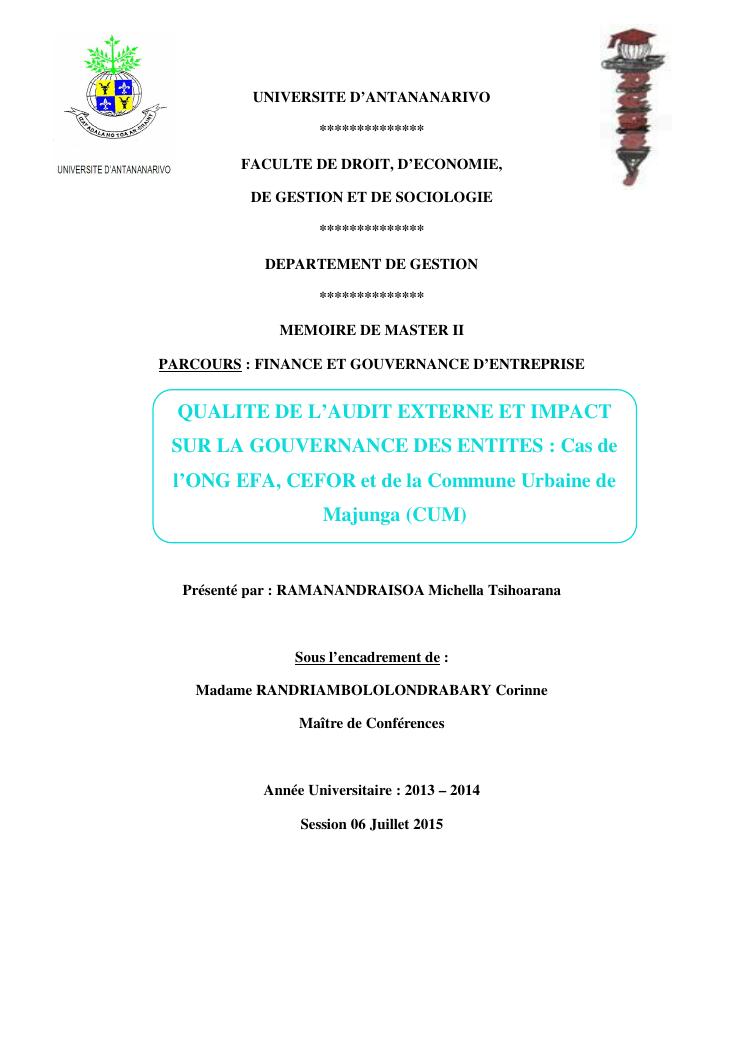 qualite de l'audit externe et impact sur la gouvernance des entites : cas de l'ong efa, cefor et de la commune urbaine de majunga (cum)