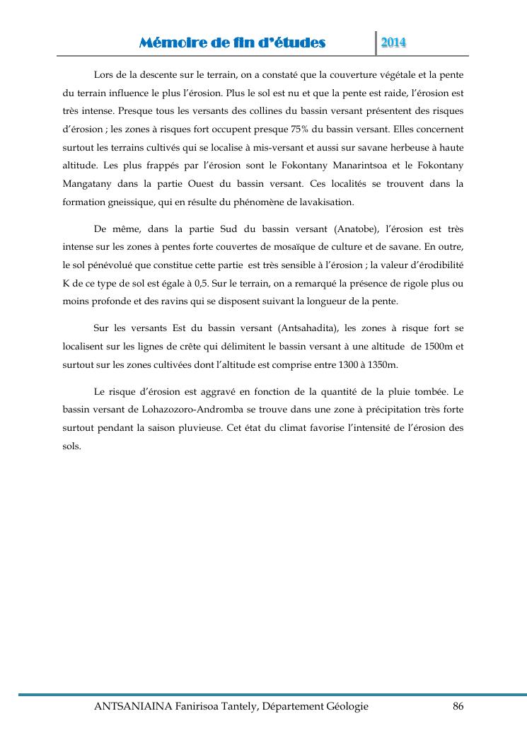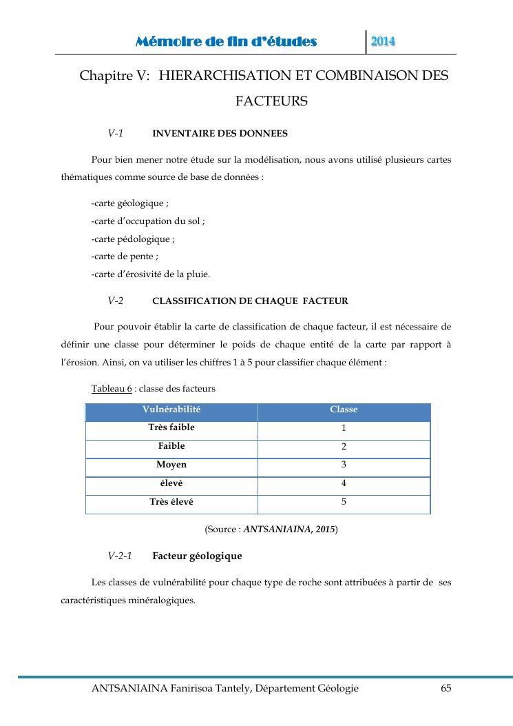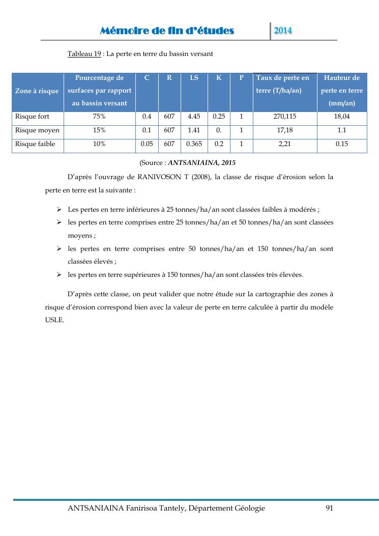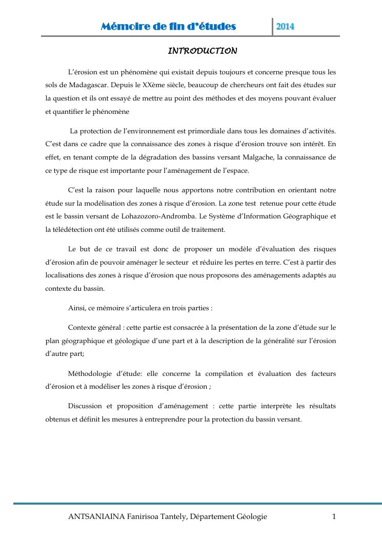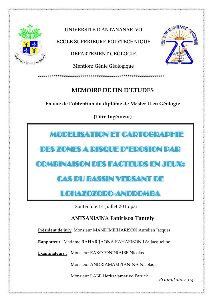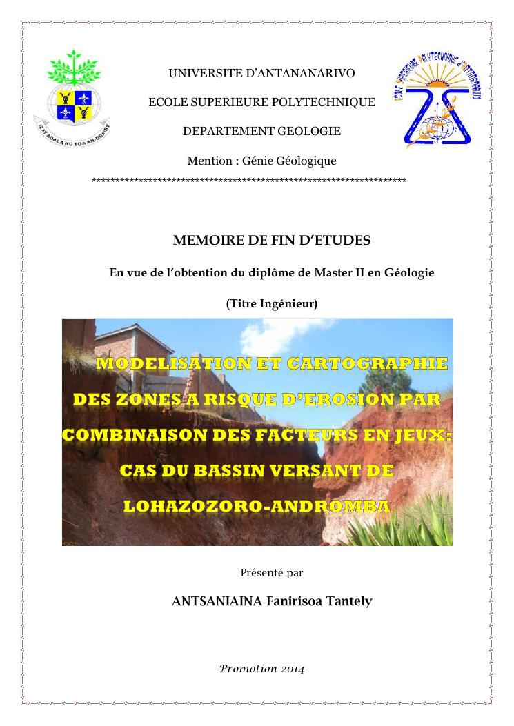 modelisation et cartographie des zones a risque d'erosion par combinaison des facteurs en jeux : cas du bassin versant de lohazozoro-andromba