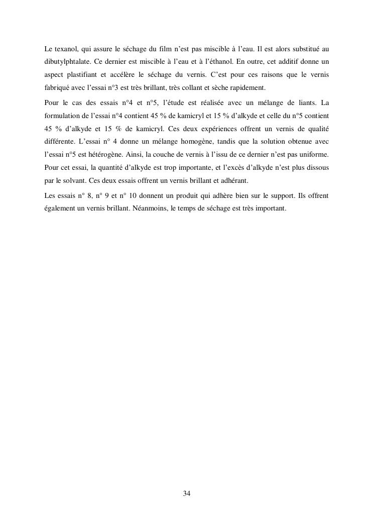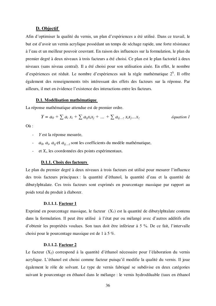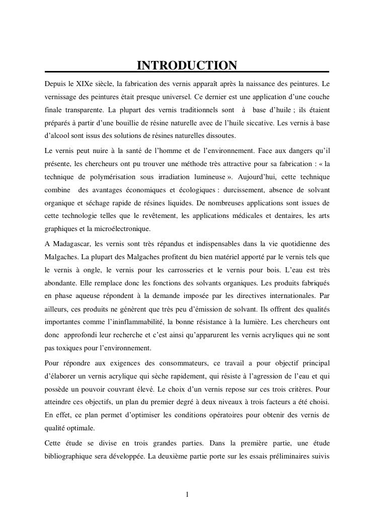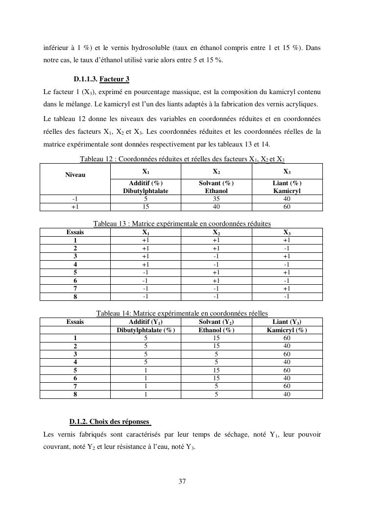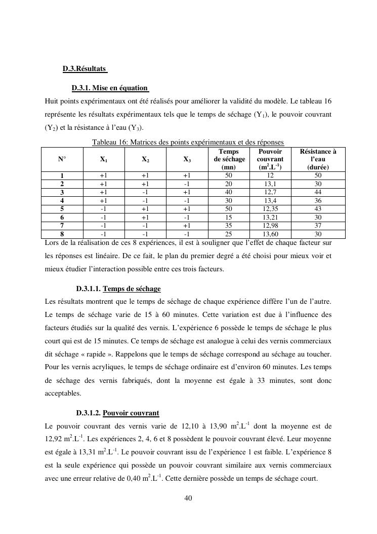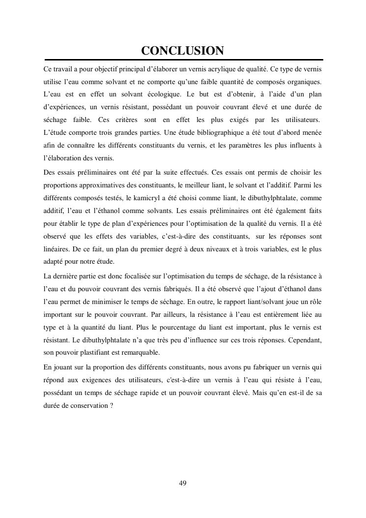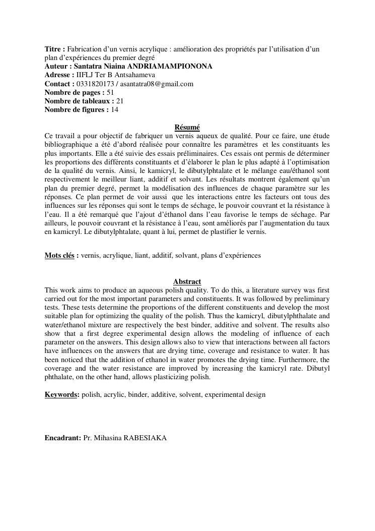 fabrication d'un vernis acrylique : amelioration des proprietes par l'utilisation d'un plan d'experiences du premier degre