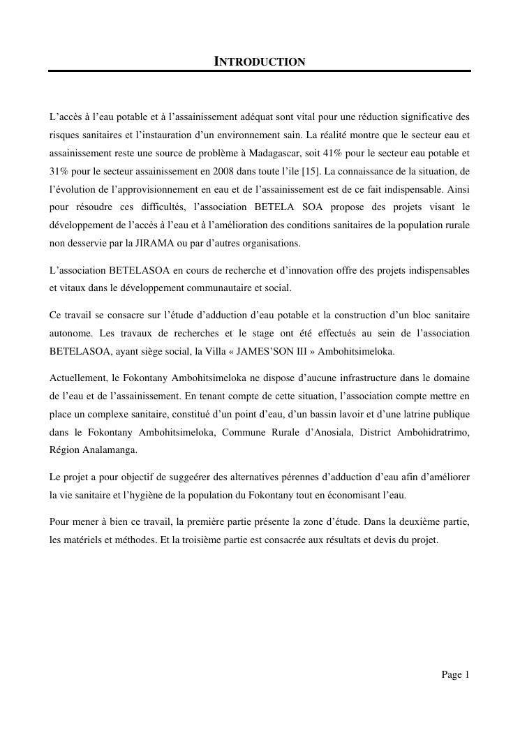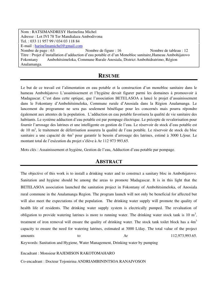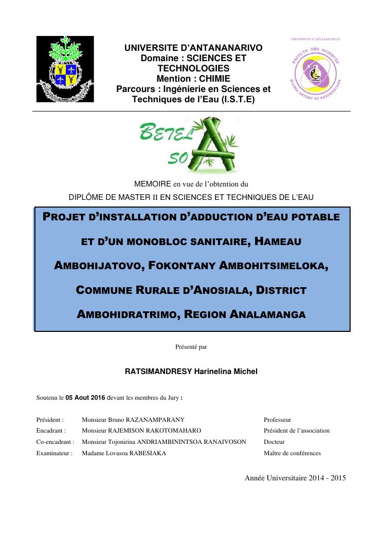 projet d'installation d'adduction d'eau potable et d'un monobloc sanitaire, hameau ambohijatovo, fokontany ambohitsimeloka, commune rurale d'anosiala, district ambohidratrimo, region analamanga