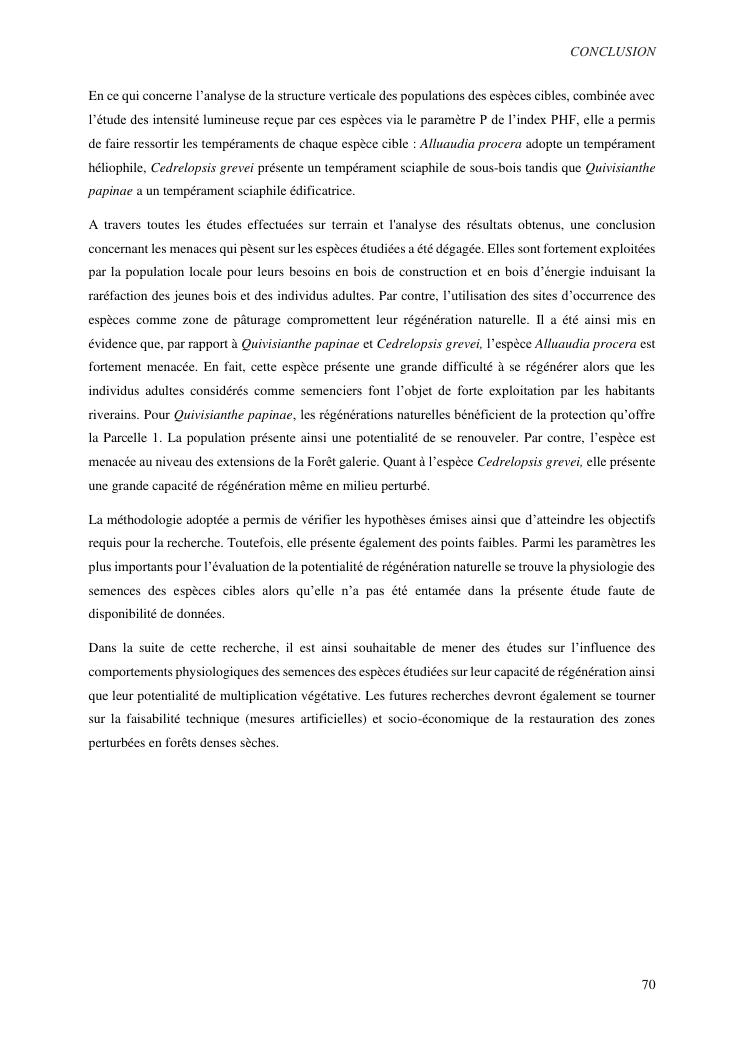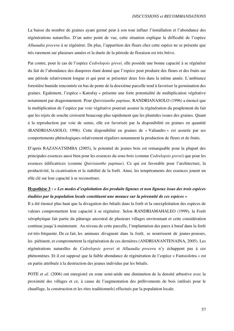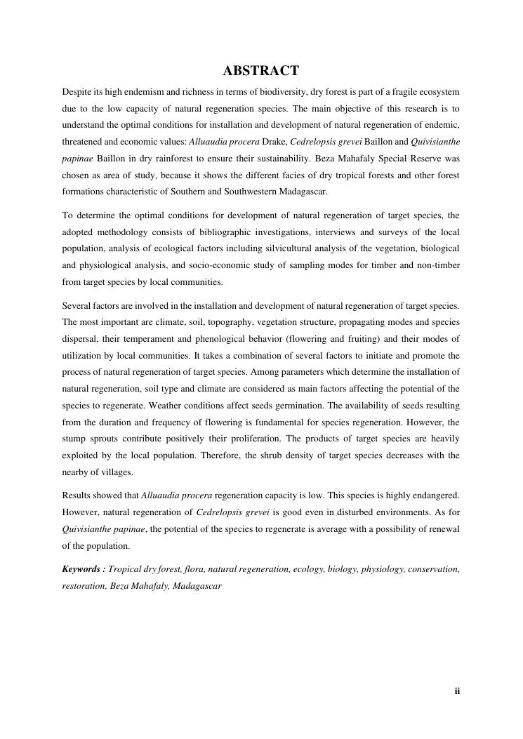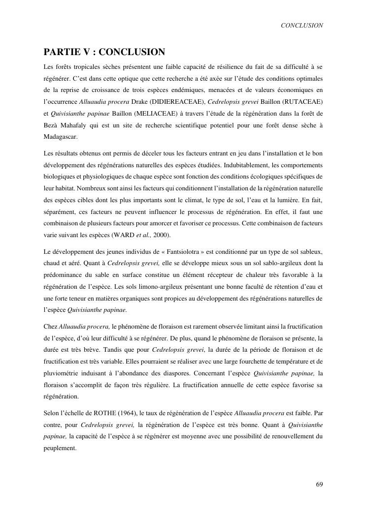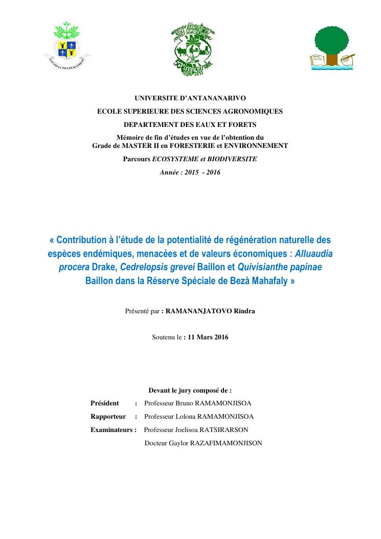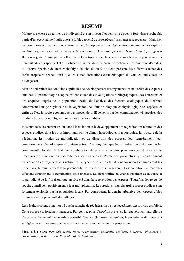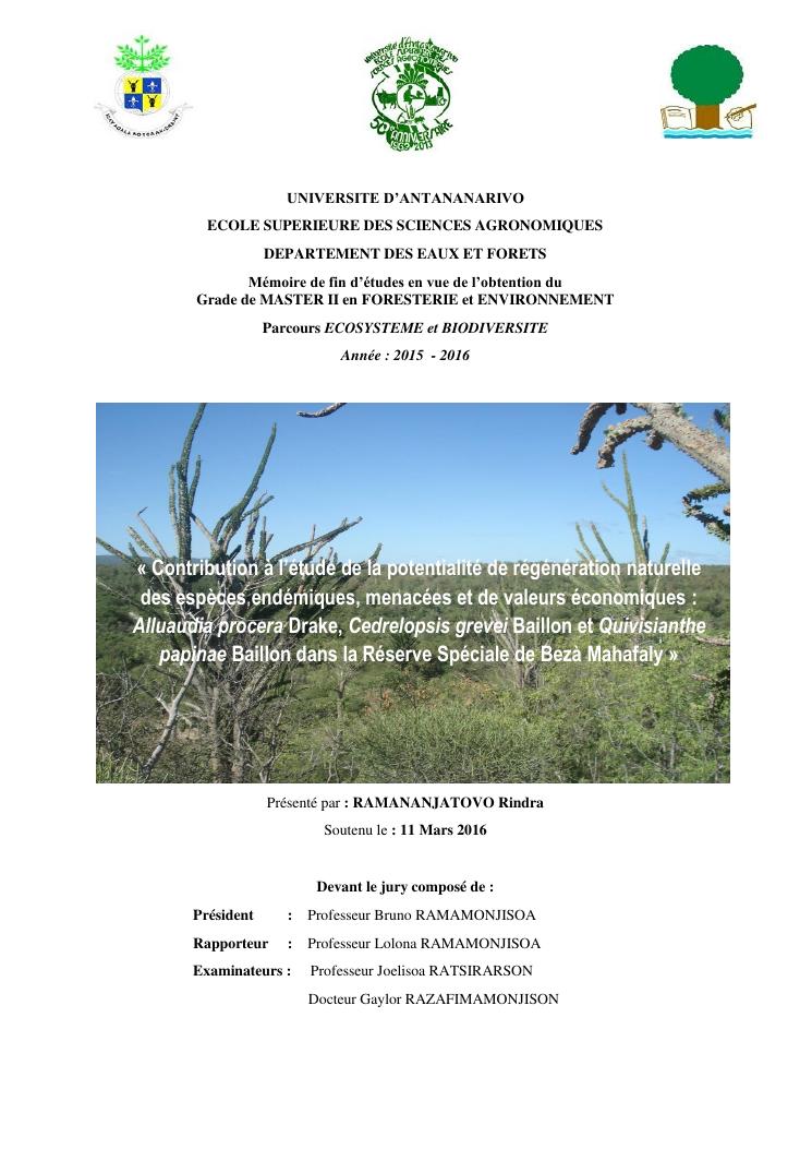contribution à l'étude de la potentialité de régénération naturelle des espèces endémiques, menacées et de valeurs économiques : alluaudia procera drake, cedrelopsis grevei baillon et quivisianthe papinae baillon dans la réserve spéciale de bezà mahafaly