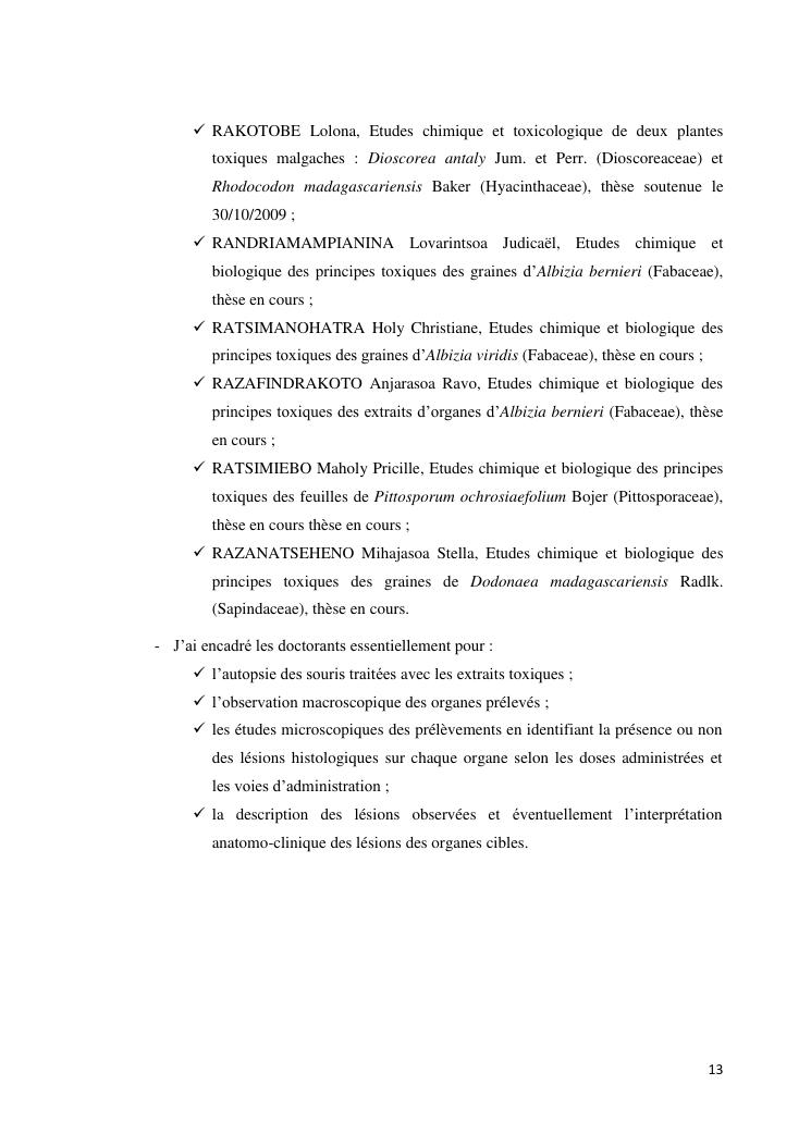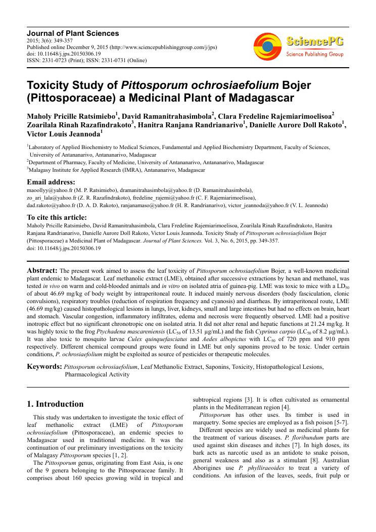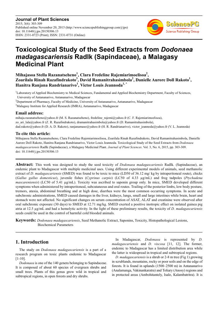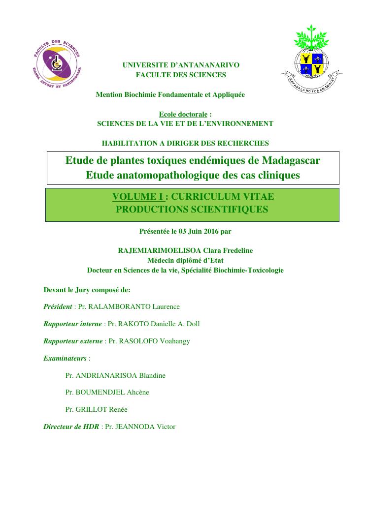 etude de plantes toxiques endémiques de madagascar etude anatomopathologique des cas cliniques. volume i : curriculum vitae productions scientifiques
