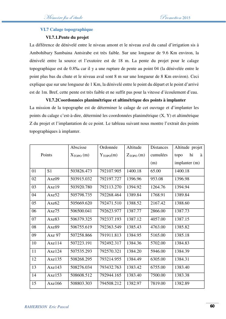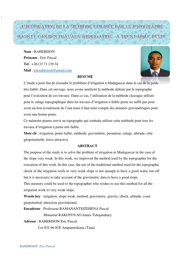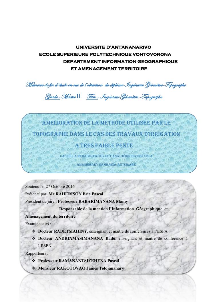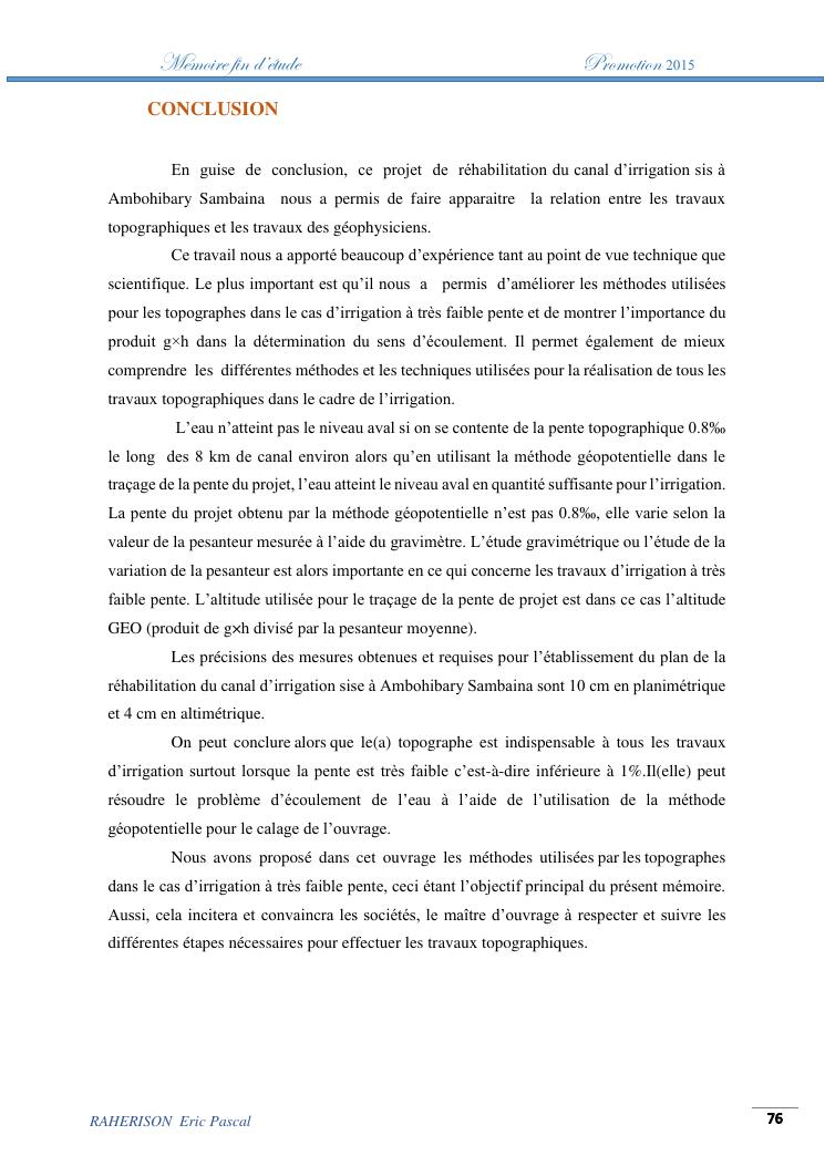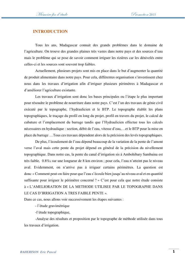 amelioration de la methode utilisee par le topographe dans le cas des travaux d'irrigation a tres faible pente : cas de la rehabilitation du canal d'irrigation sis a ambohibary sambaina antsirabe