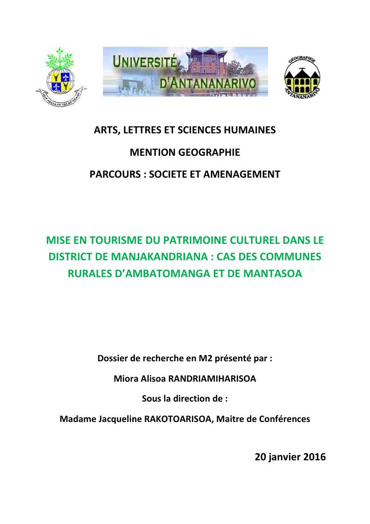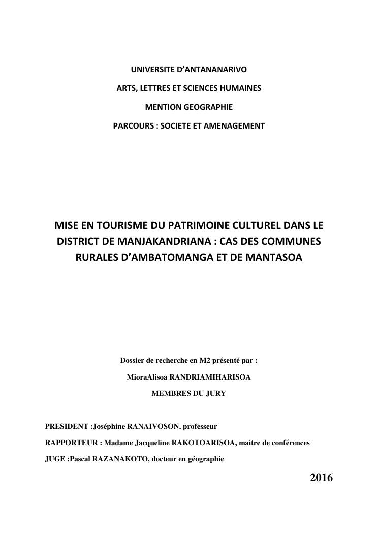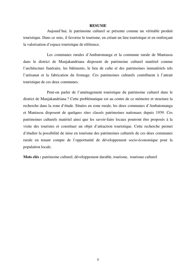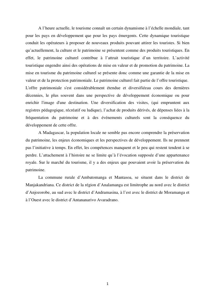 mise en tourisme du patrimoine culturel dans le district de manjakandriana : cas des communes rurales d'ambatomanga et de mantasoa