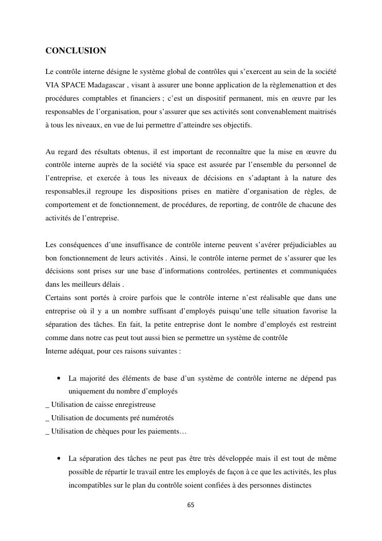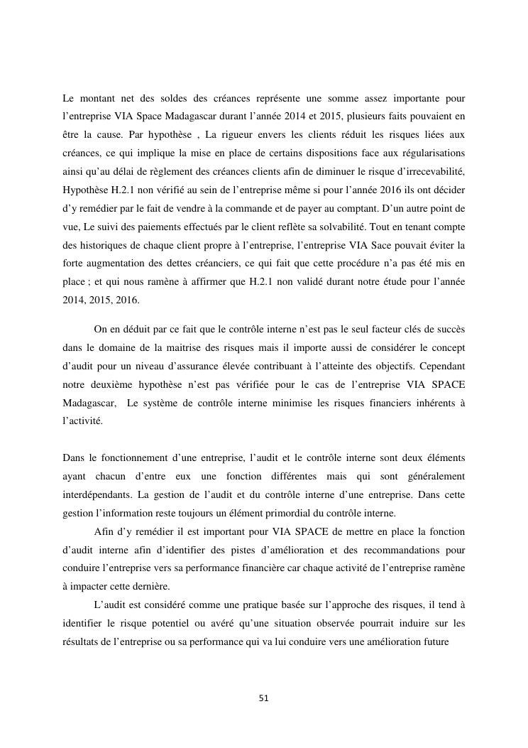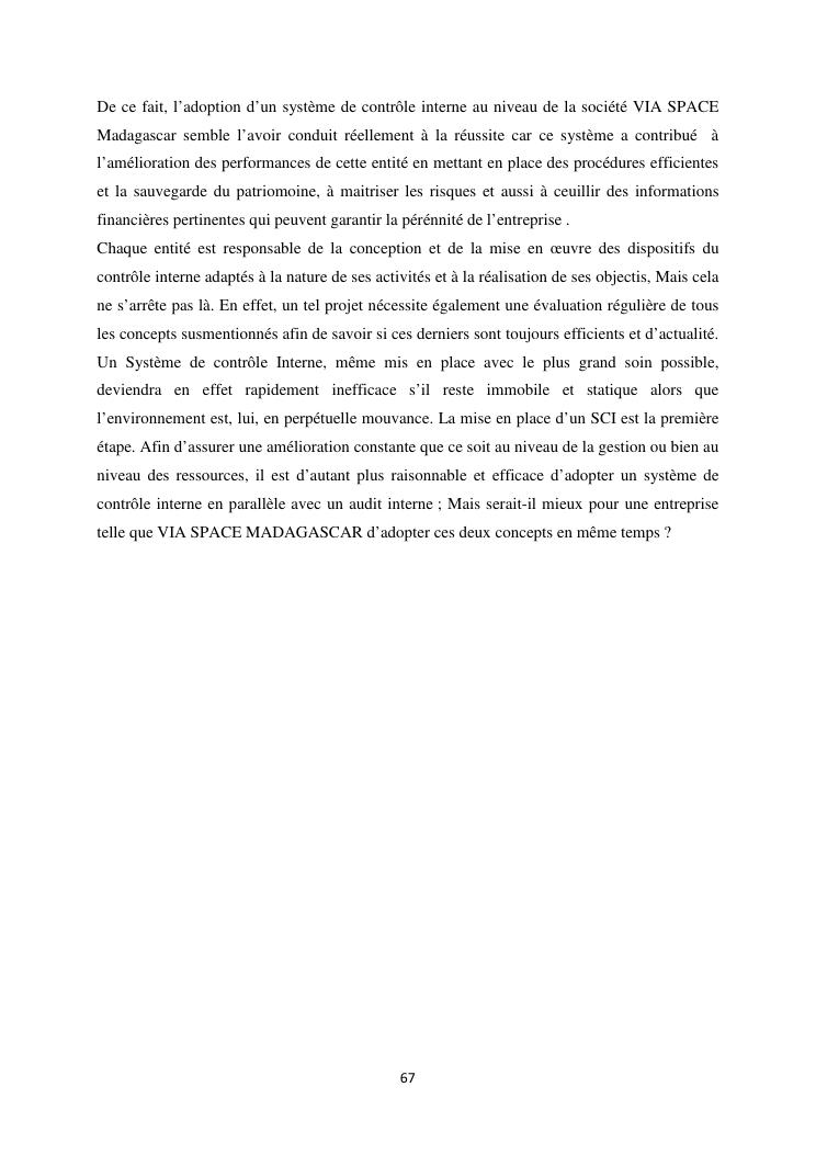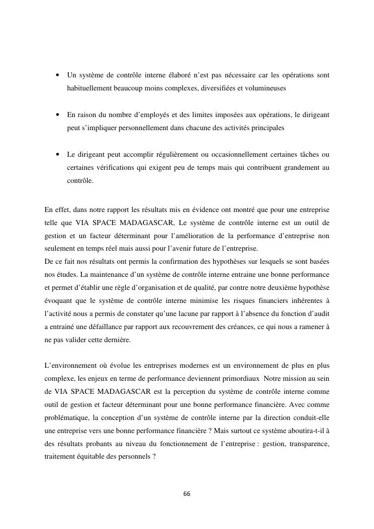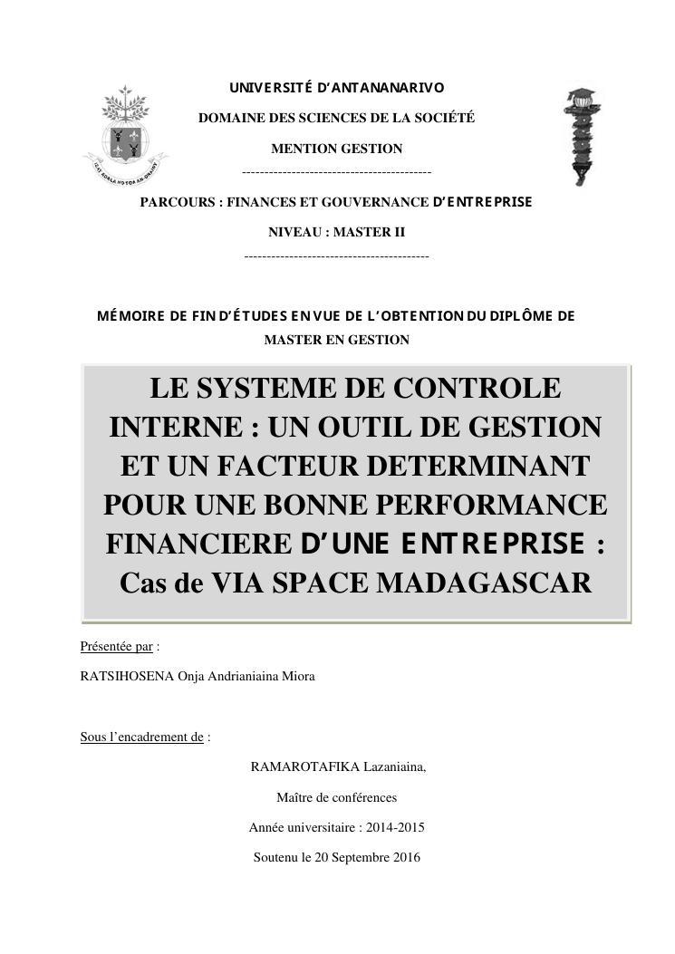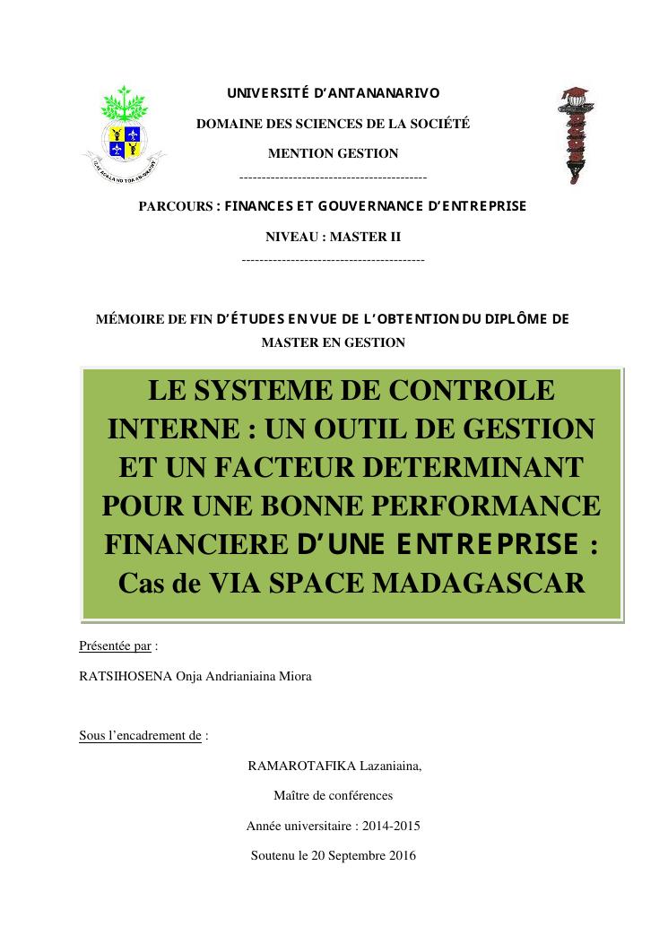 le systeme de controle interne : un outil de gestion et un facteur determinant pour une bonne performance financiere d'une entreprise : cas de via space madagascar