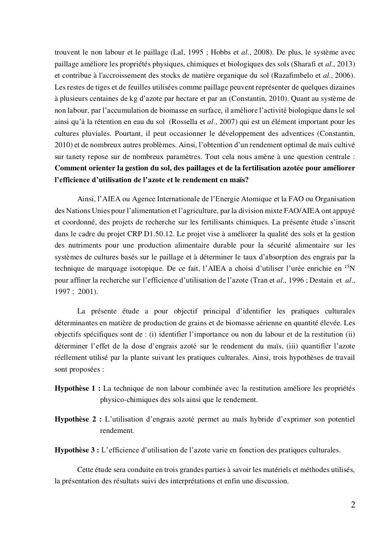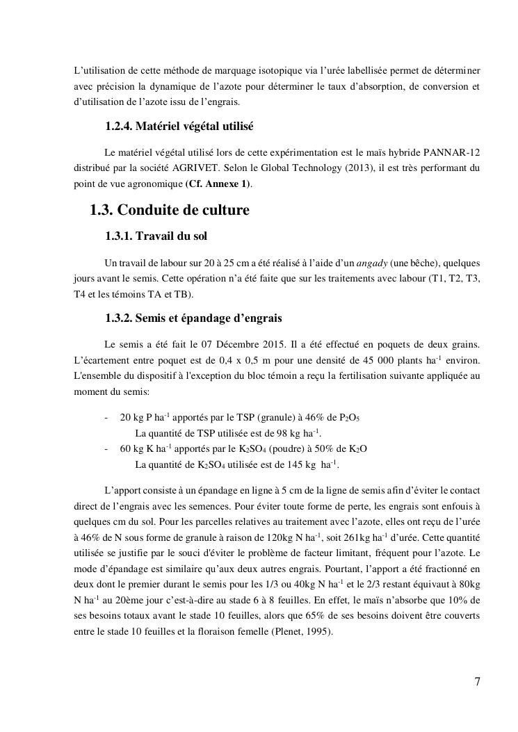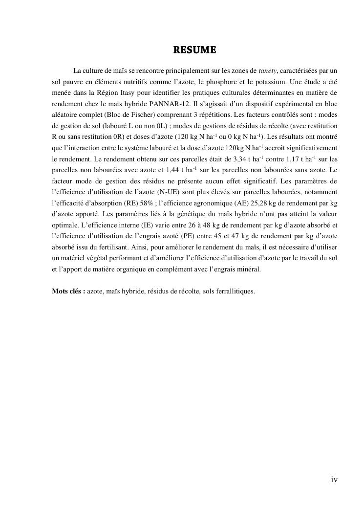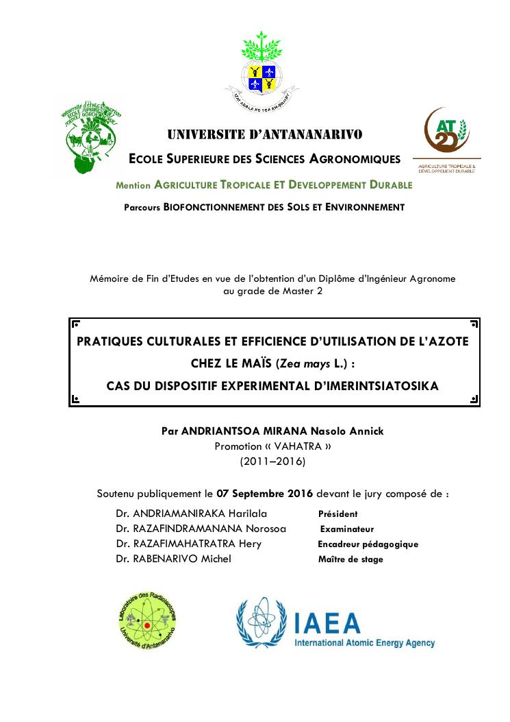 pratiques culturales et efficience d'utilisation de l'azote chez le maïs (zea mays l.) : cas du dispositif experimental d'imerintsiatosika