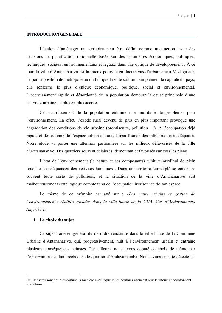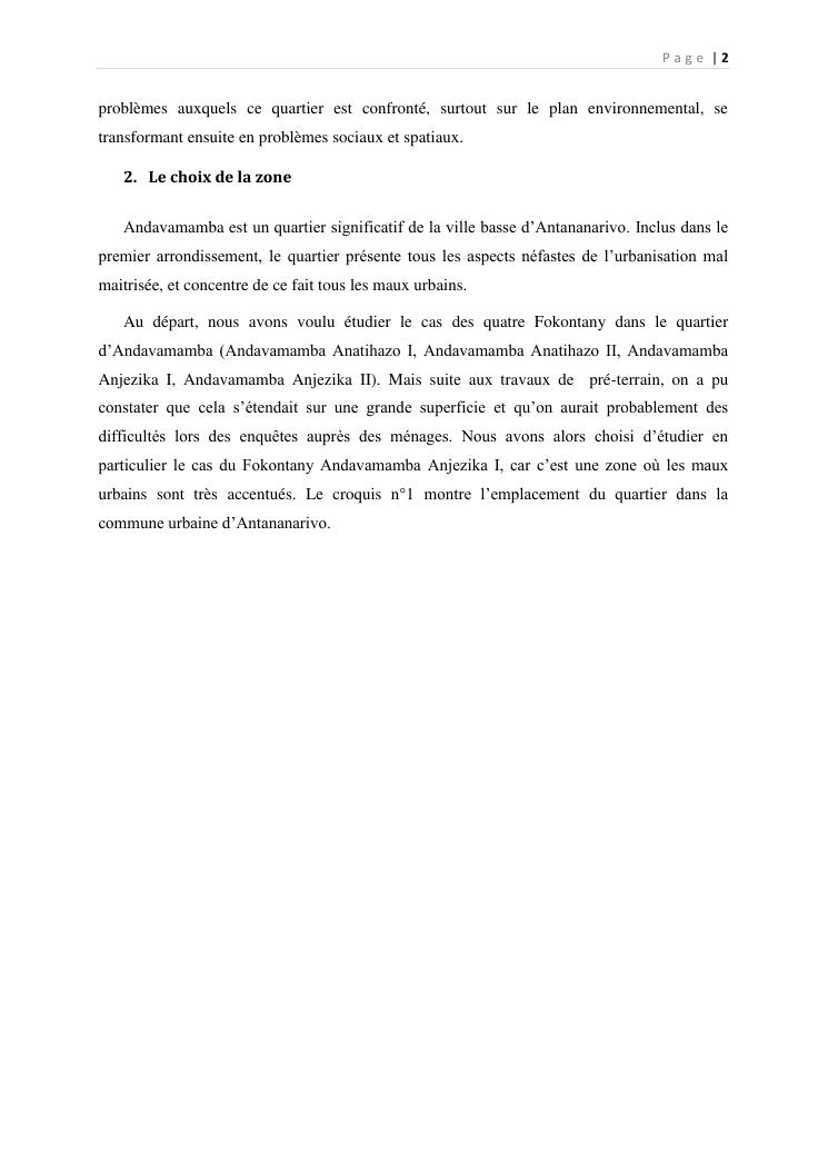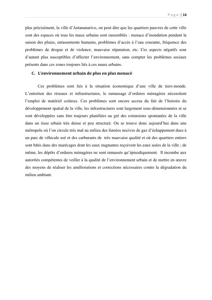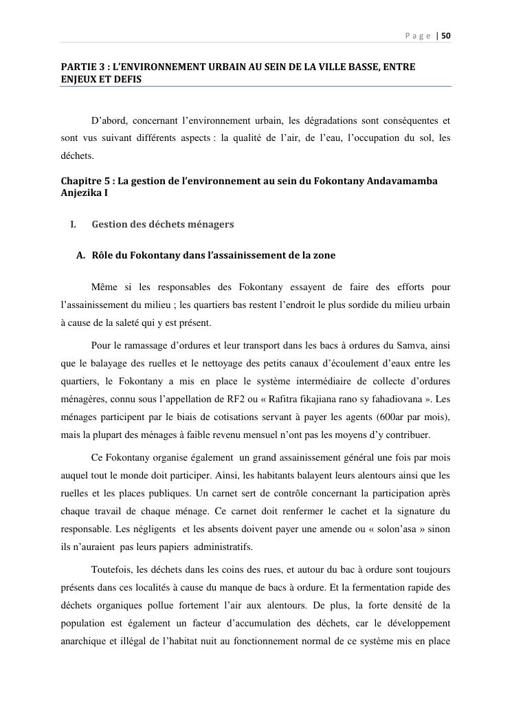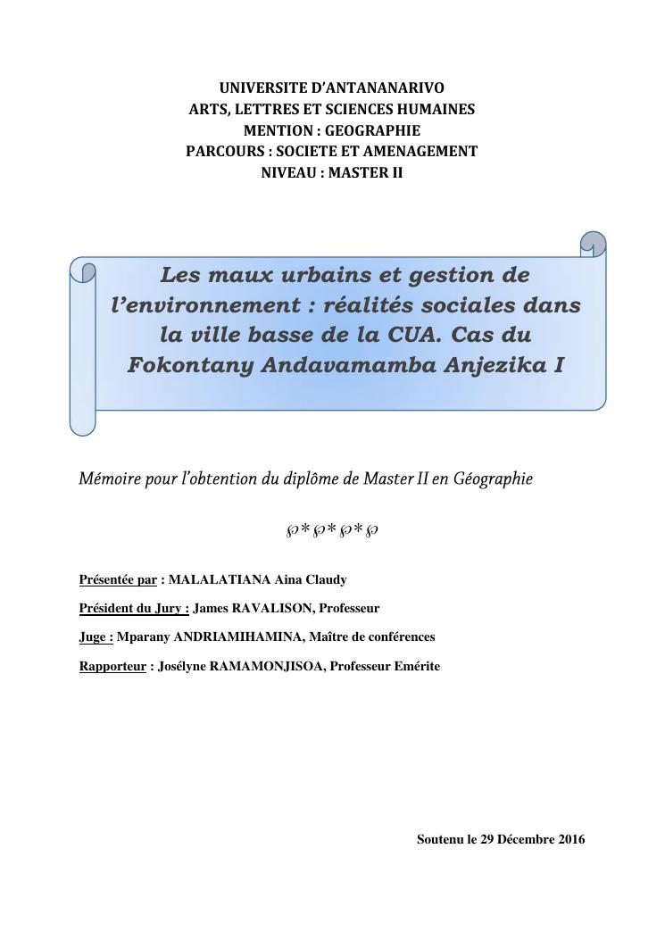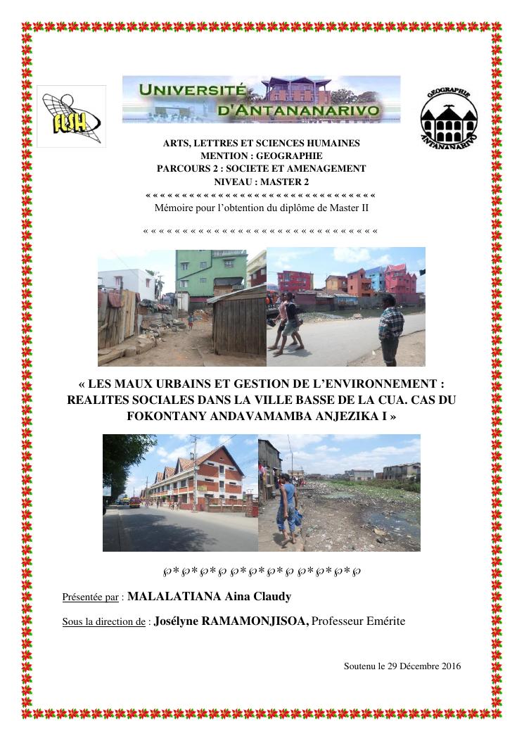 « les maux urbains et gestion de l'environnement : realites sociales dans la ville basse de la cua. cas du fokontany andavamamba anjezika i »