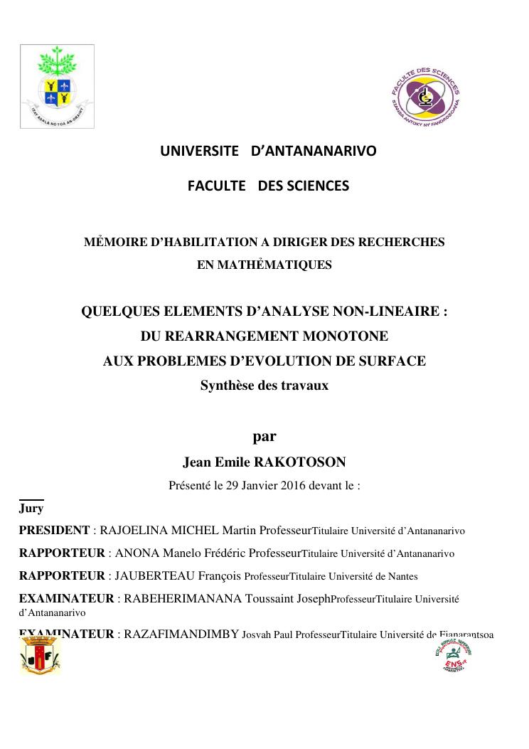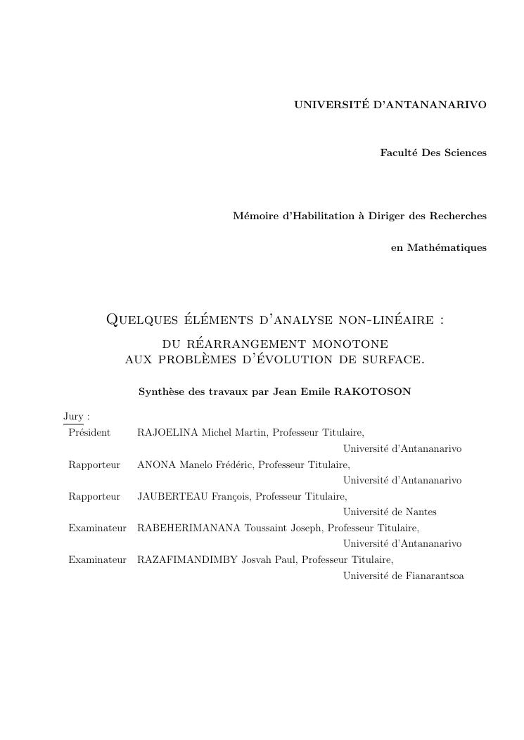 quelques elements d'analyse non-lineaire : du rearrangement monotone aux problemes d'evolution de surface. volume 2 : synthèse des travaux