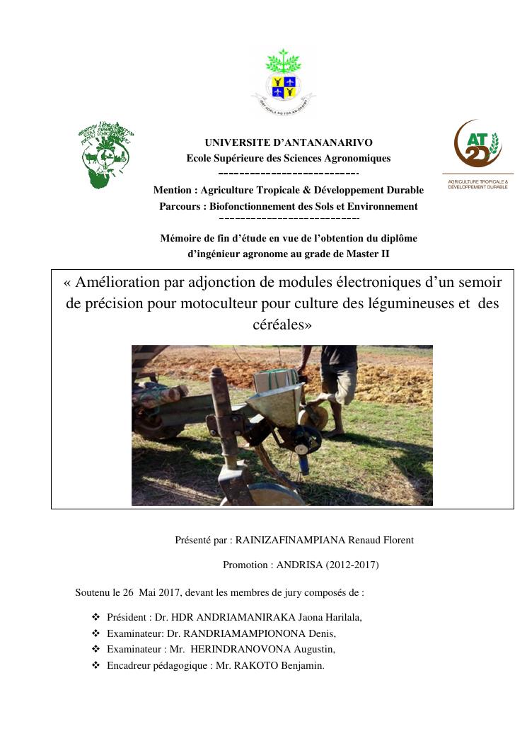 « amélioration par adjonction de modules électroniques d'un semoir de précision pour motoculteur pour culture des légumineuses et des céréales»