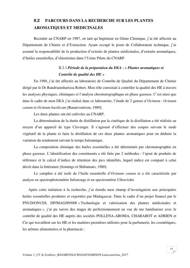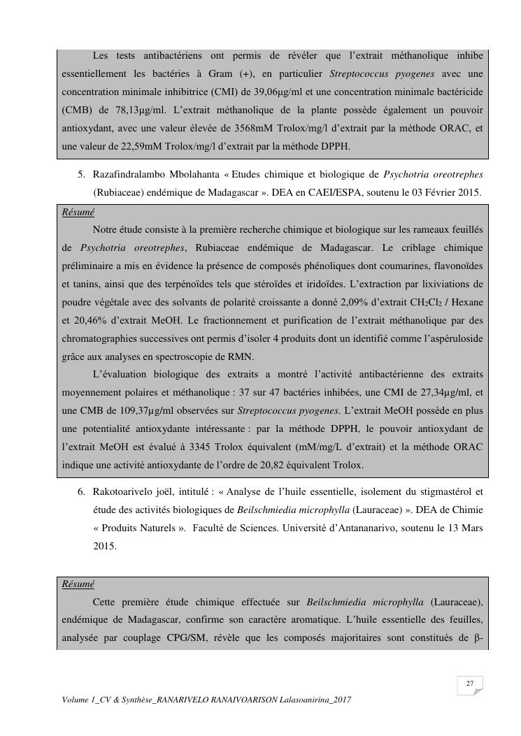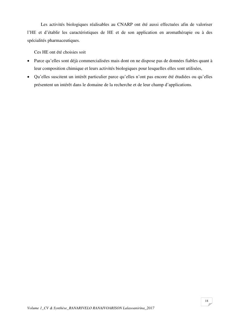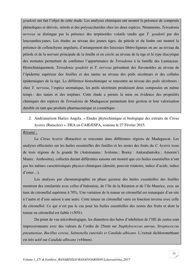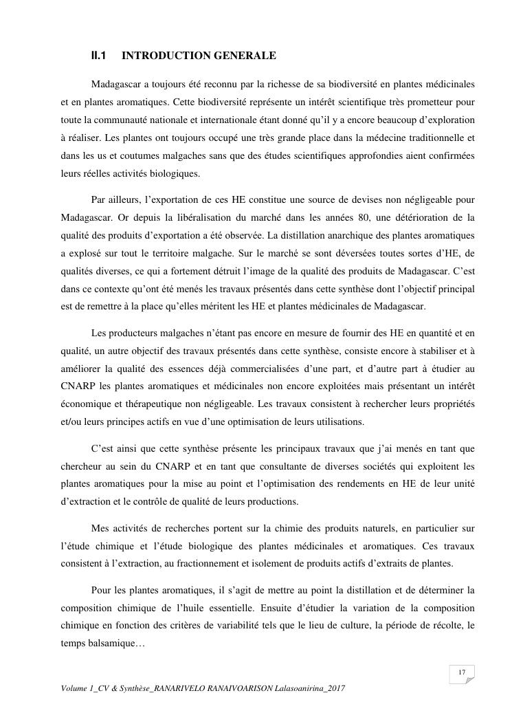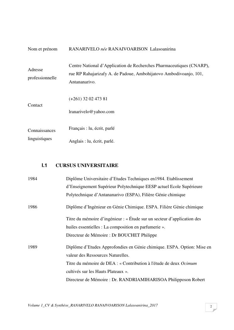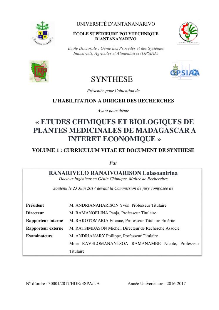 etudes chimiques et biologiques de plantes médicinales de madagascar à intérêt économique. volume 1 : curriculum vitae et document de synthese
