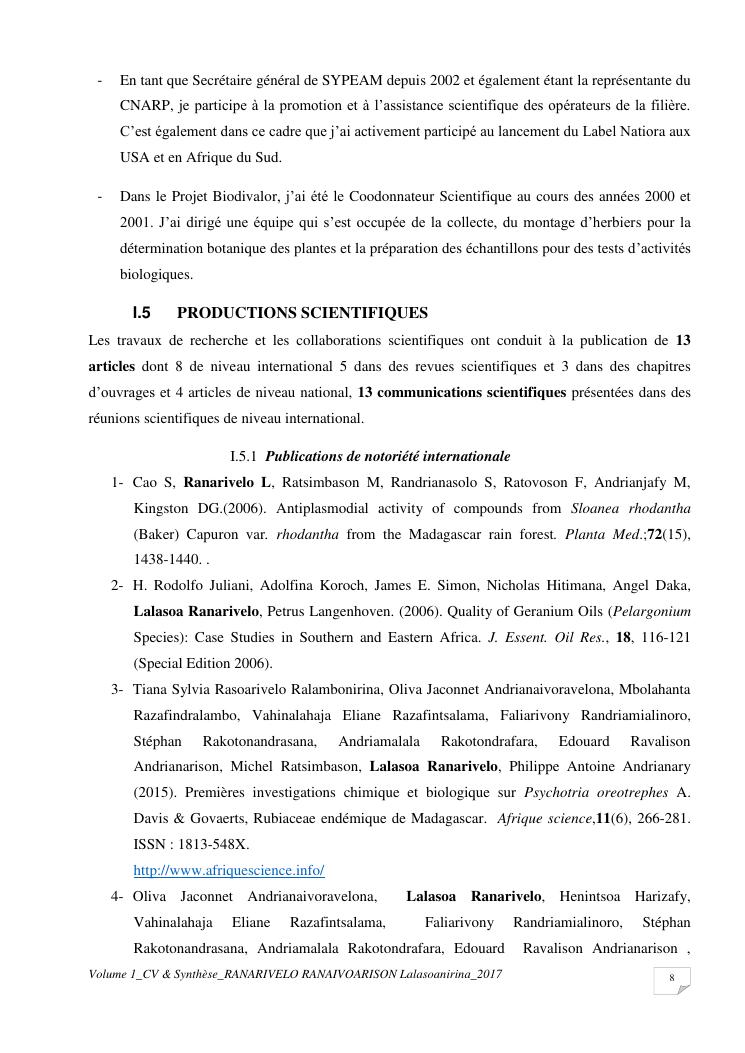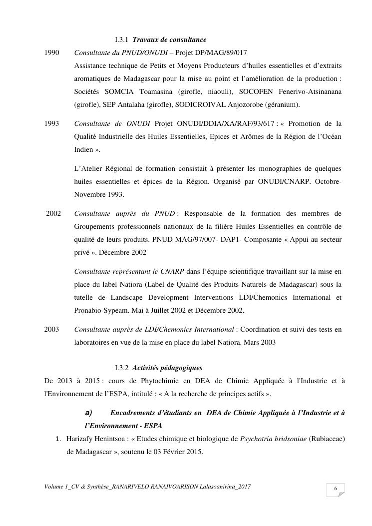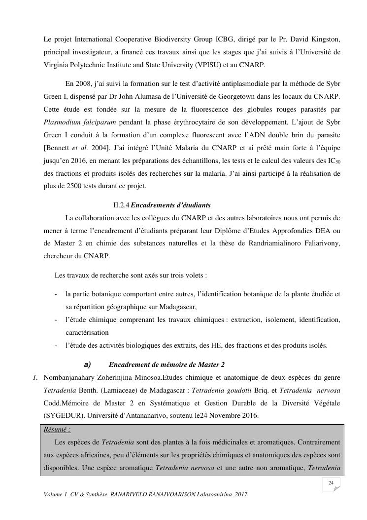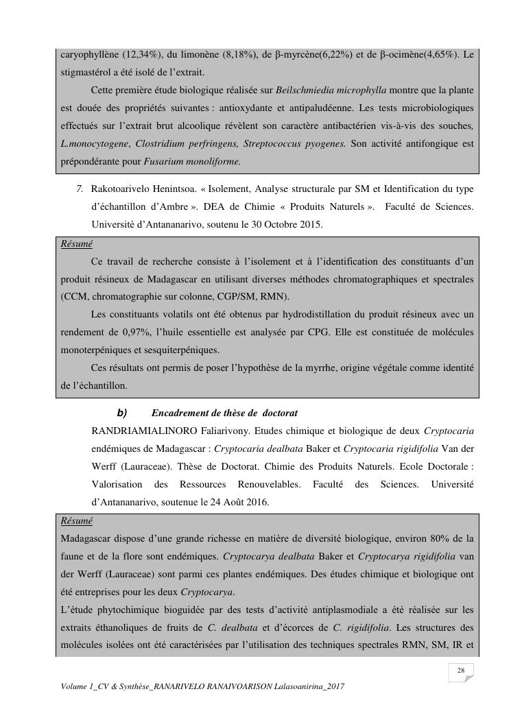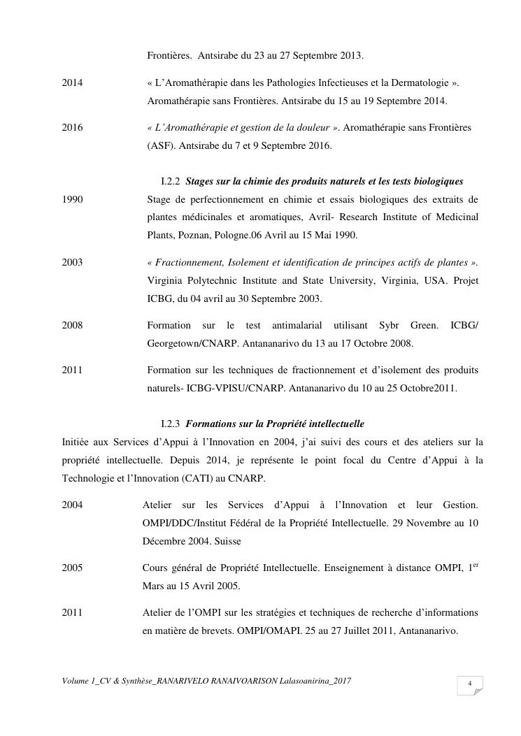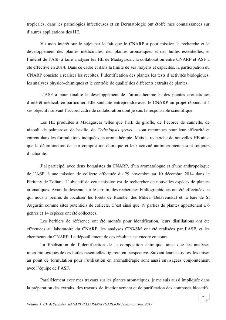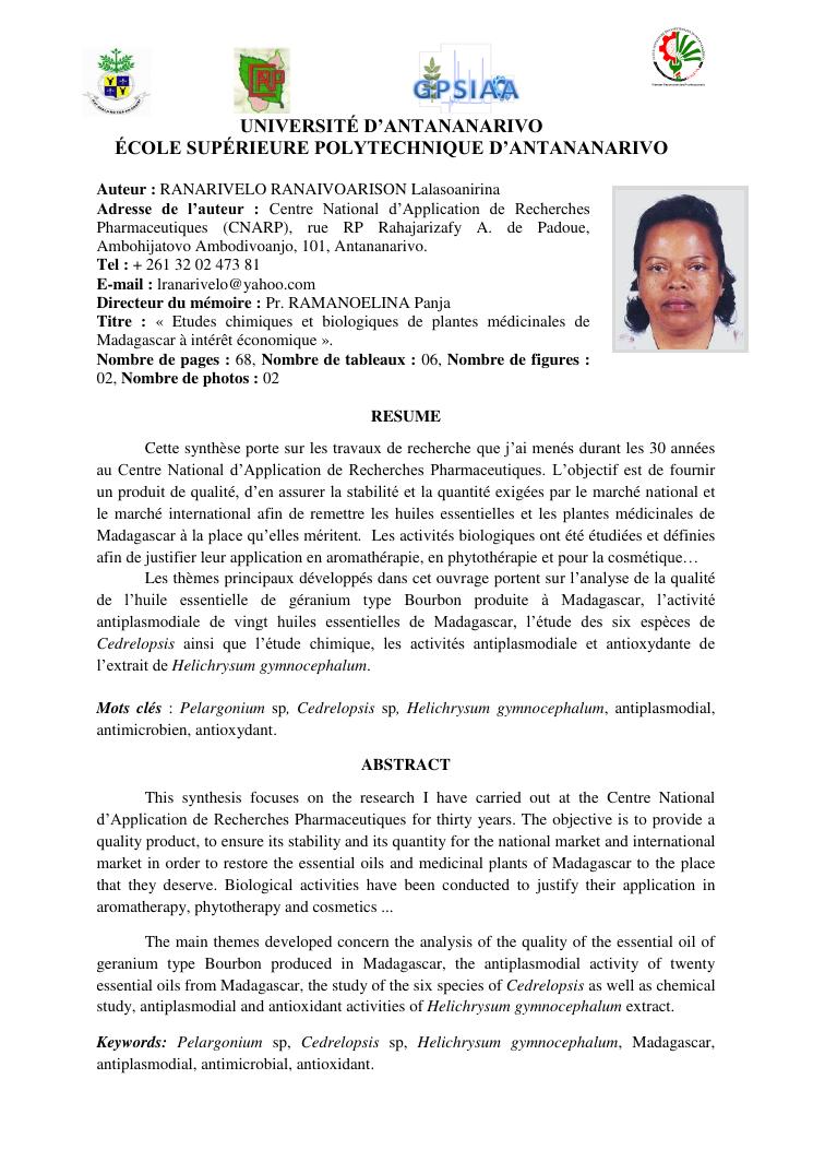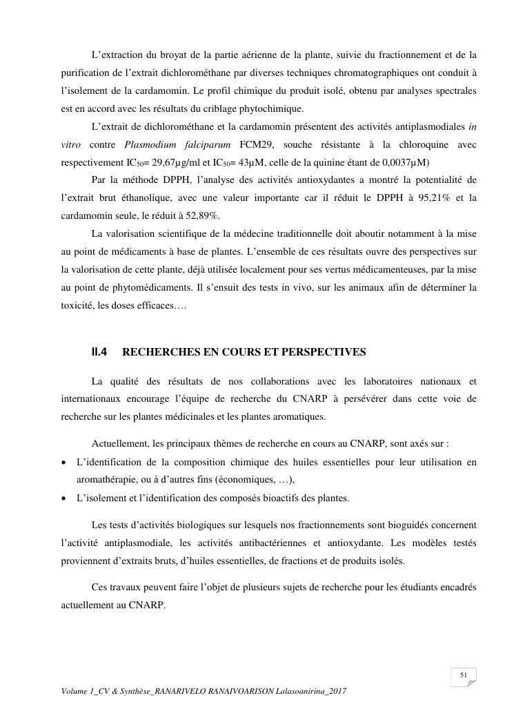 etudes chimiques et biologiques de plantes médicinales de madagascar à intérêt économique. volume 1 : curriculum vitae et document de synthese