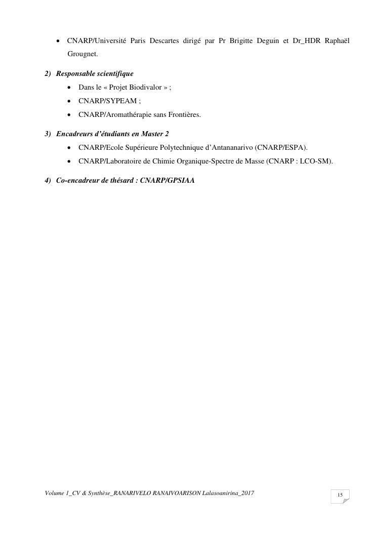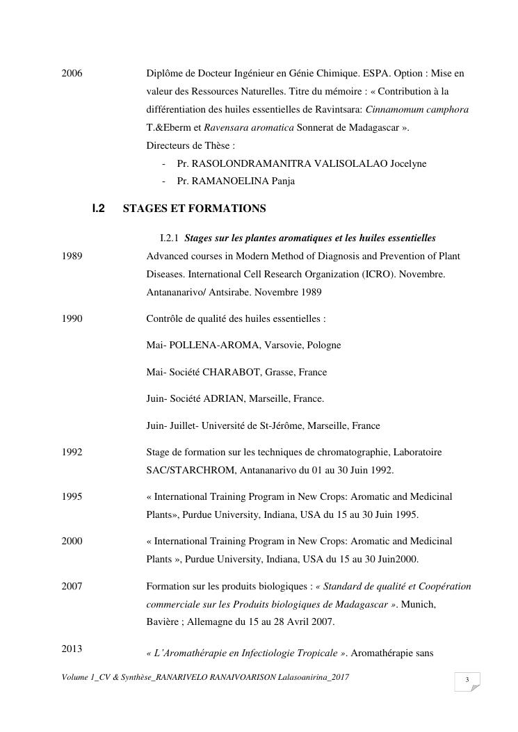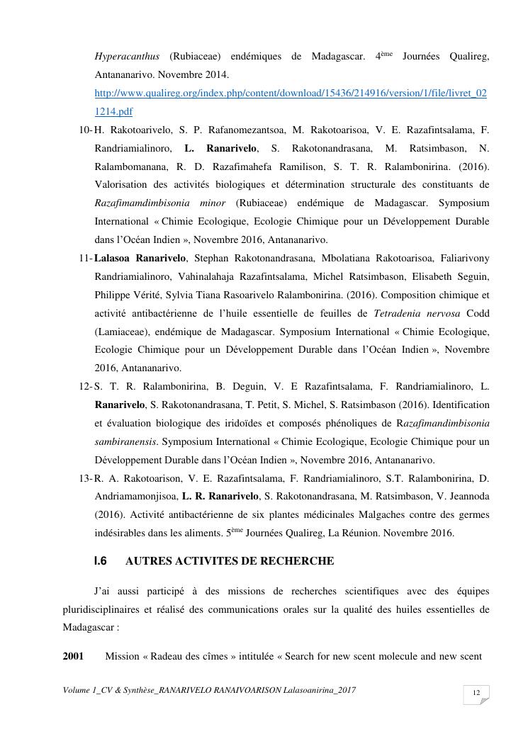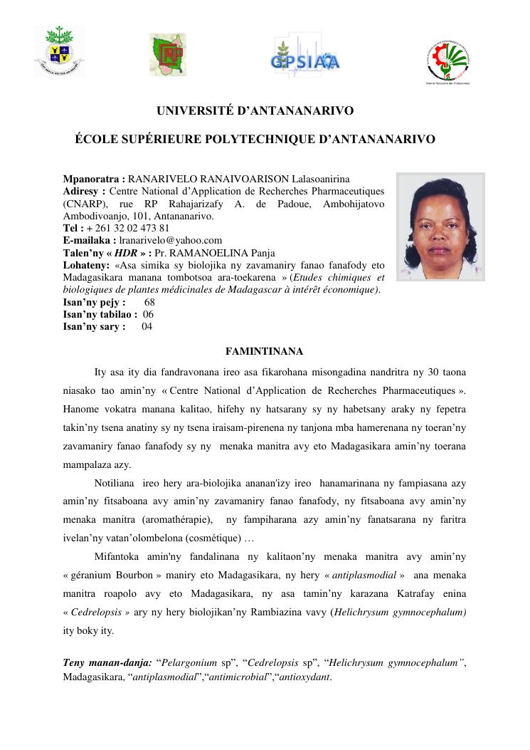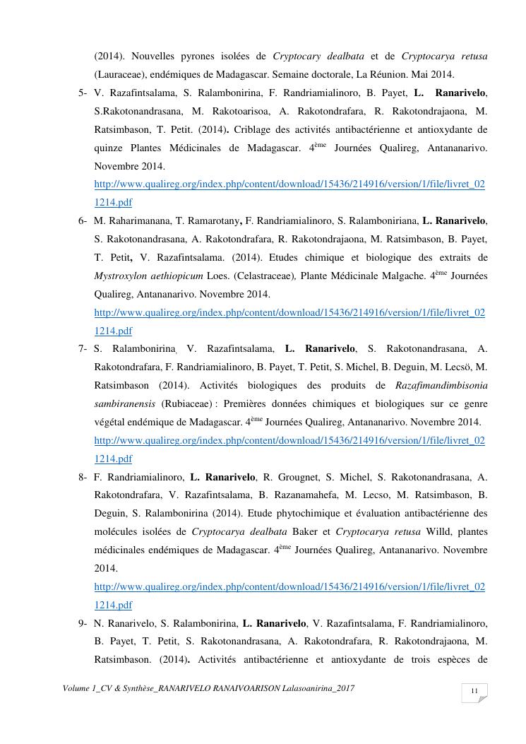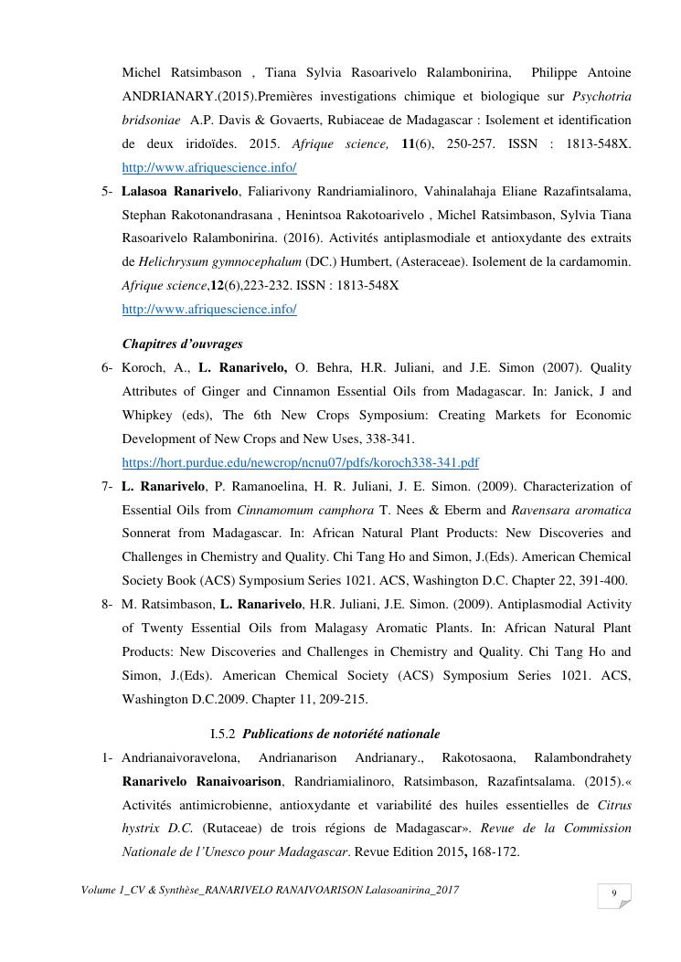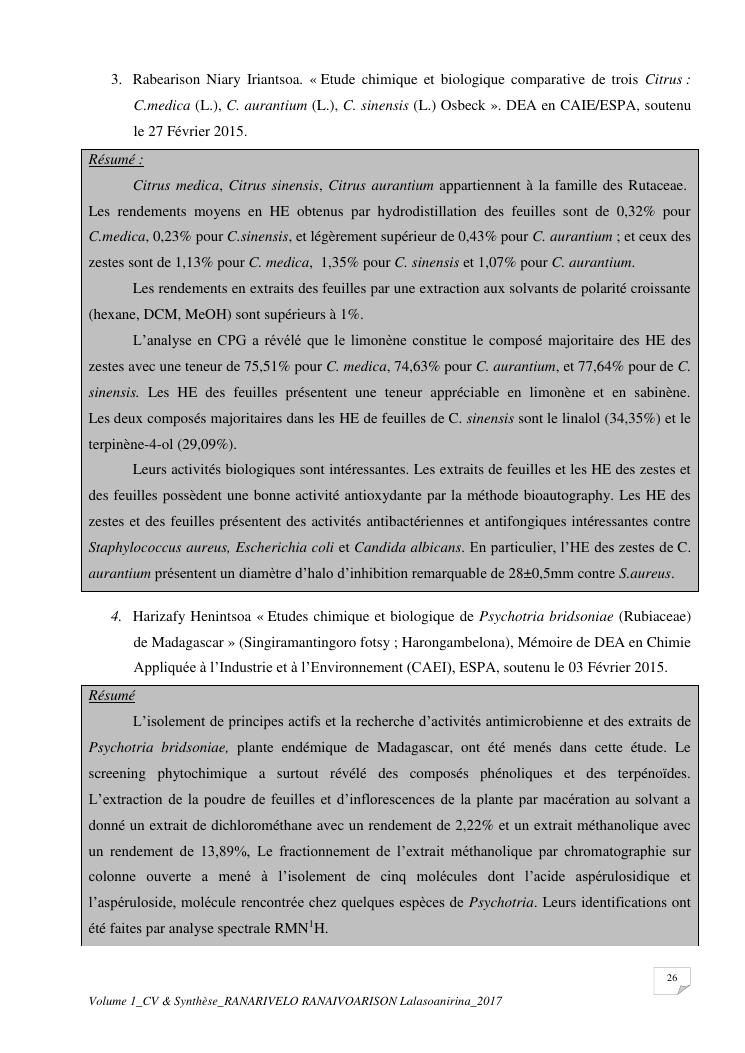 etudes chimiques et biologiques de plantes médicinales de madagascar à intérêt économique. volume 1 : curriculum vitae et document de synthese