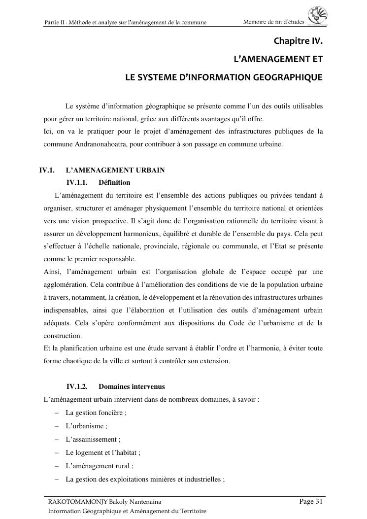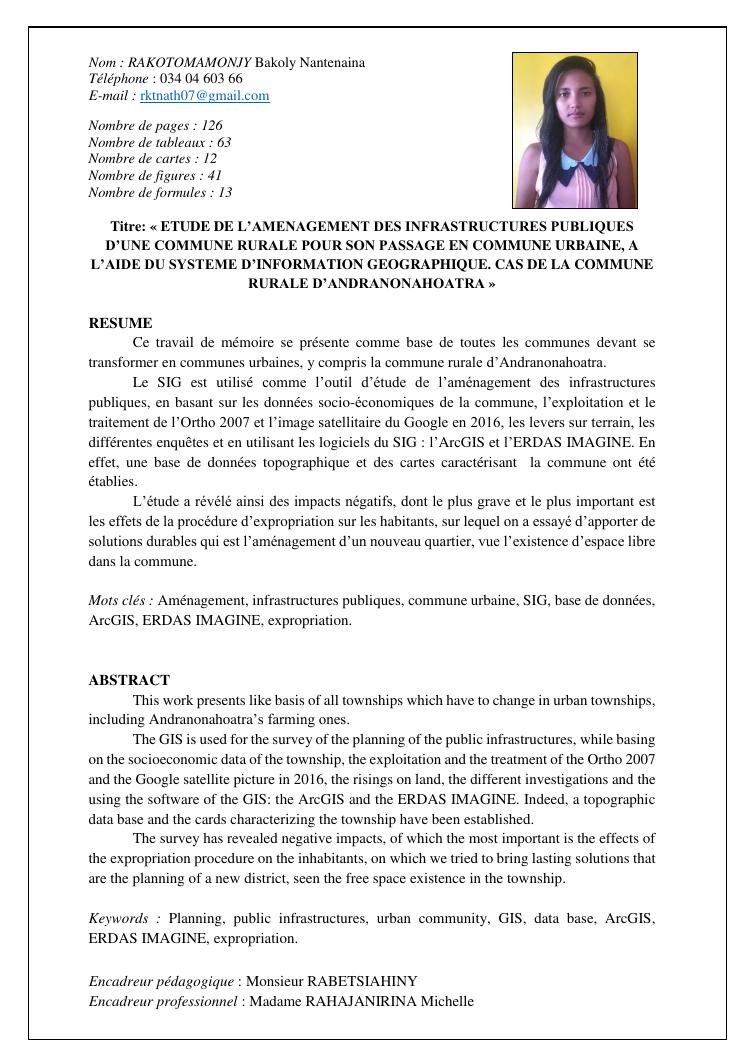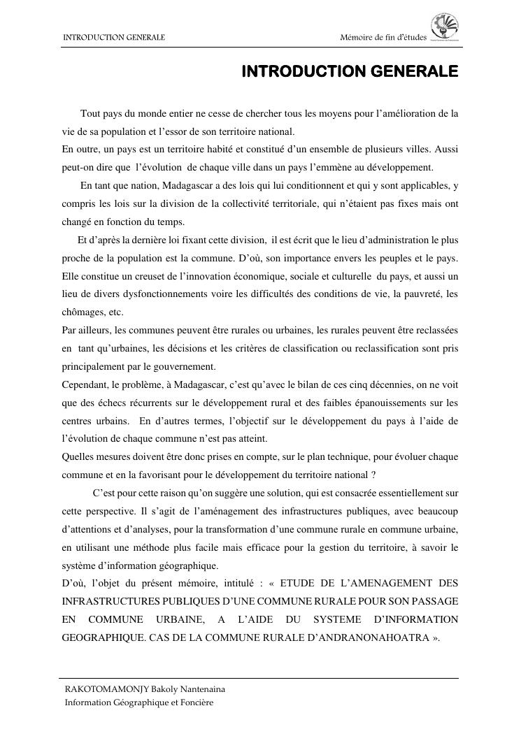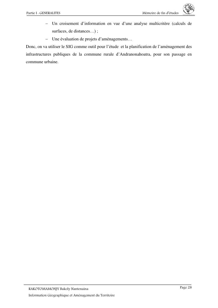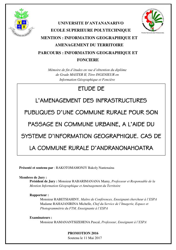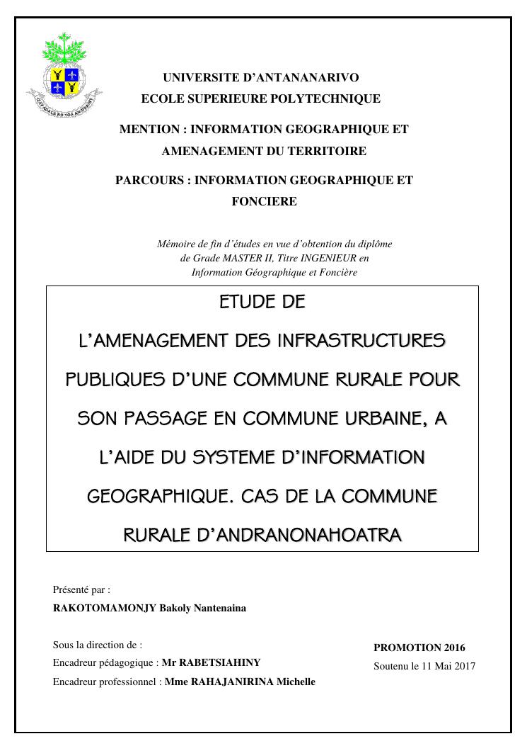 etude de l'amenagement des infrastructures publiques d'une commune rurale pour son passage en commune urbaine, a l'aide du systeme d'information geographique. cas de la commune rurale d'andranonahoatra