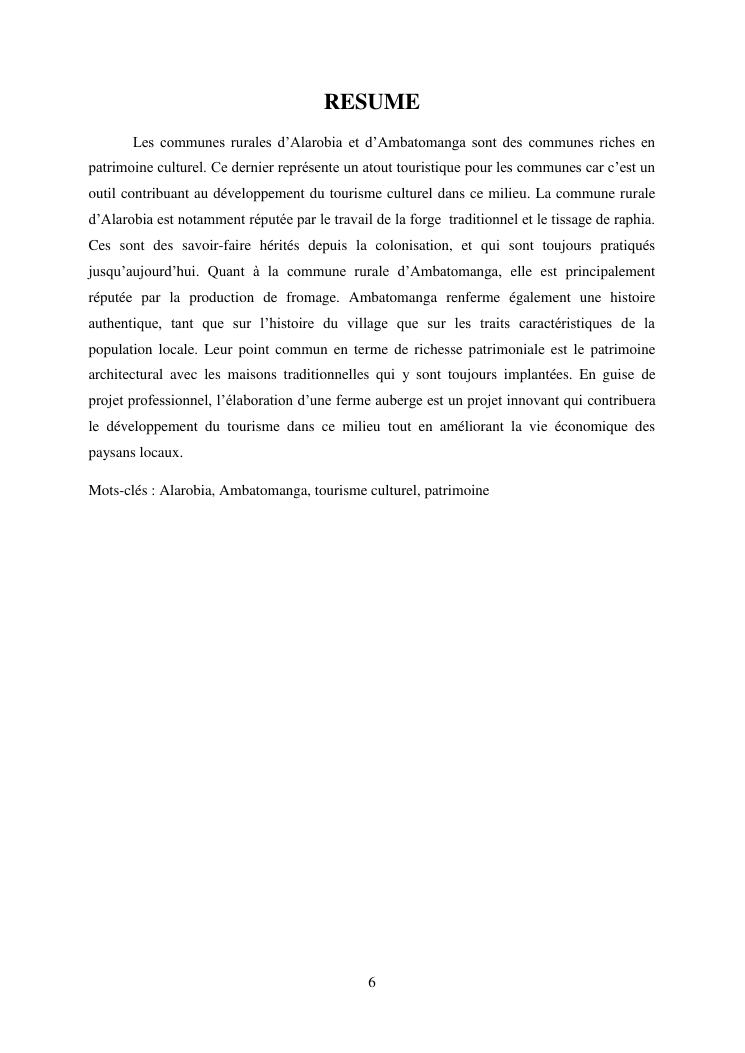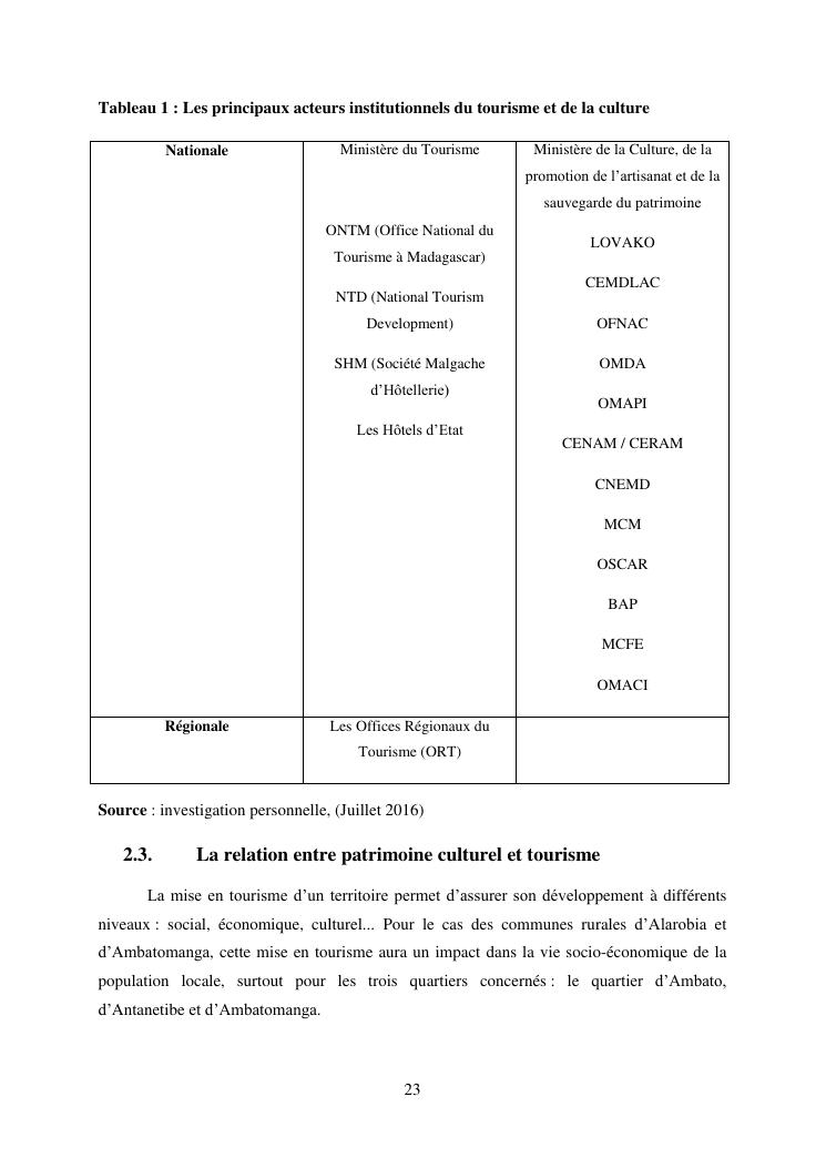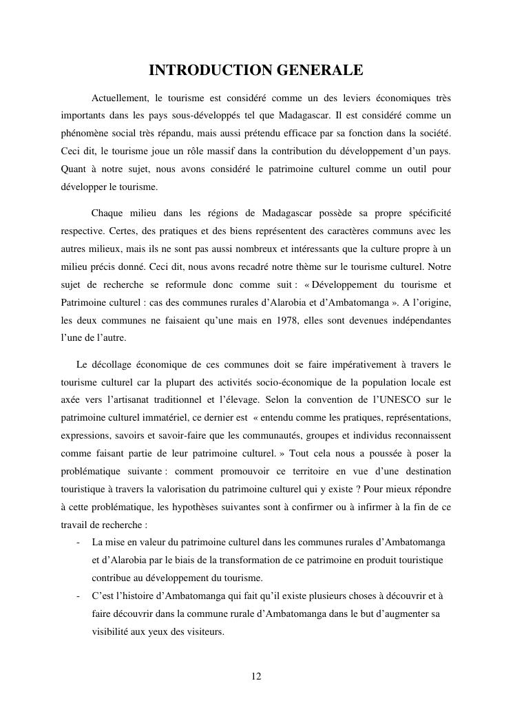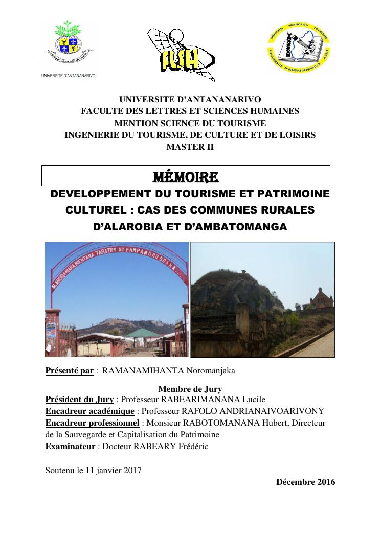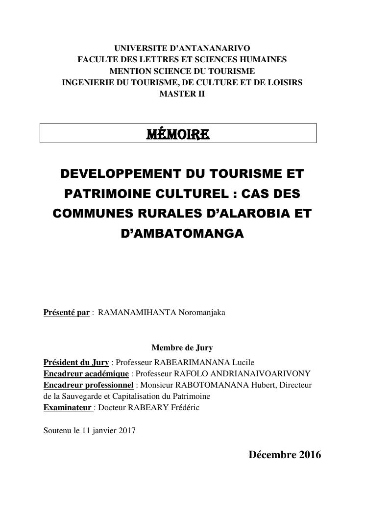 developpement du tourisme et patrimoine culturel : cas des communes rurales d'alarobia et d'ambatomanga