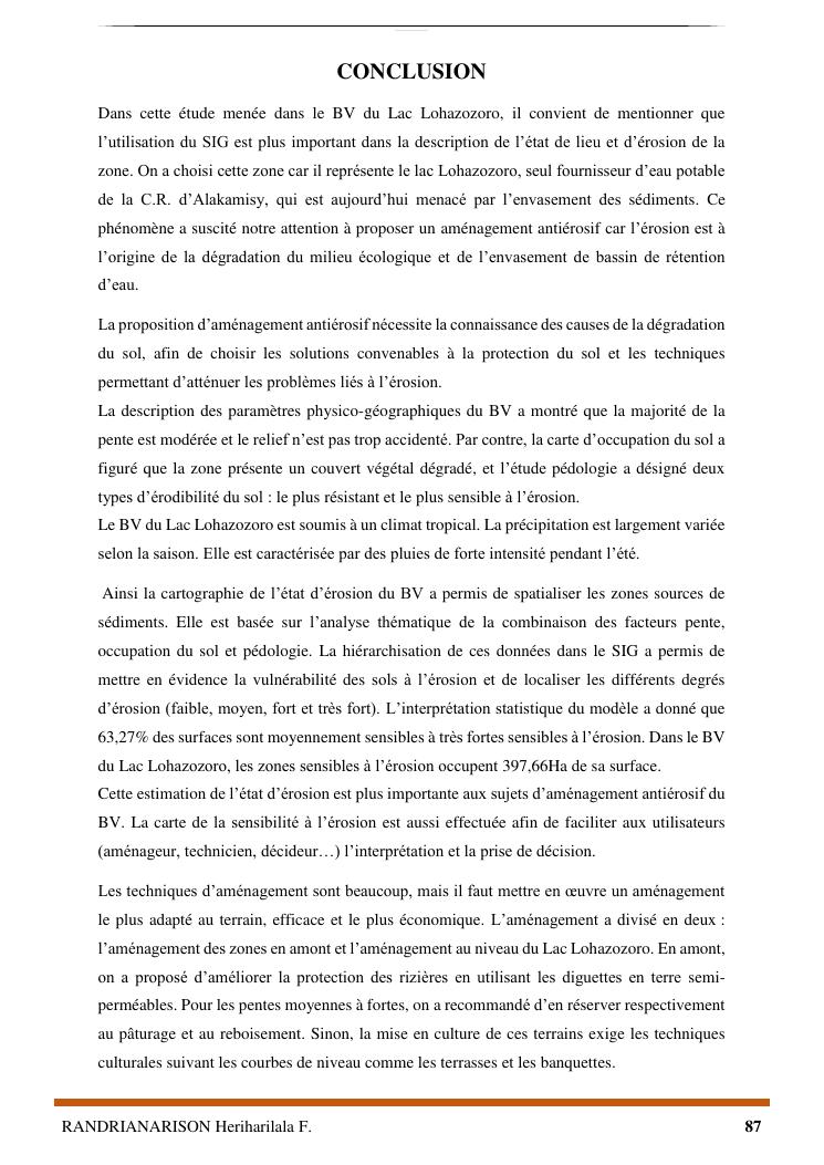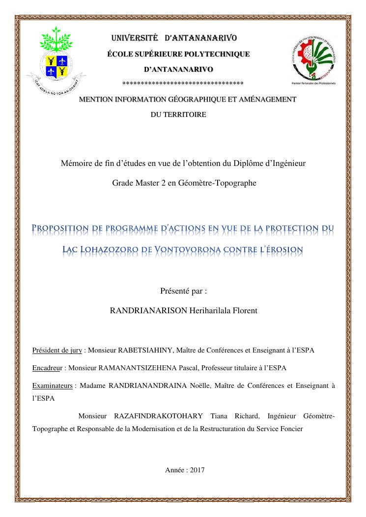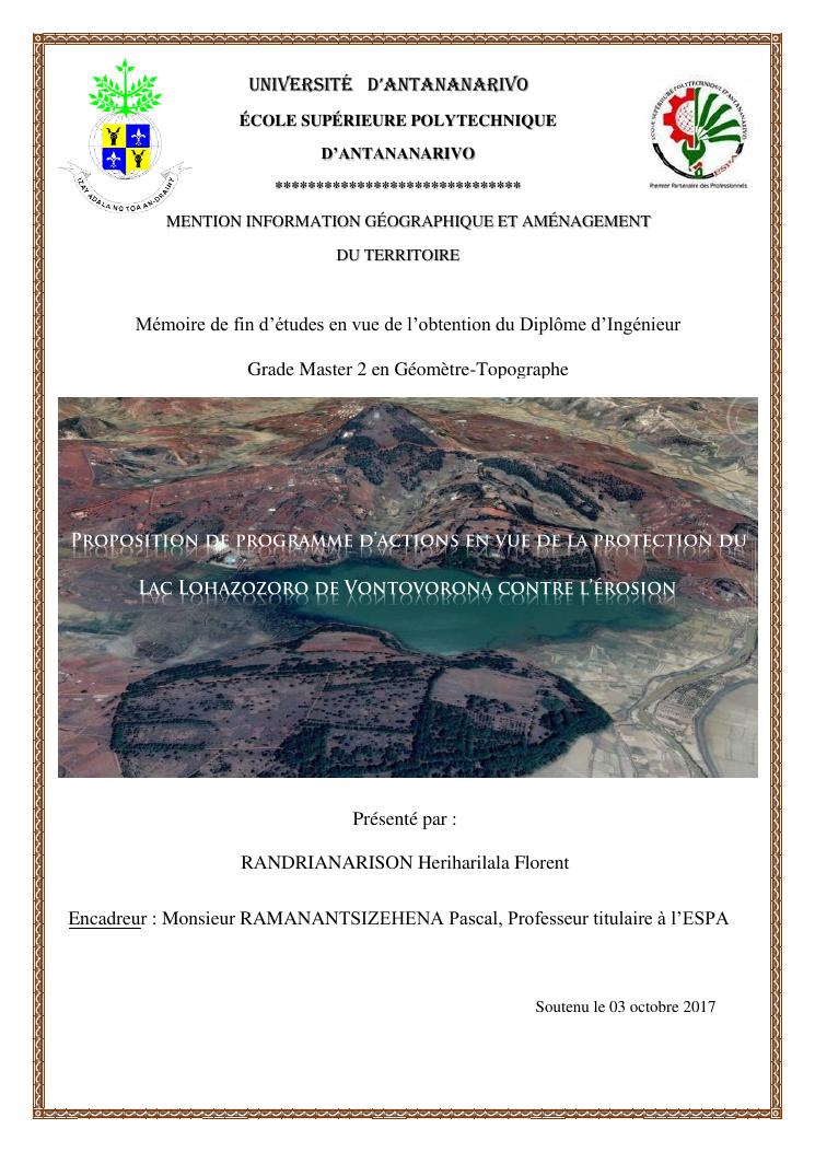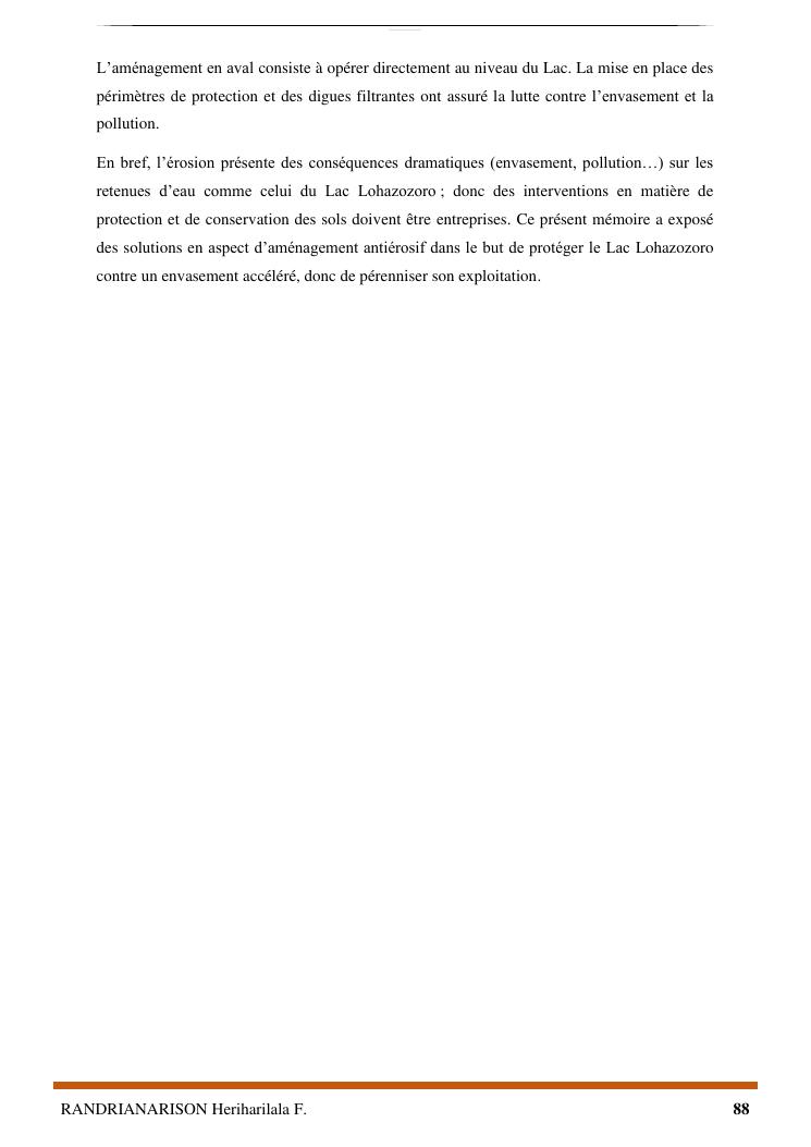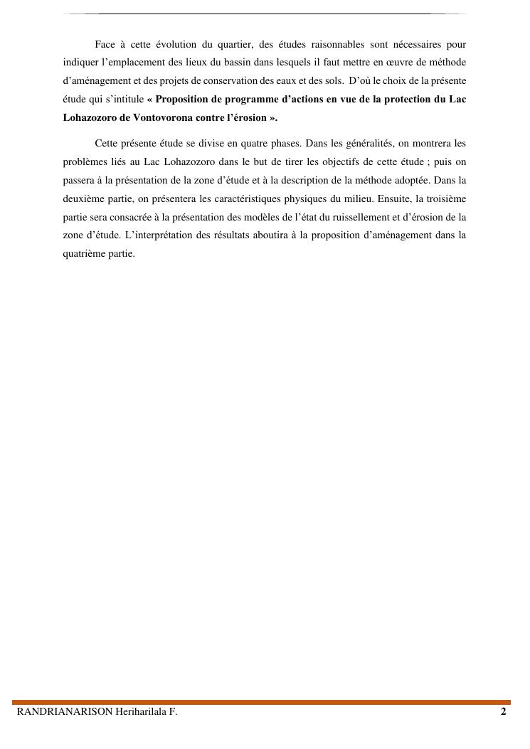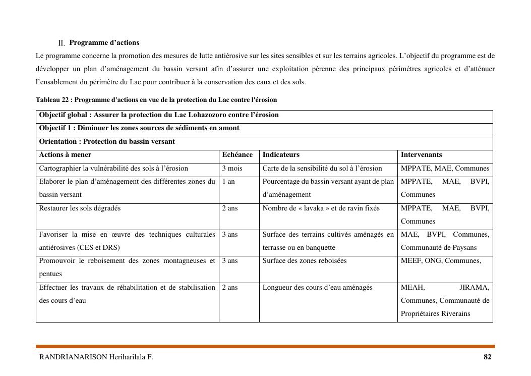proposition de programme d'actions en vue de la protection du lac lohazozoro de vontovorona contre l'érosion