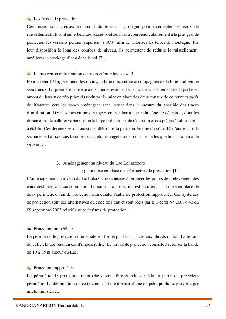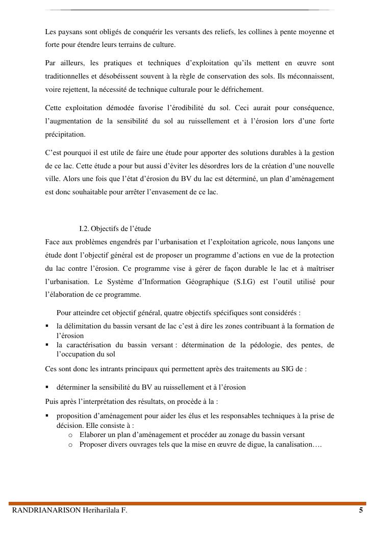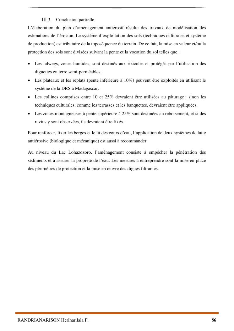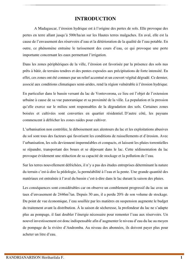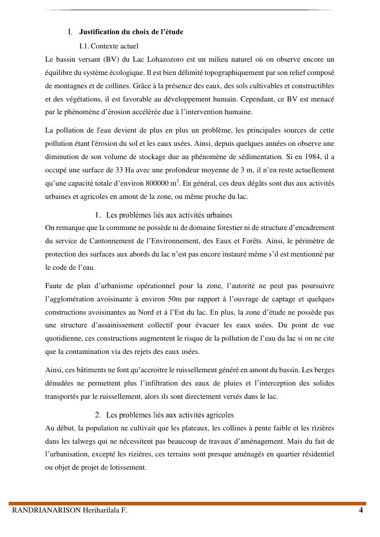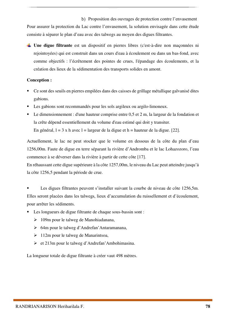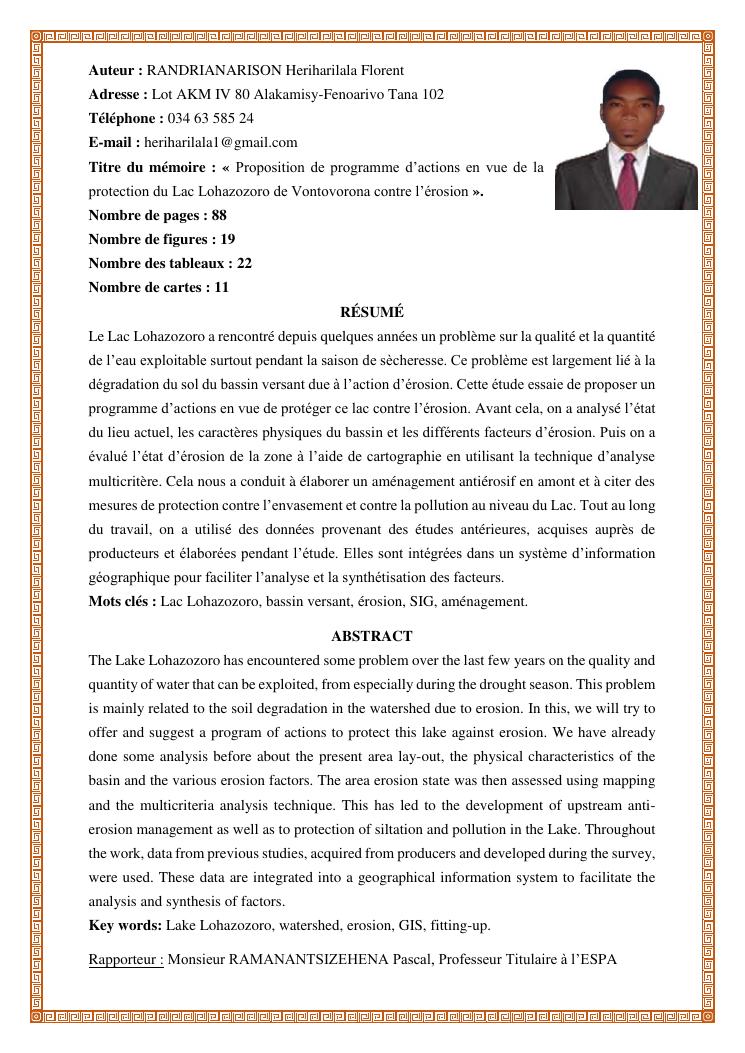 proposition de programme d'actions en vue de la protection du lac lohazozoro de vontovorona contre l'érosion