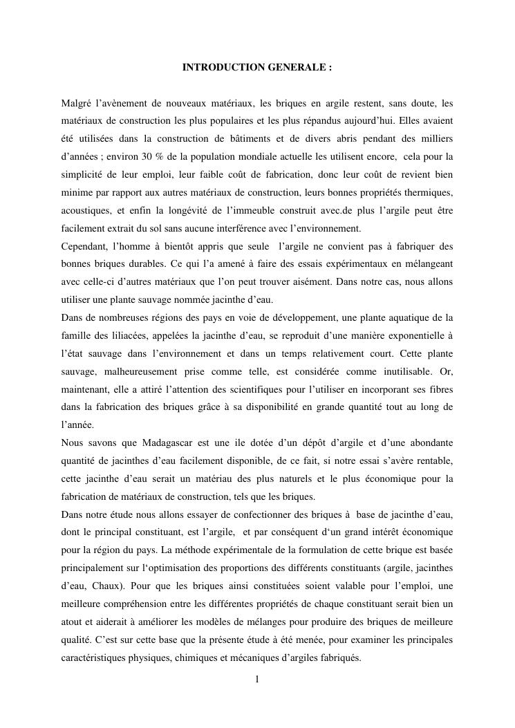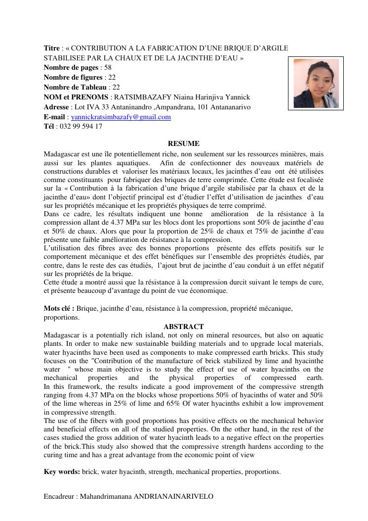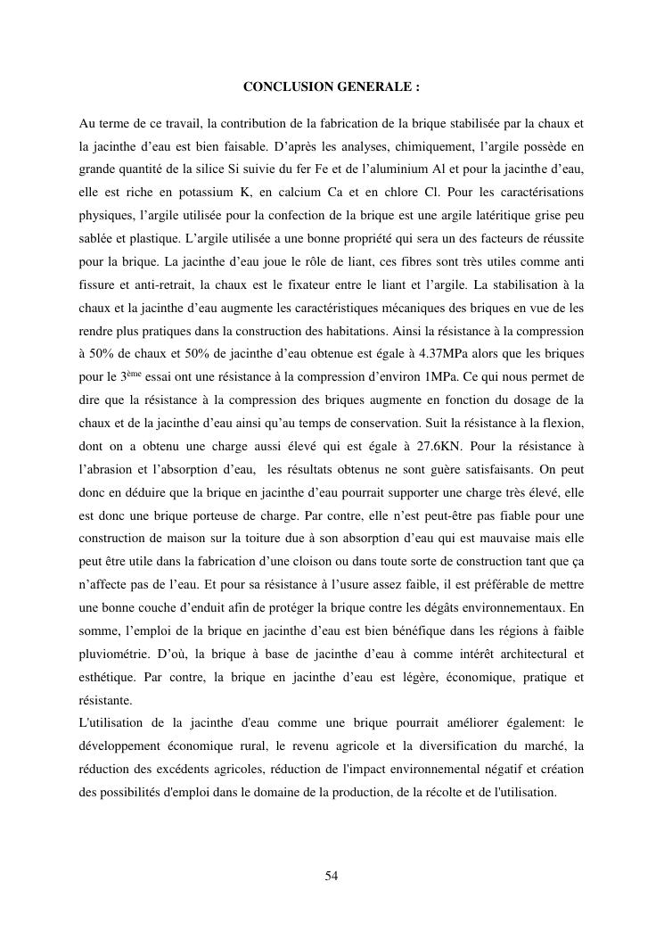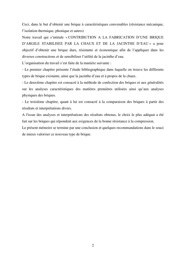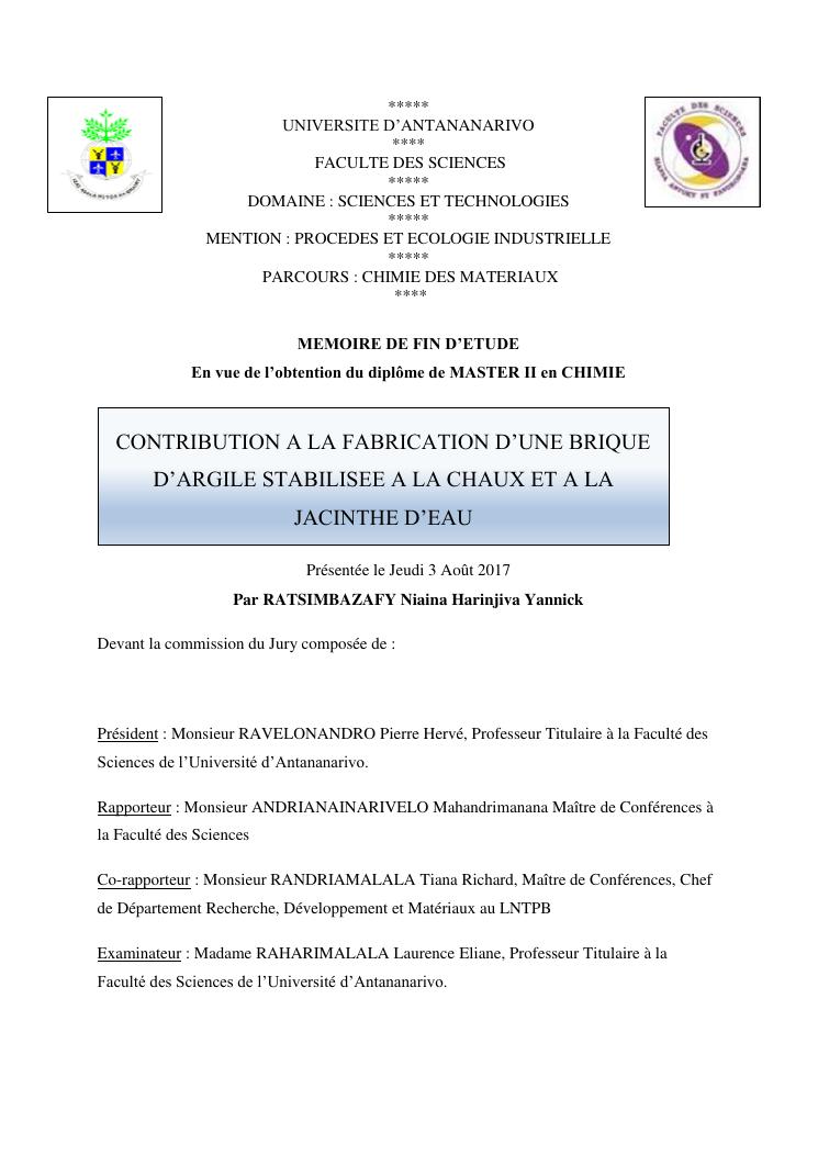 contribution a la fabrication d'une brique d'argile stabilisee a la chaux et a la jacinthe d'eau