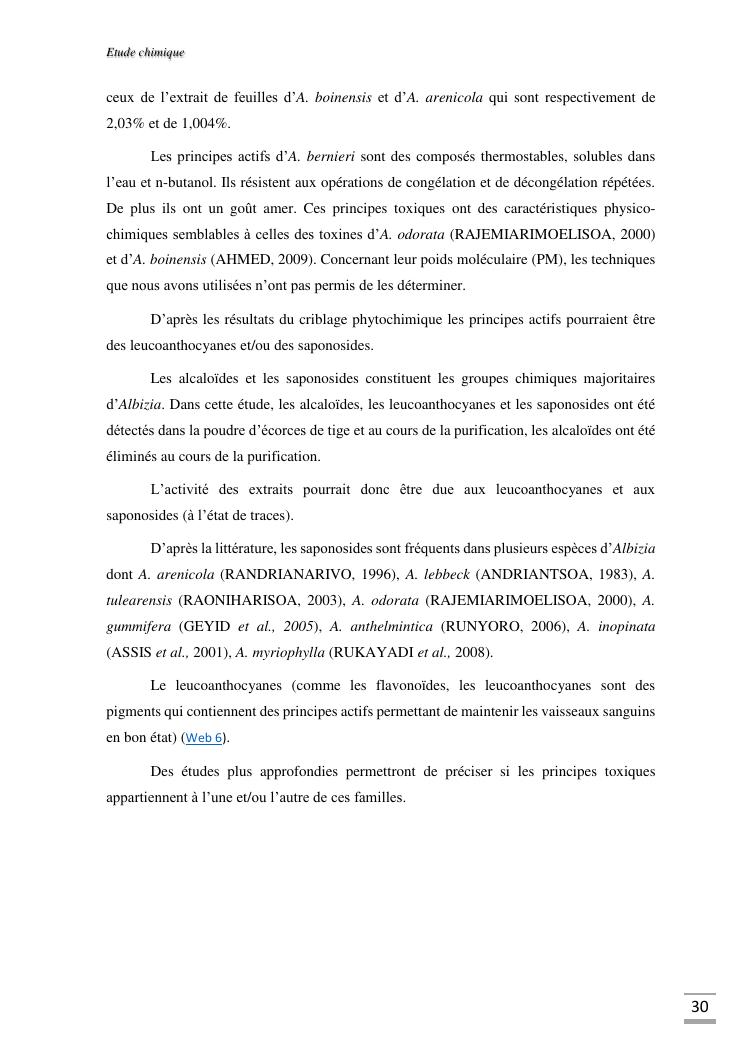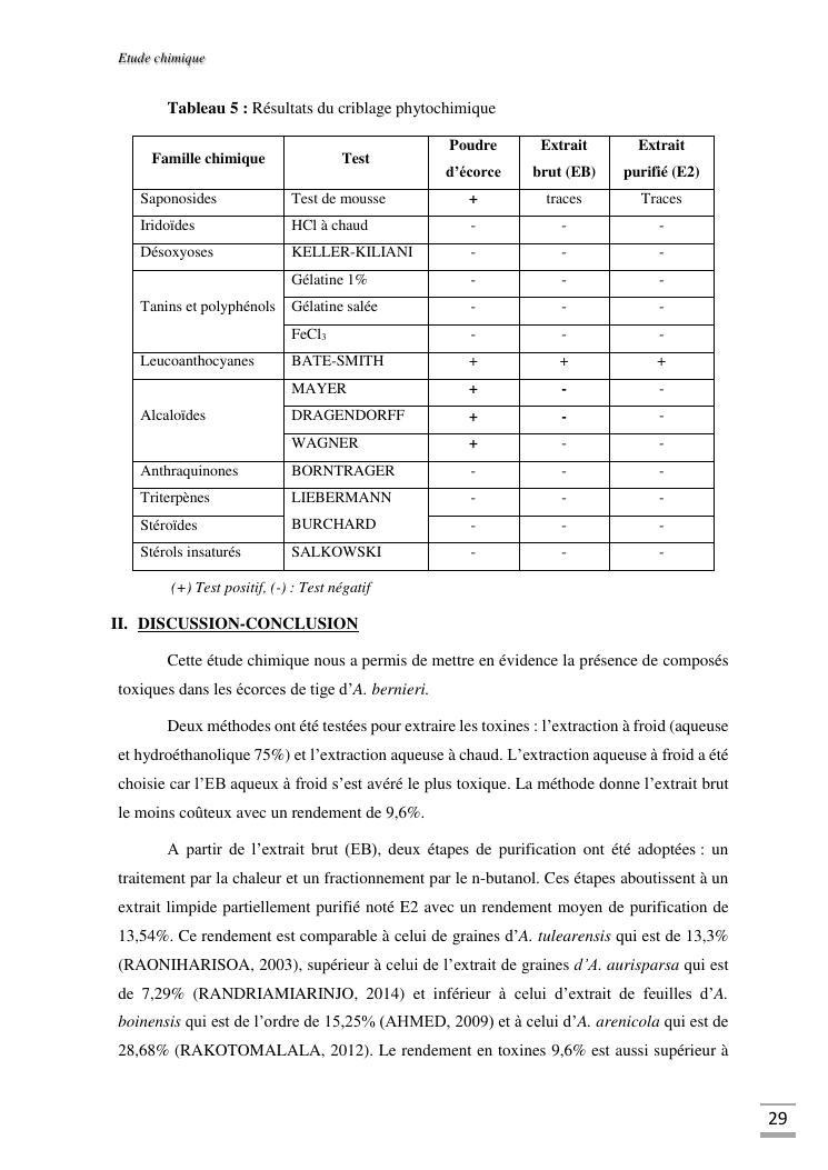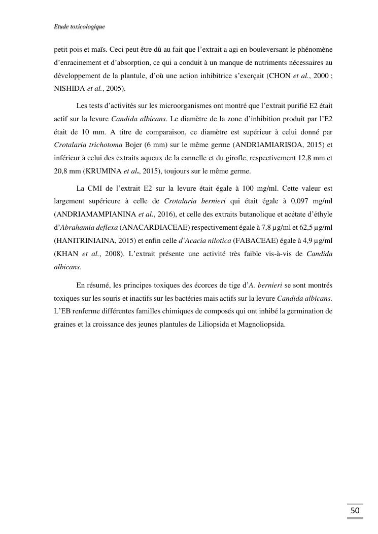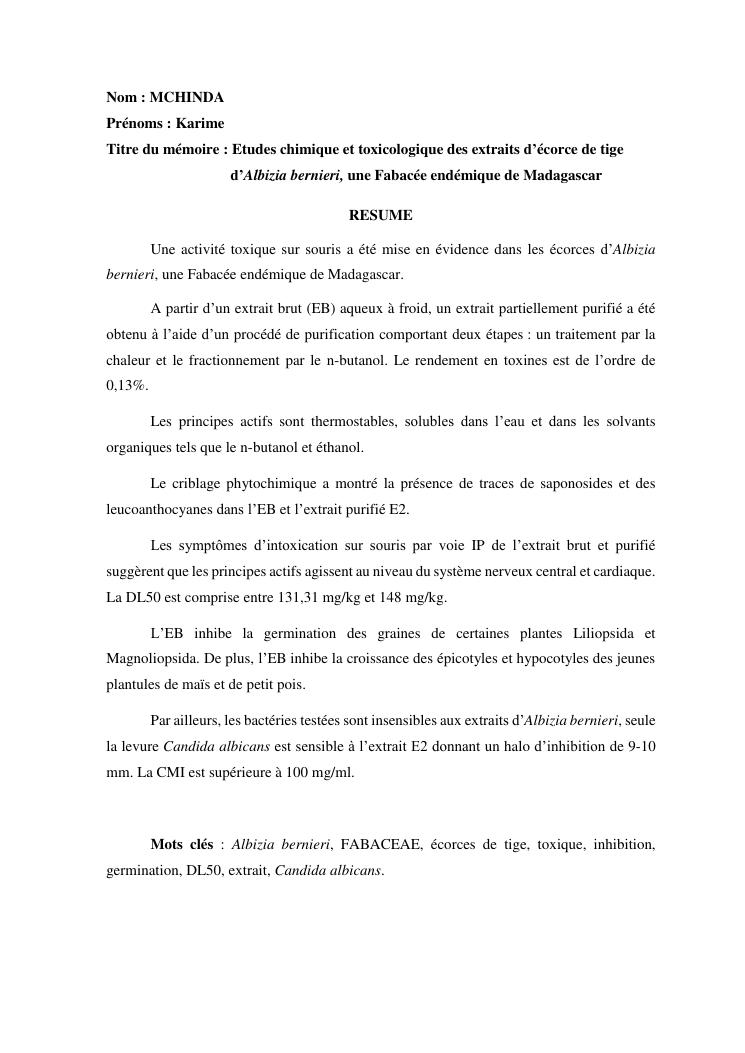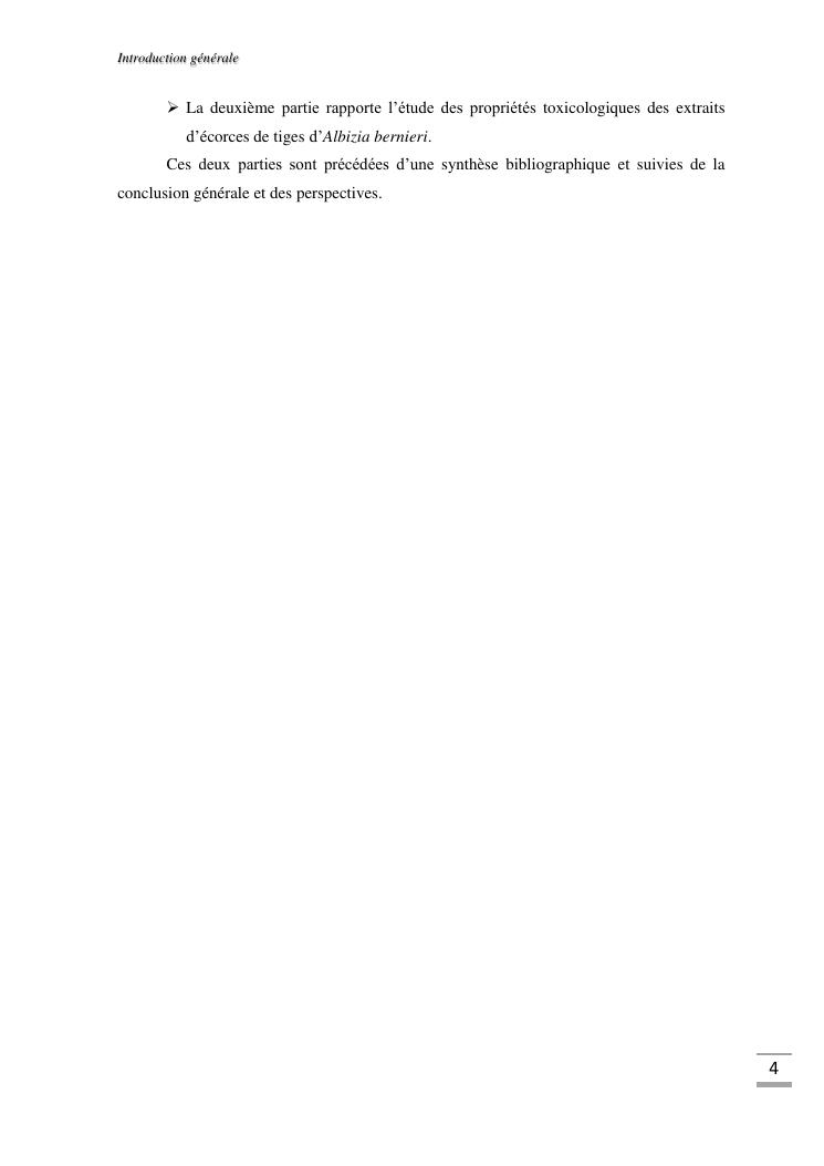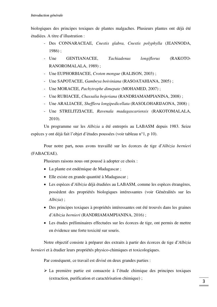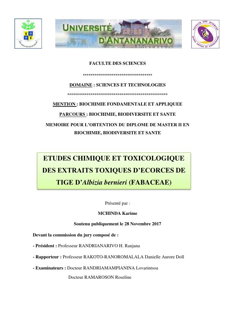 etudes chimique et toxicologique des extraits d'écorce de tige d'albizia bernieri, une fabacée endémique de madagascar