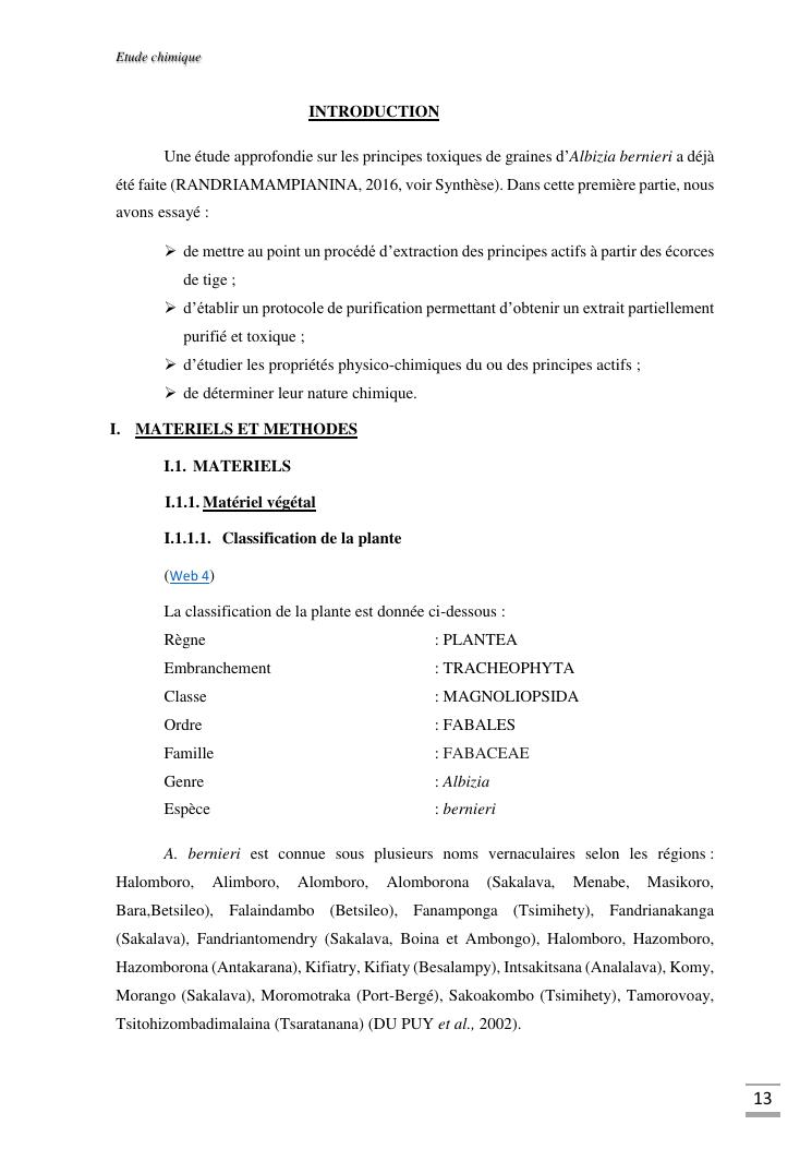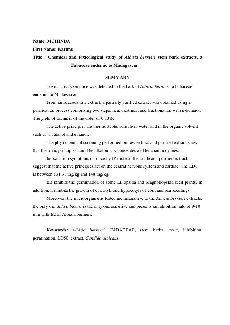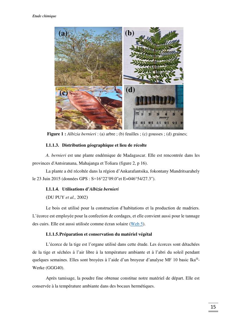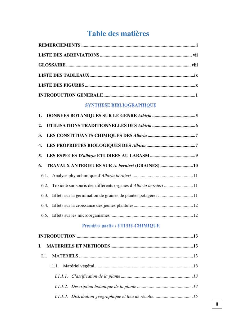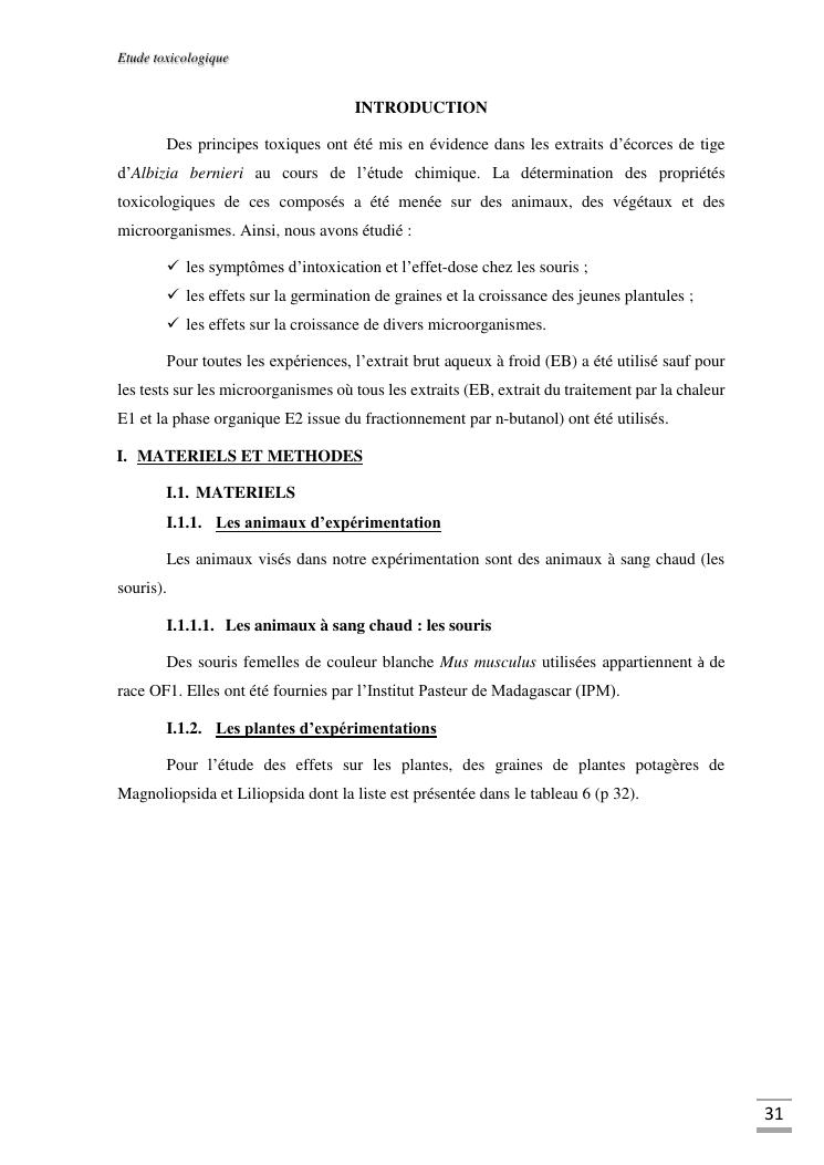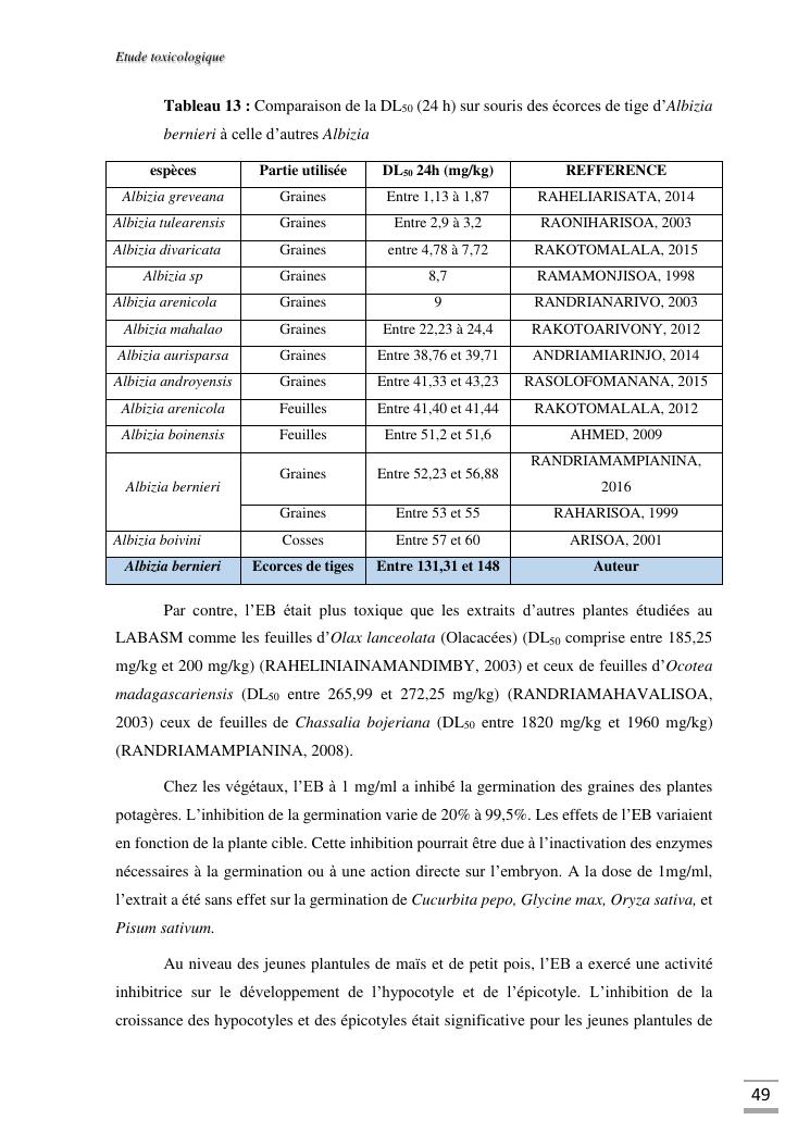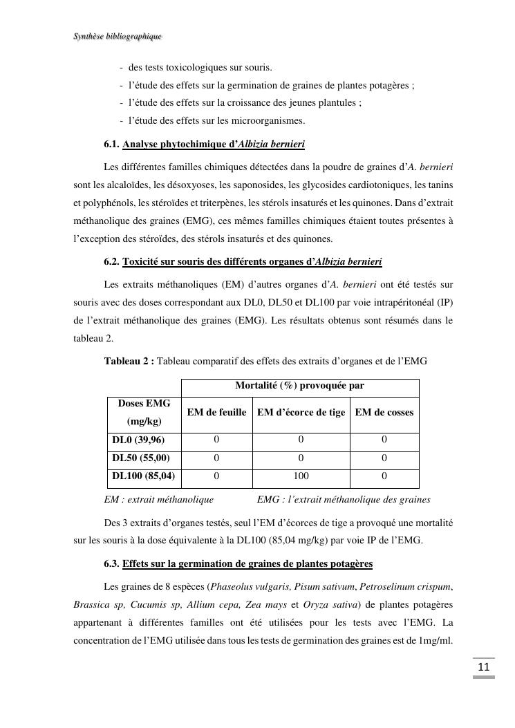 etudes chimique et toxicologique des extraits d'écorce de tige d'albizia bernieri, une fabacée endémique de madagascar