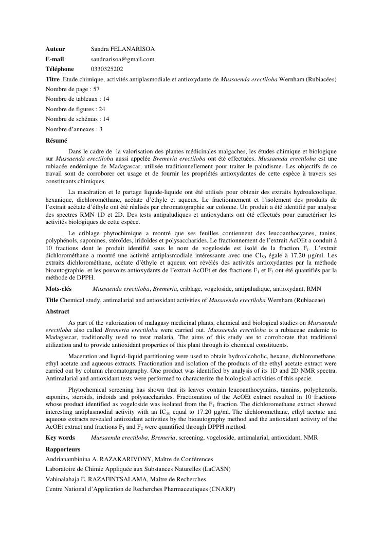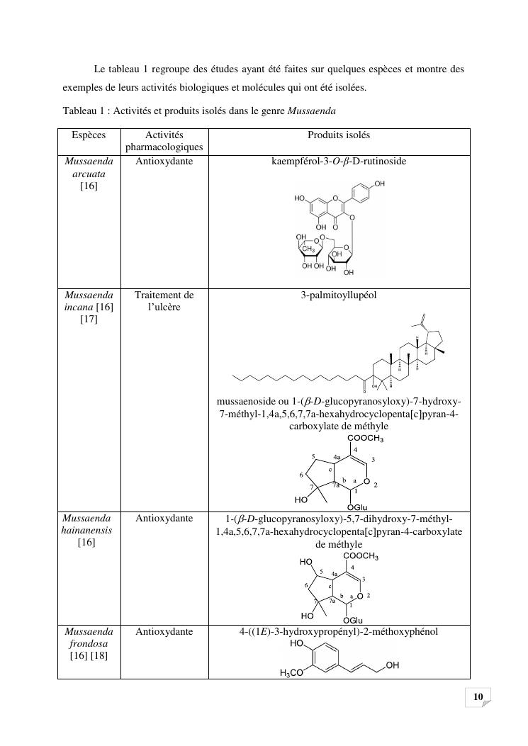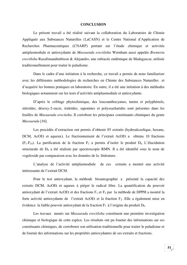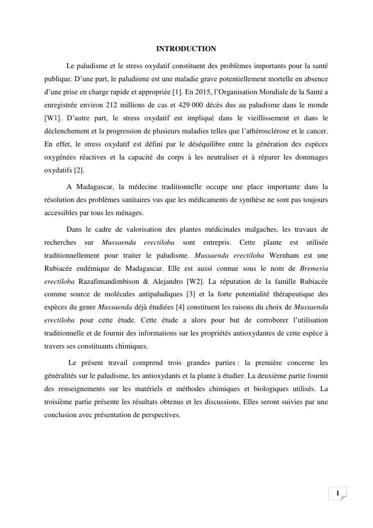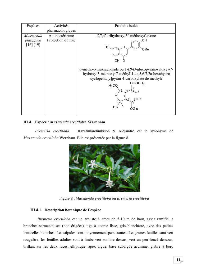 etude chimique, activites antiplasmodiale et antioxydante de mussaenda erectiloba wernham (rubiacées)