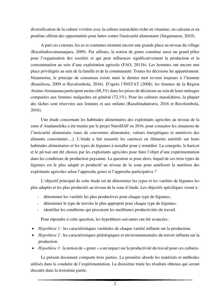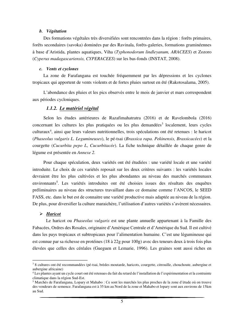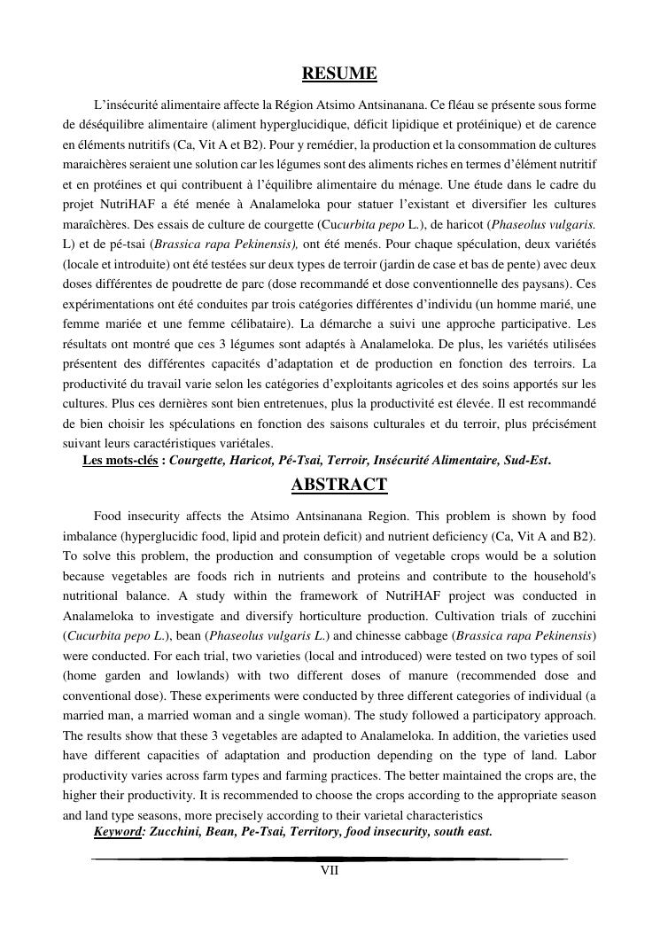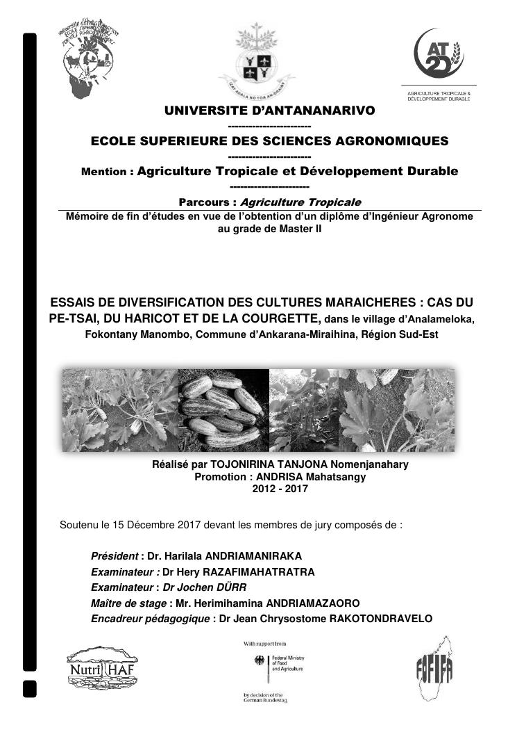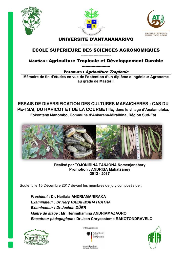 essais de diversification des cultures maraicheres : cas du pe-tsai, du haricot et de la courgette, dans le village d'analameloka, fokontany manombo, commune d'ankarana-miraihina, région sud-est