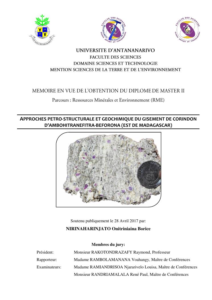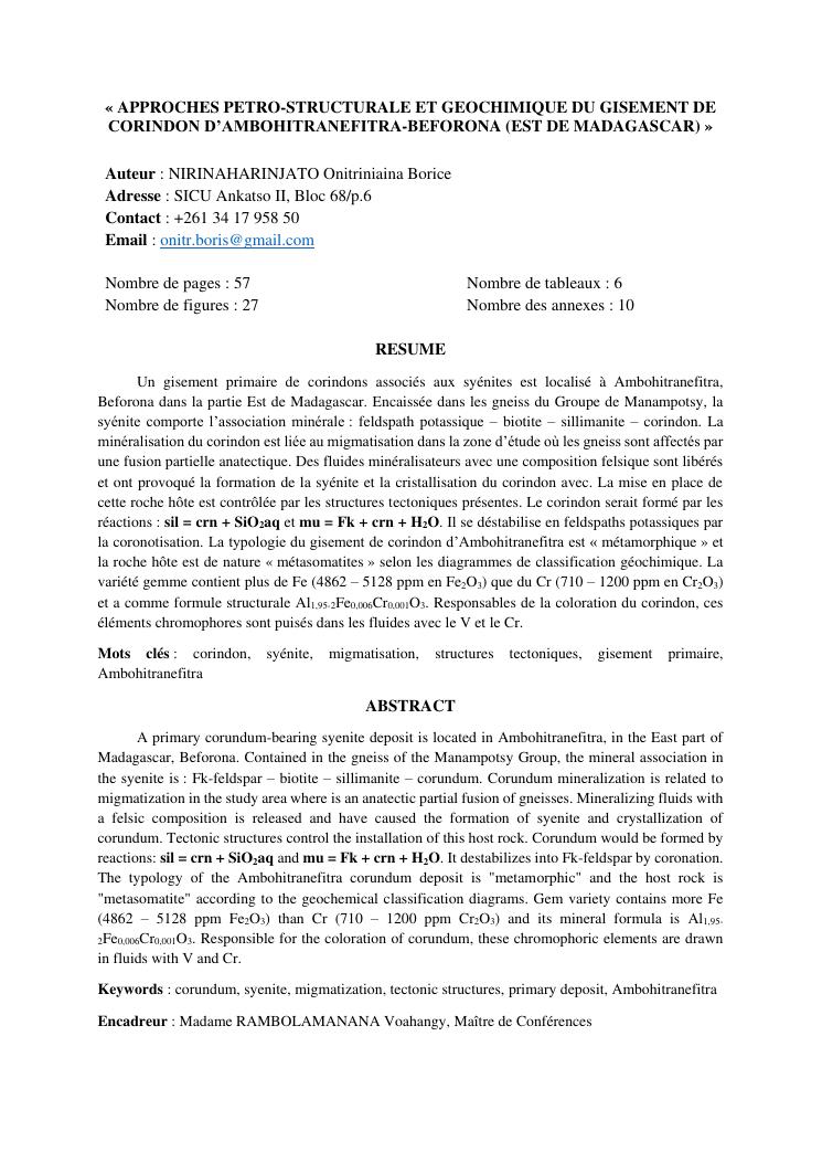 approches petro-structurale et geochimique du gisement de corindon d'ambohitranefitra-beforona (est de madagascar)