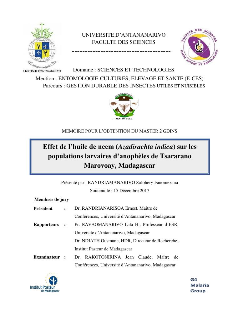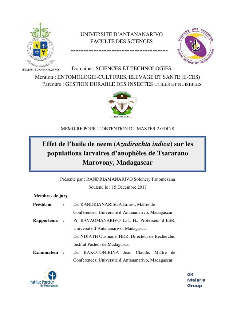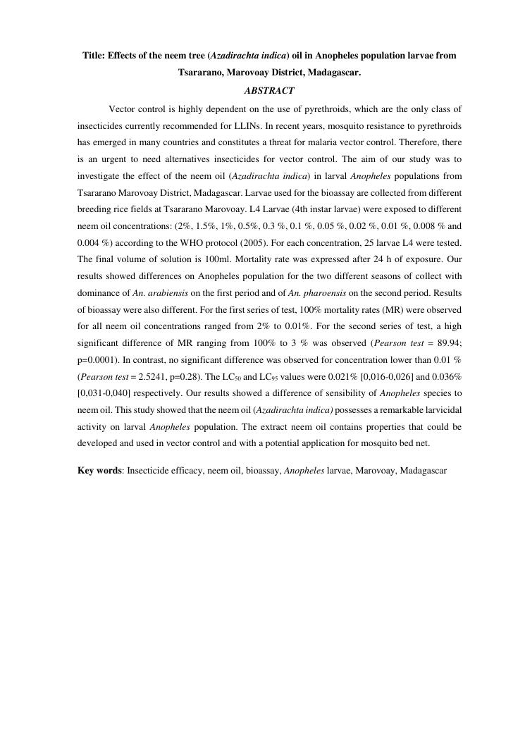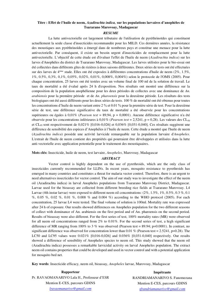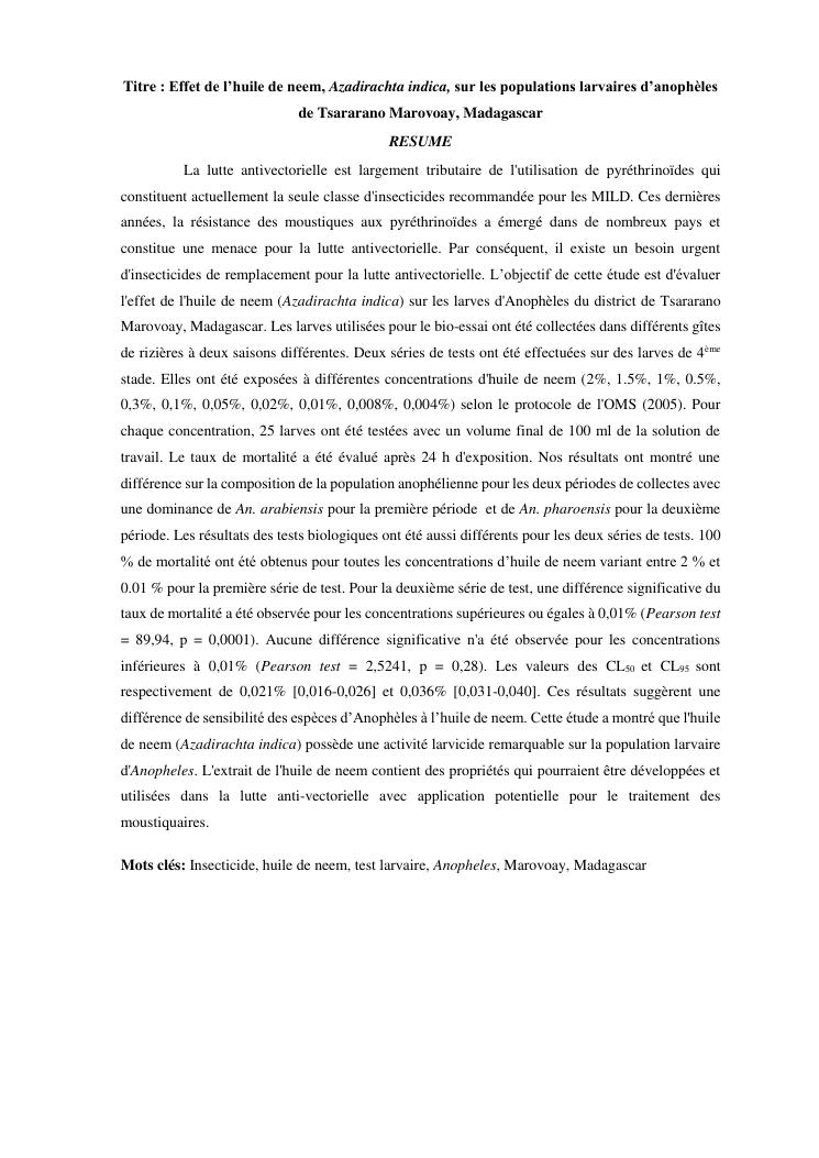 effet de l'huile de neem (azadirachta indica) sur les populations larvaires d'anophèles de tsararano marovoay, madagascar