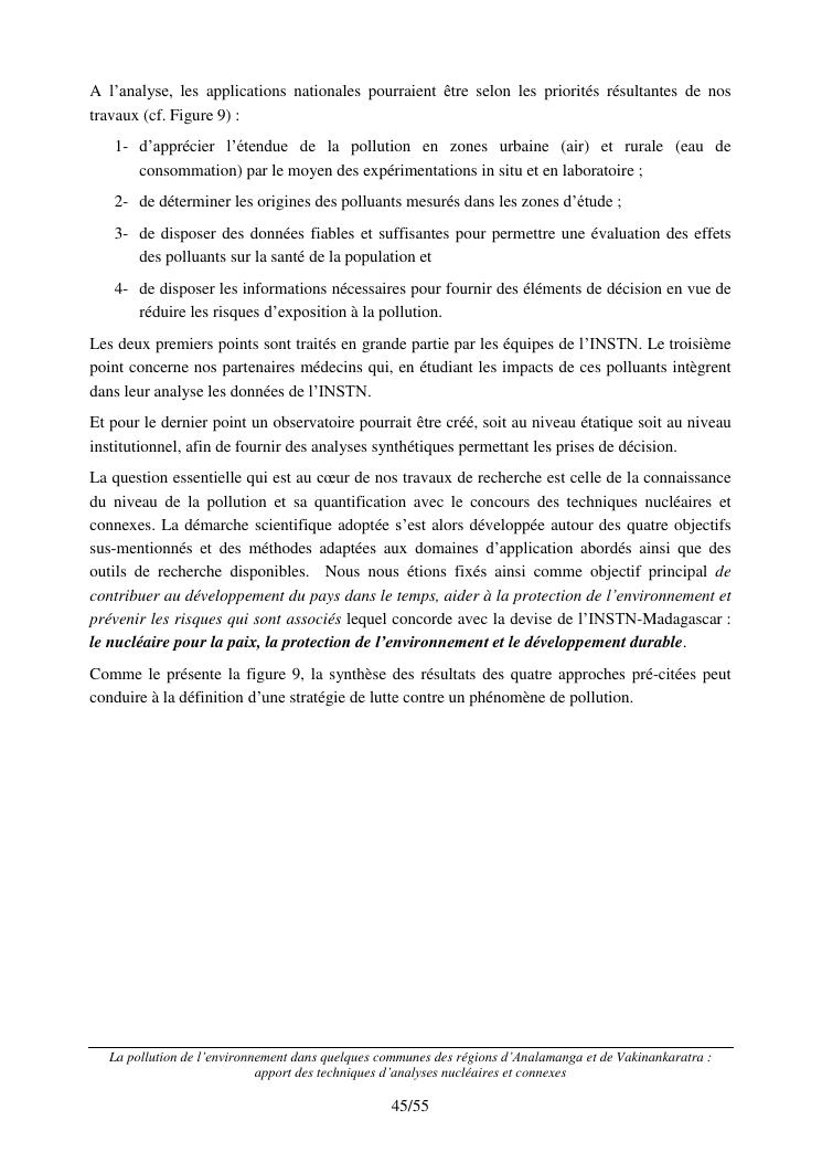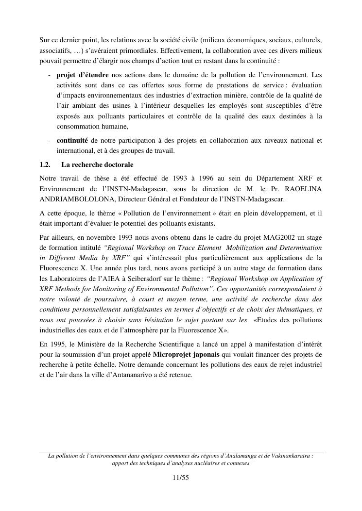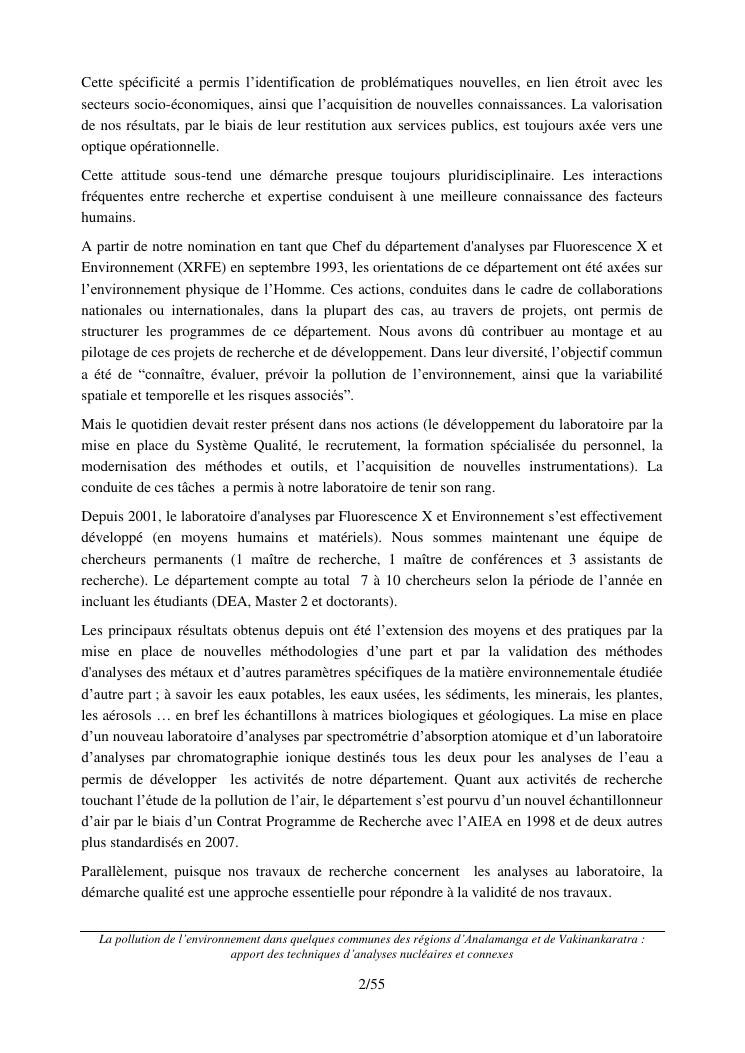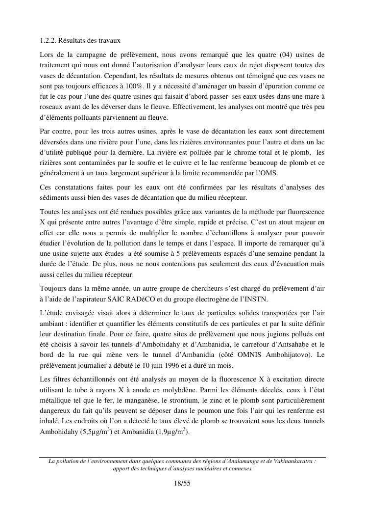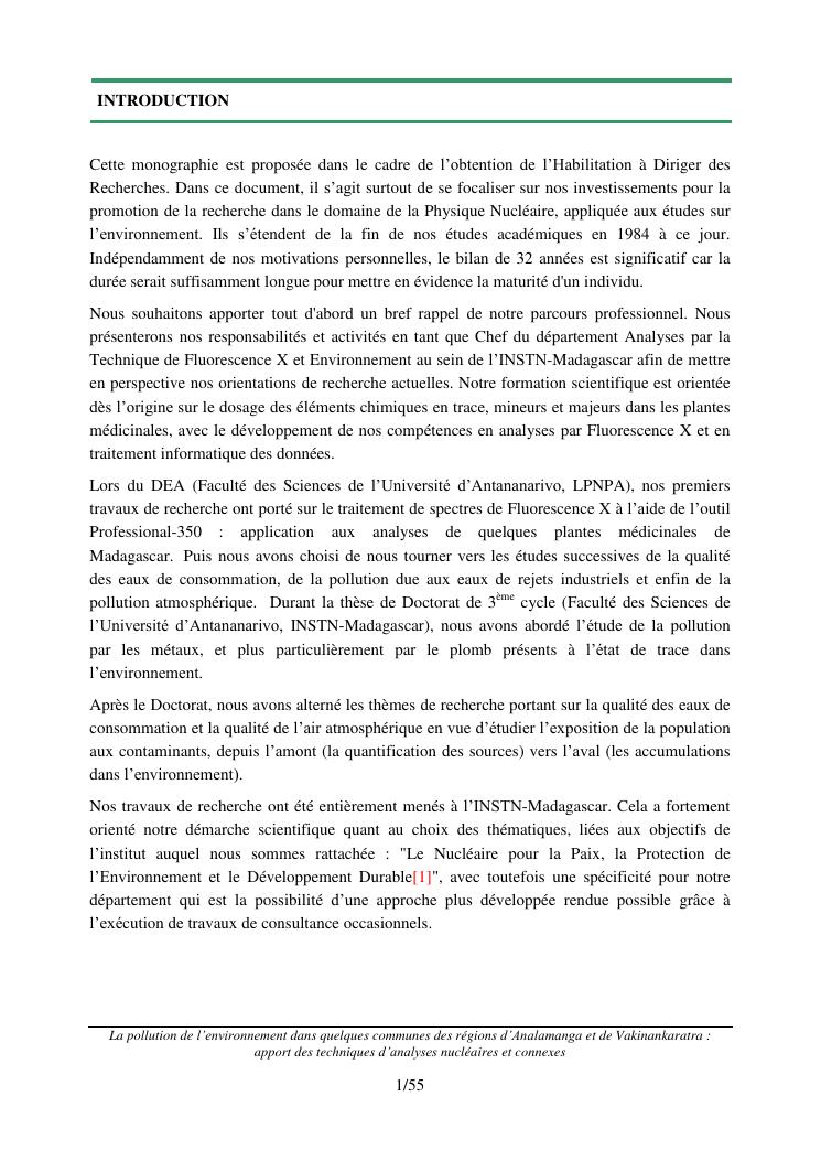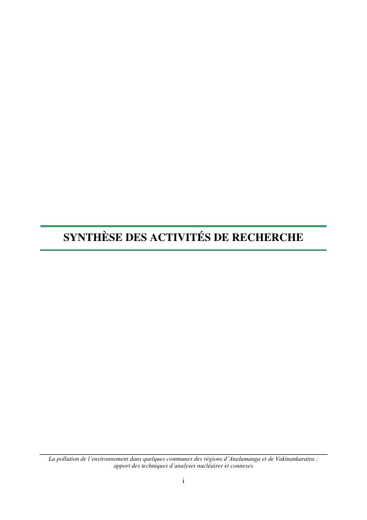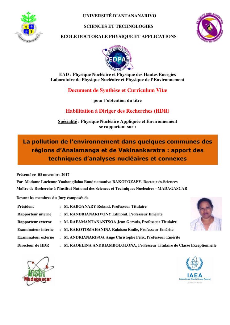 la pollution de l'environnement dans quelques communes des régions d'analamanga et de vakinankaratra : apport des techniques d'analyses nucléaires et connexes. volume 1 : document de synthèse et curriculum vitæ