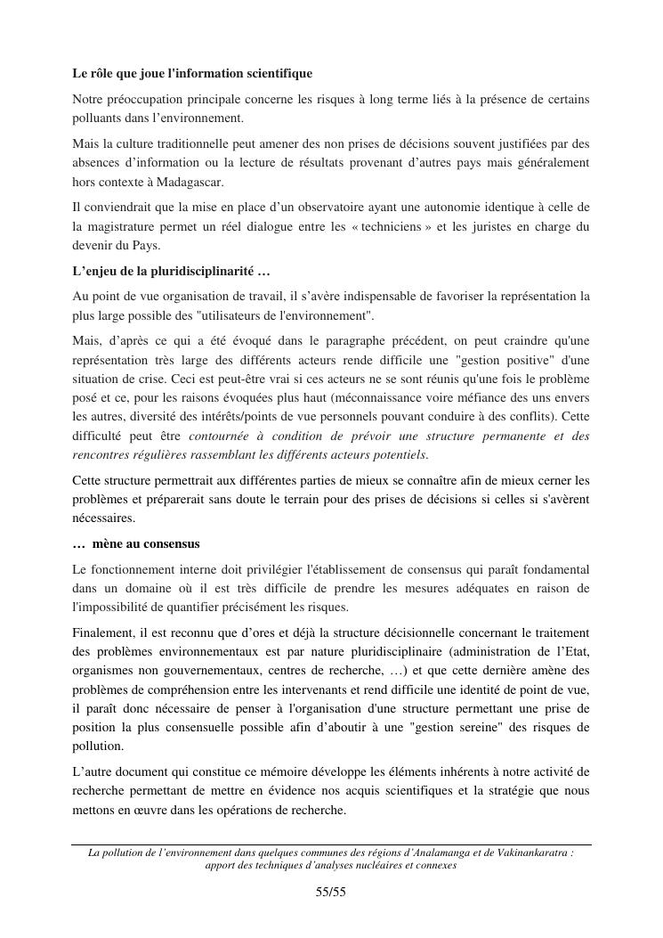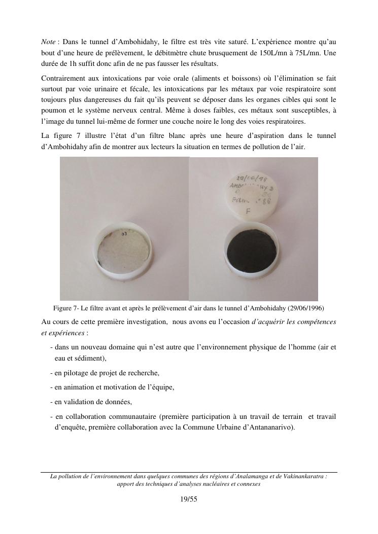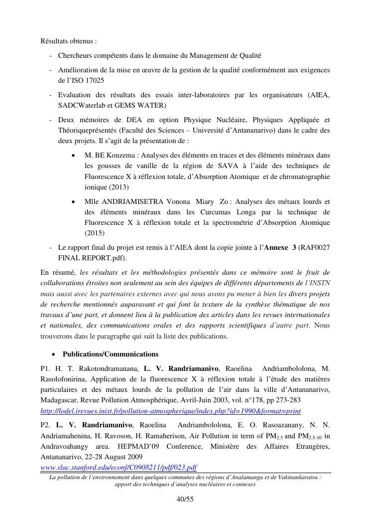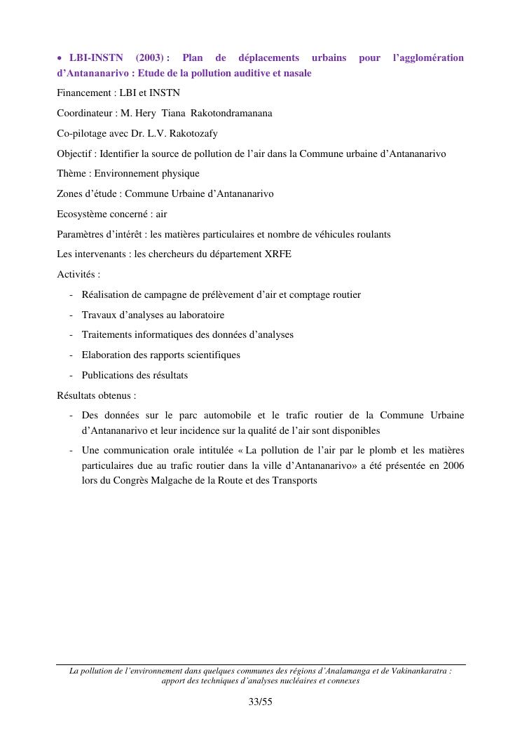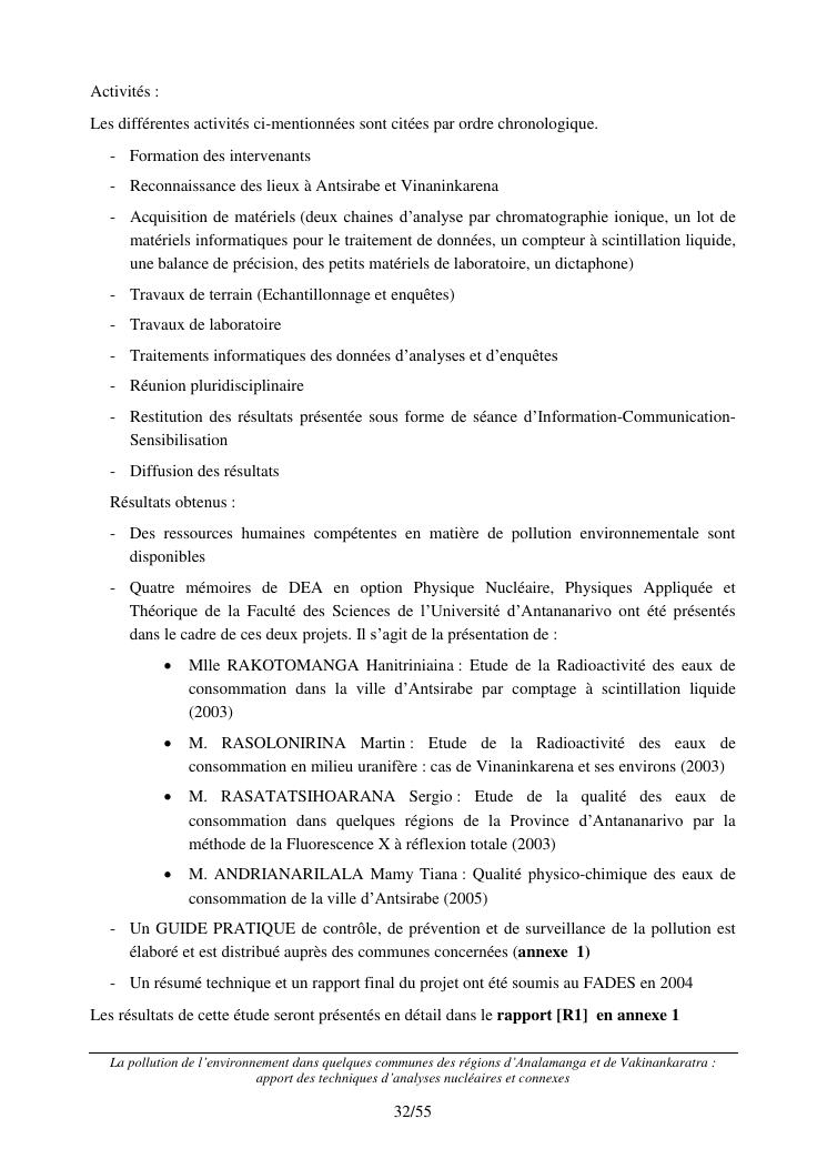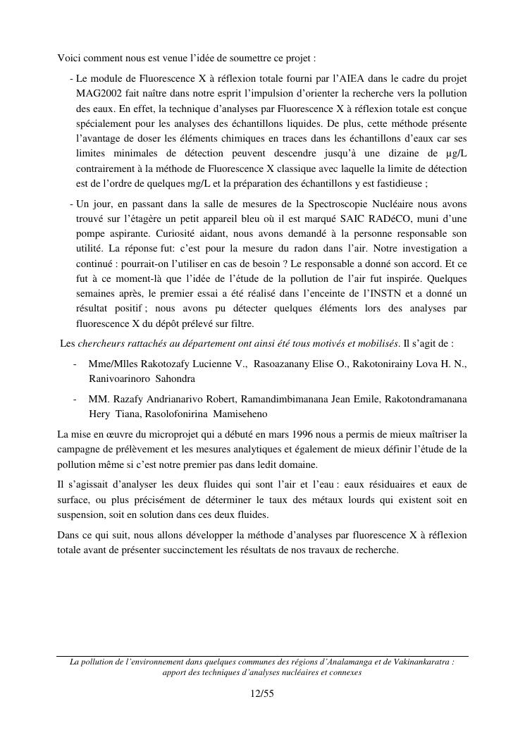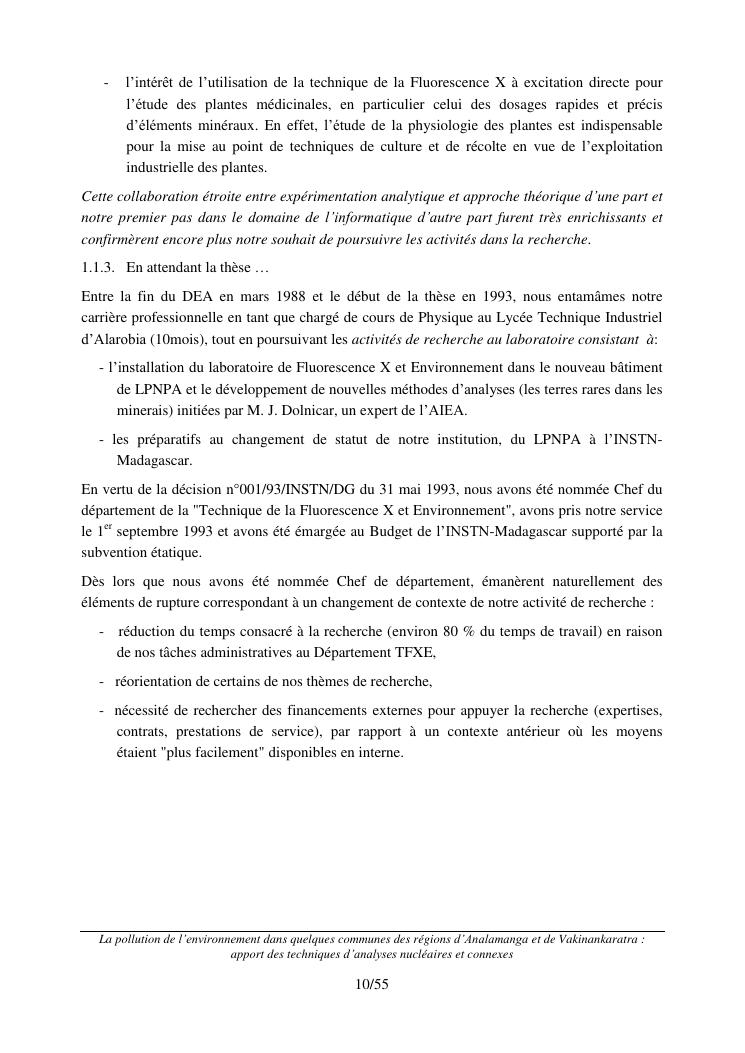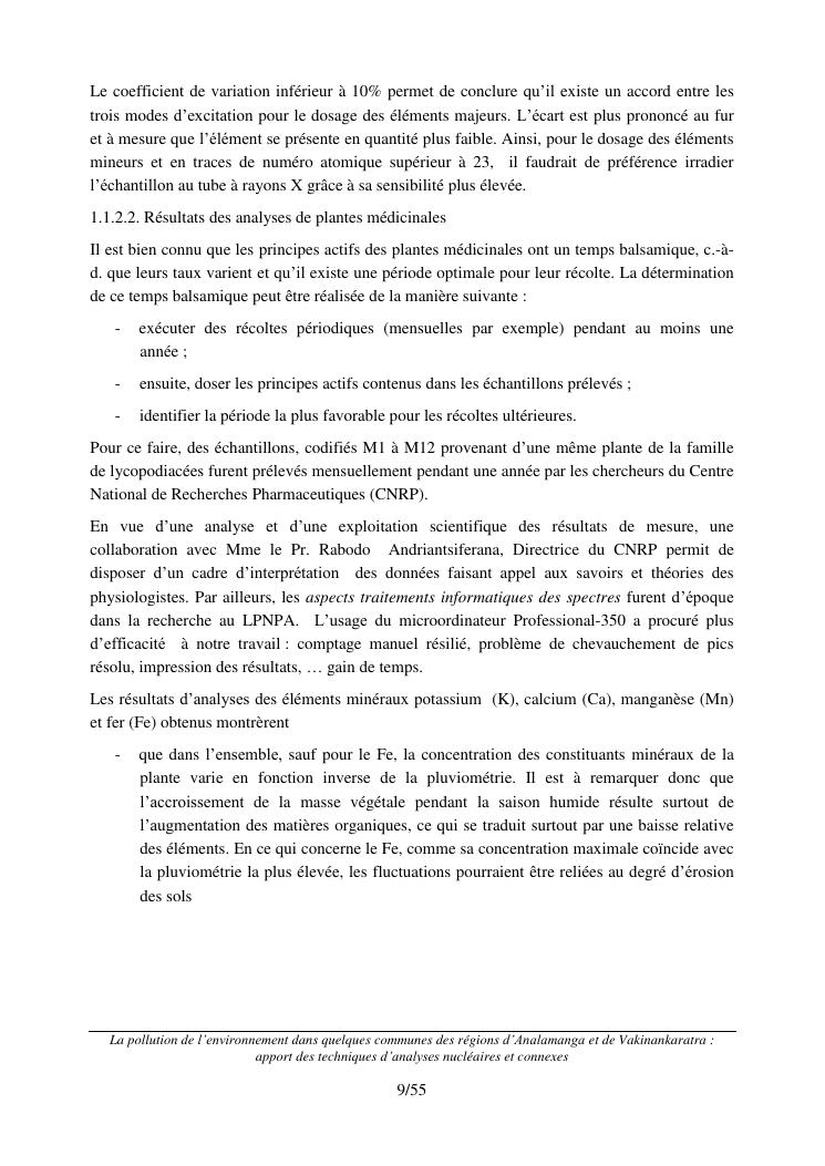 la pollution de l'environnement dans quelques communes des régions d'analamanga et de vakinankaratra : apport des techniques d'analyses nucléaires et connexes. volume 1 : document de synthèse et curriculum vitæ