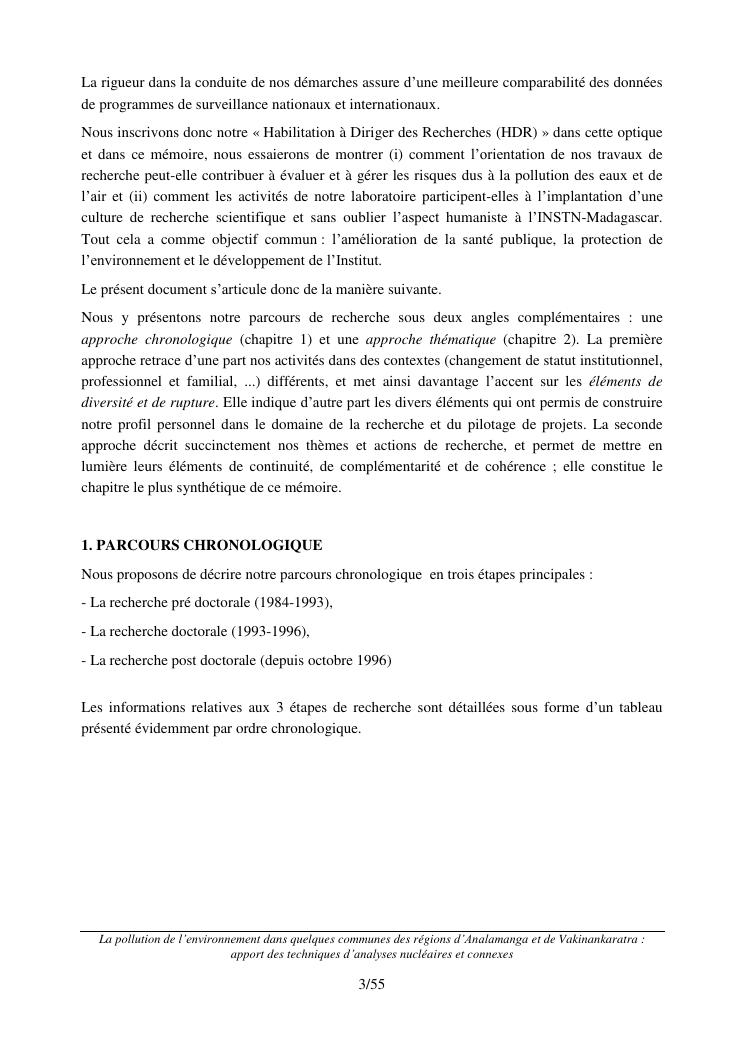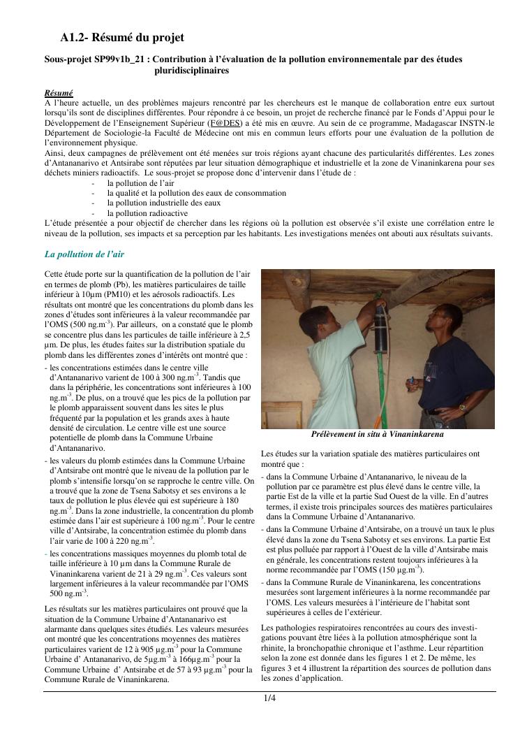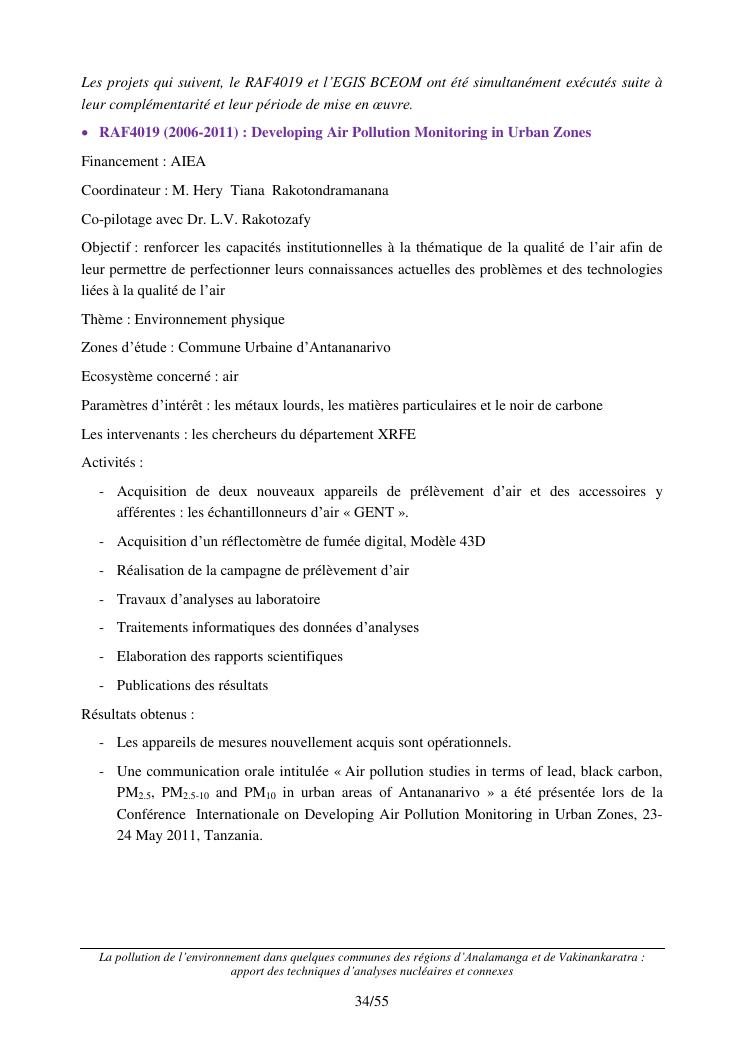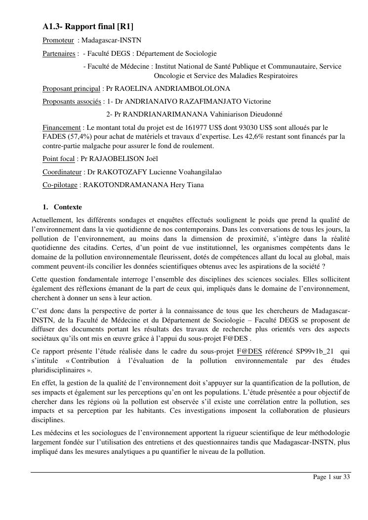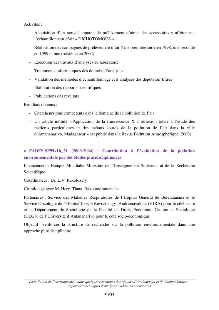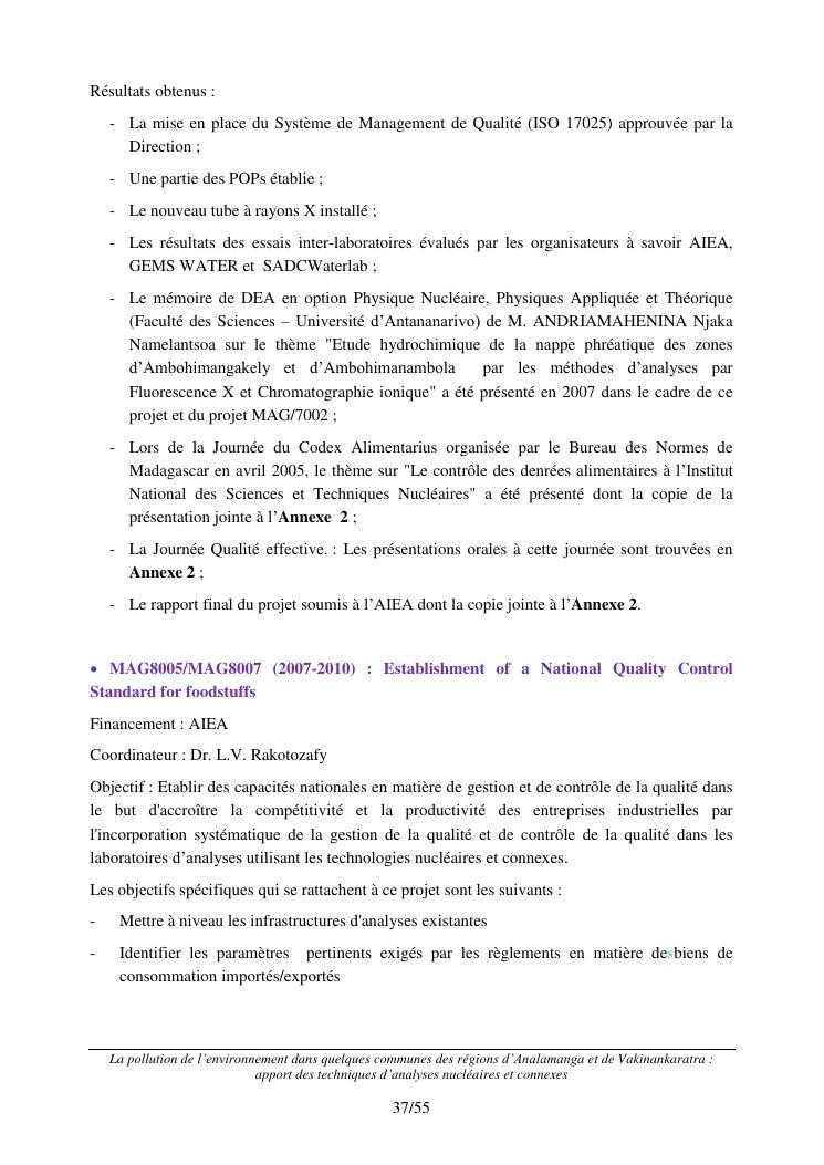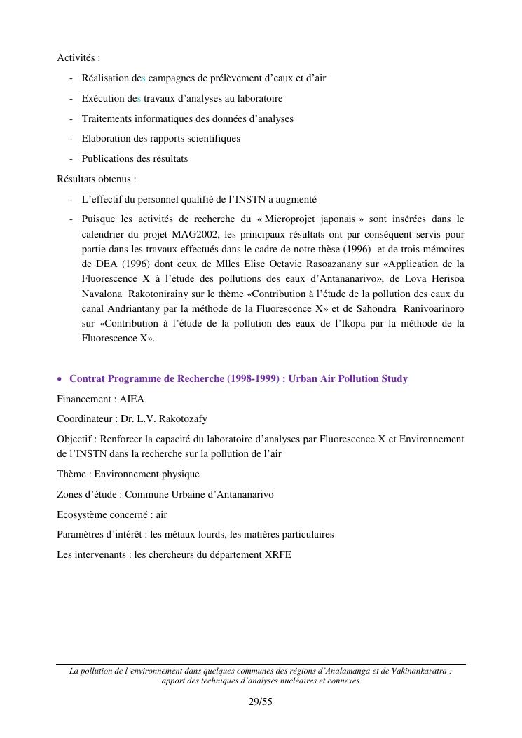 la pollution de l'environnement dans quelques communes des régions d'analamanga et de vakinankaratra : apport des techniques d'analyses nucléaires et connexes. volume 1 : document de synthèse et curriculum vitæ