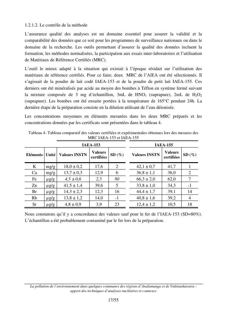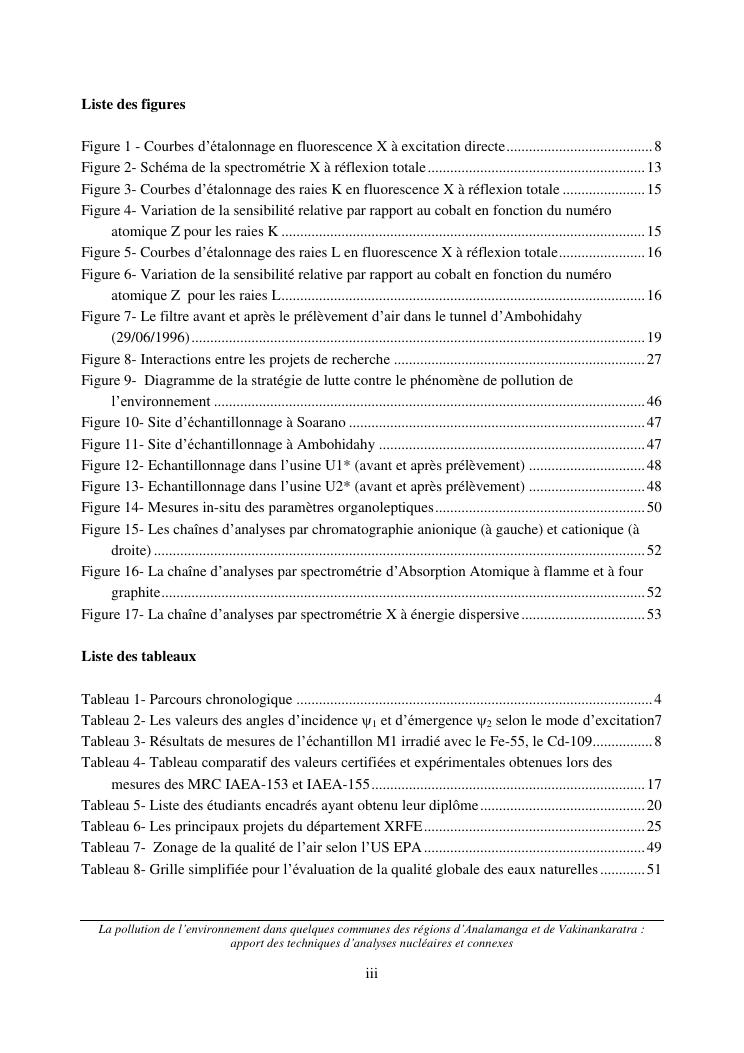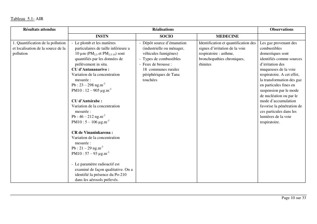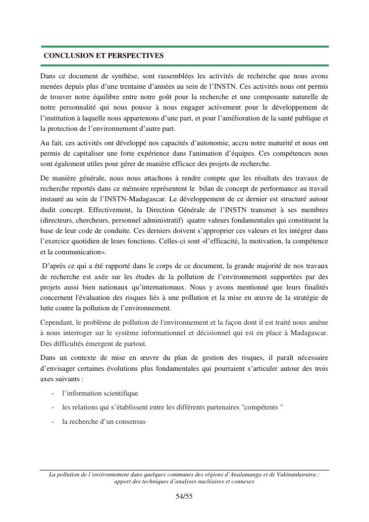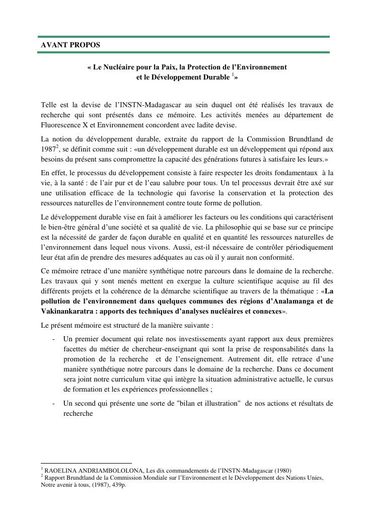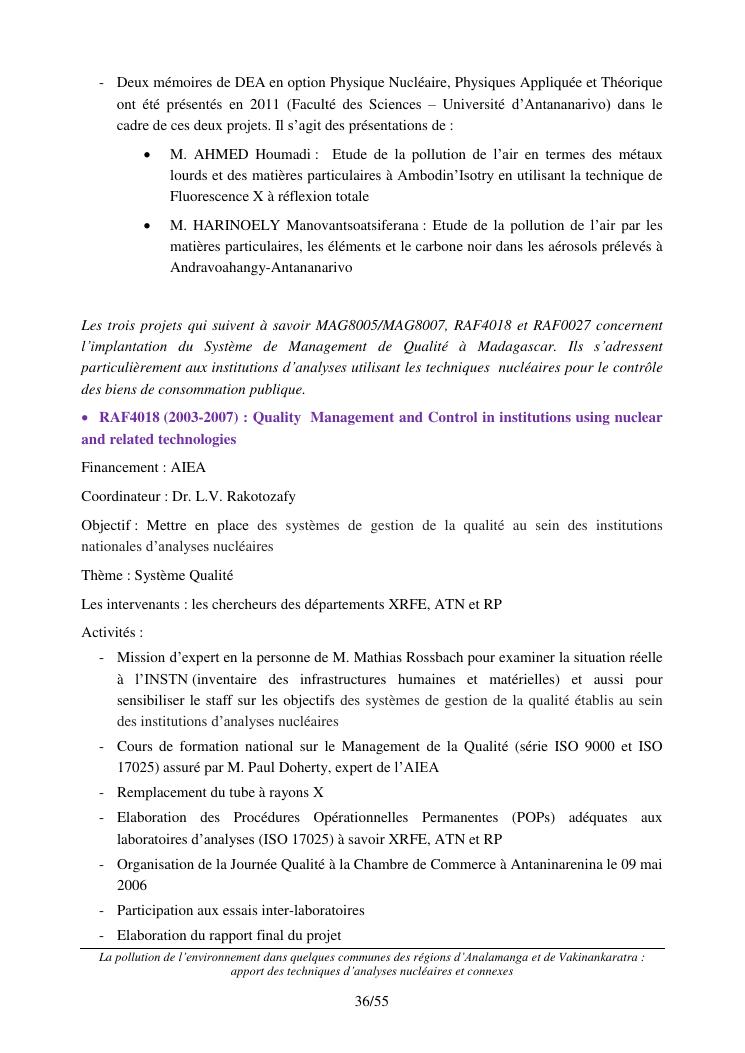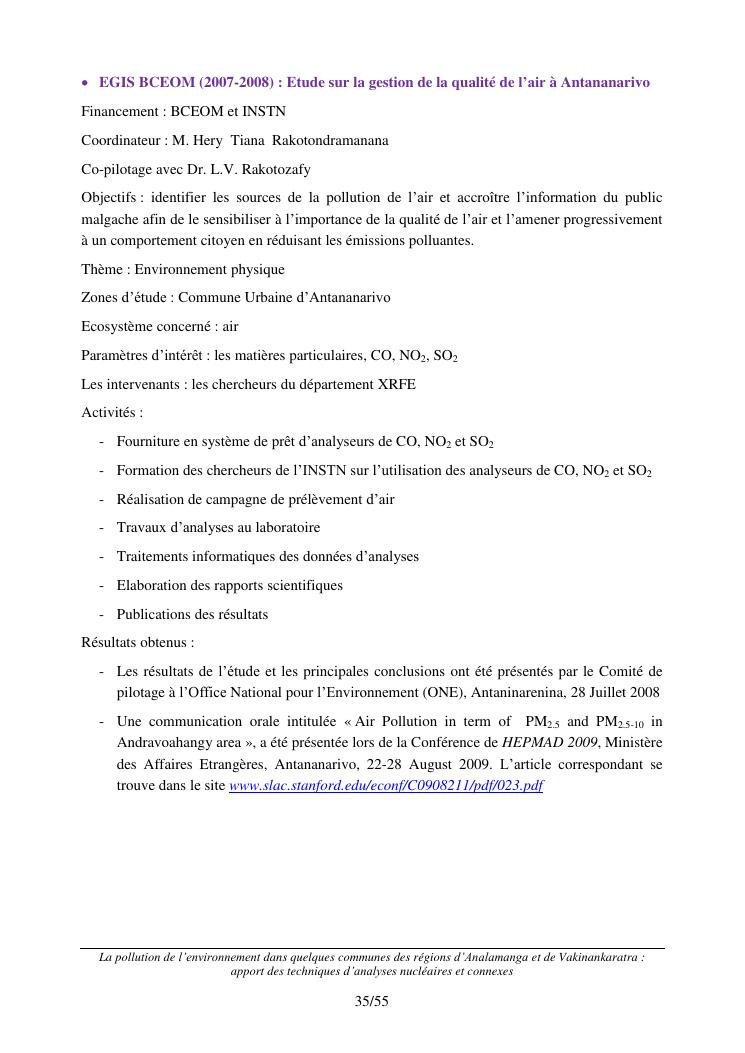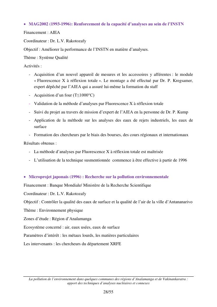la pollution de l'environnement dans quelques communes des régions d'analamanga et de vakinankaratra : apport des techniques d'analyses nucléaires et connexes. volume 1 : document de synthèse et curriculum vitæ