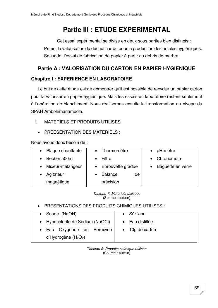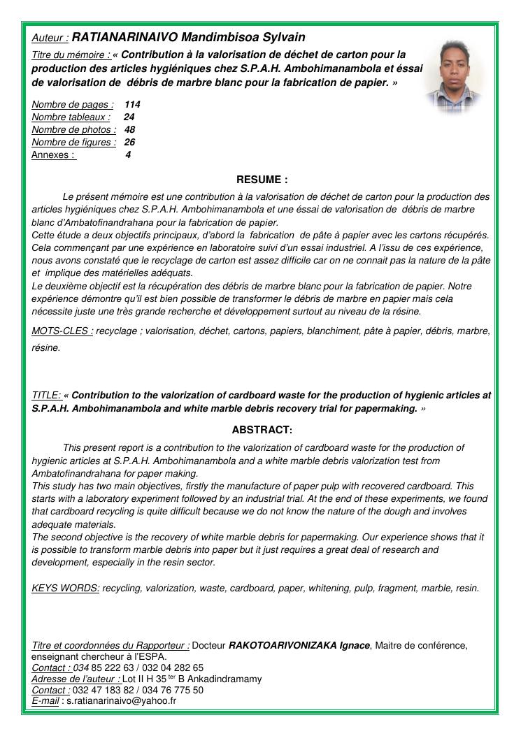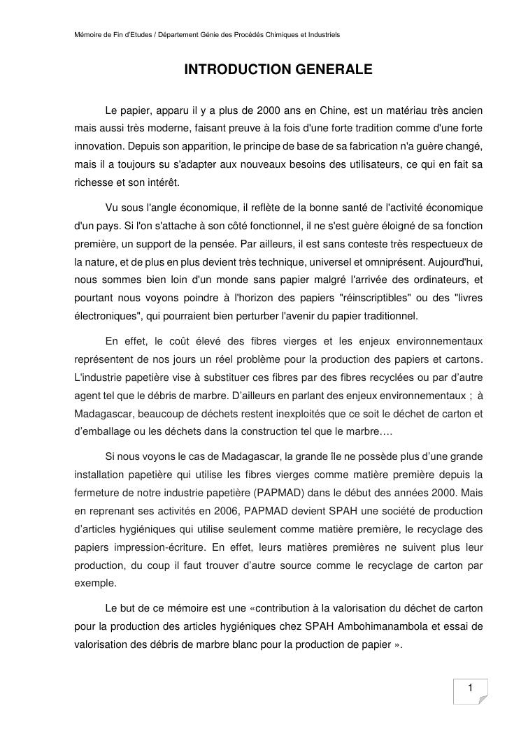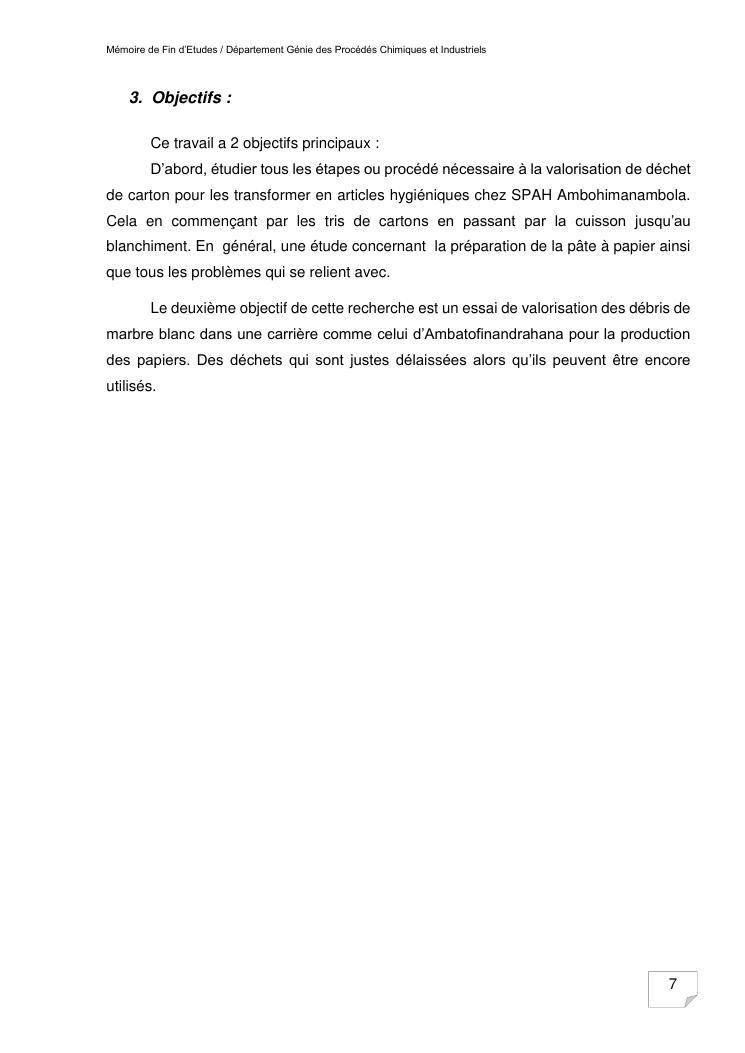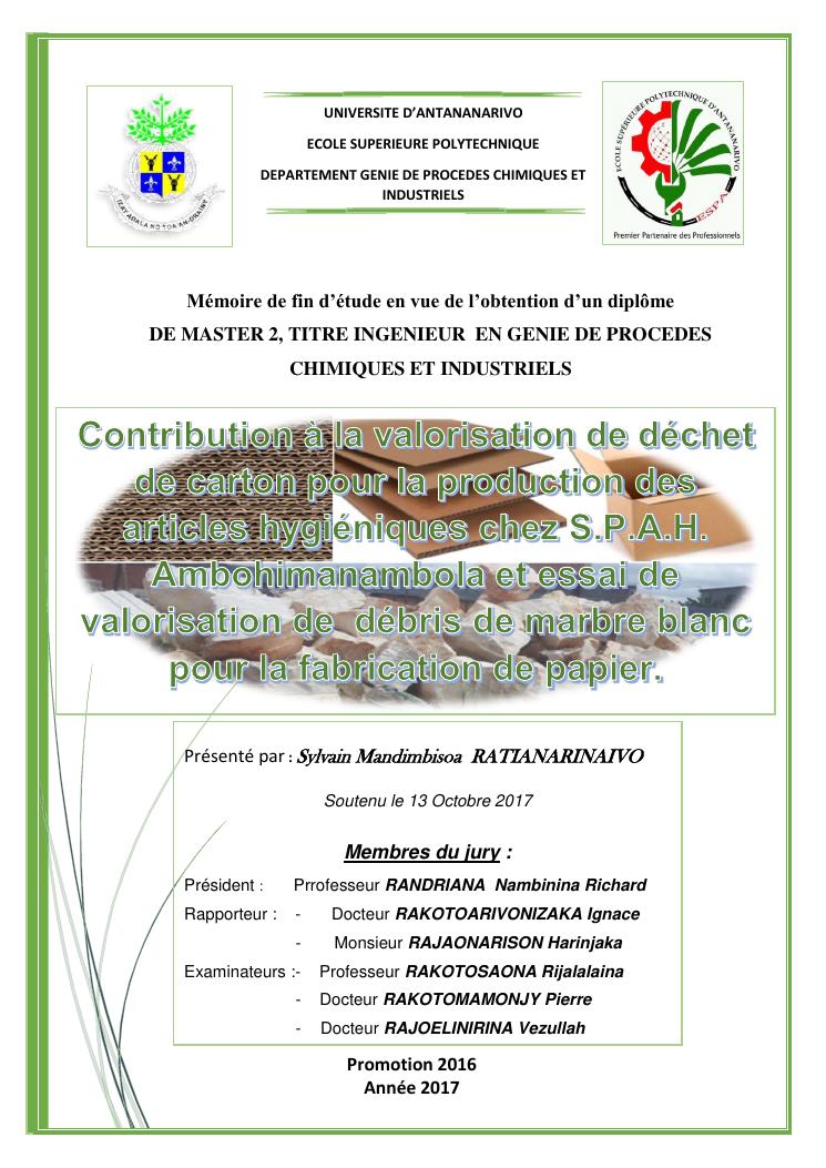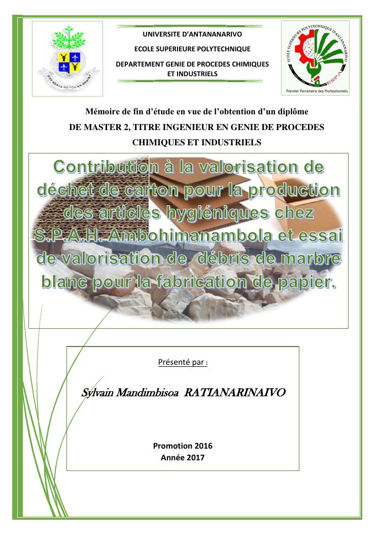 contribution à la valorisation de déchet de carton pour la production des articles hygiéniques chez s.p.a.h. ambohimanambola et éssai de valorisation de débris de marbre blanc pour la fabrication de papier.