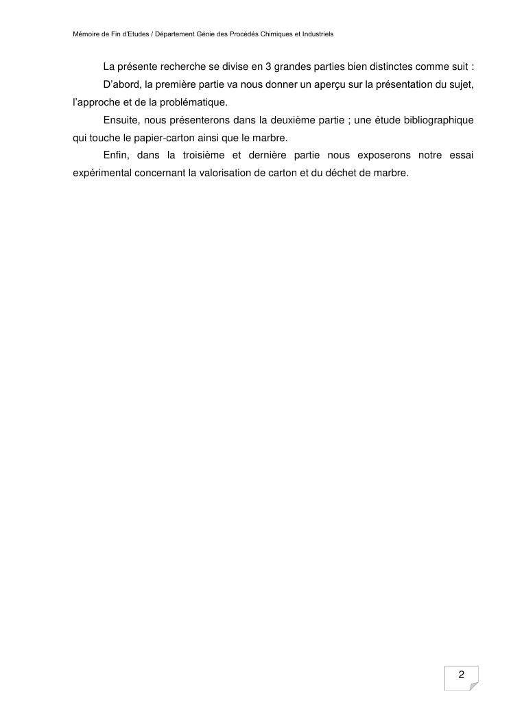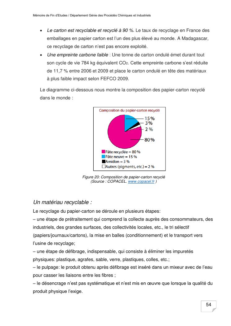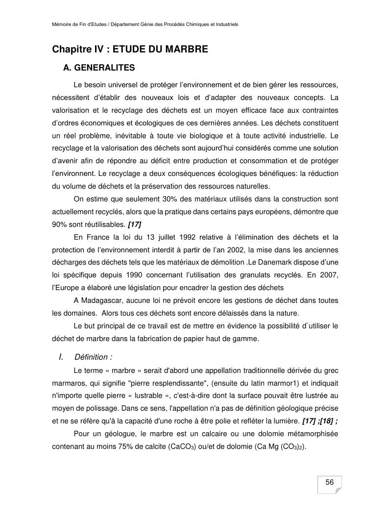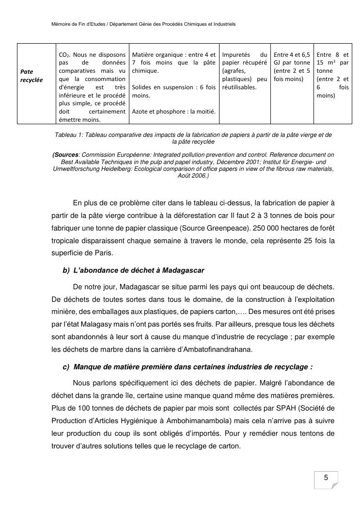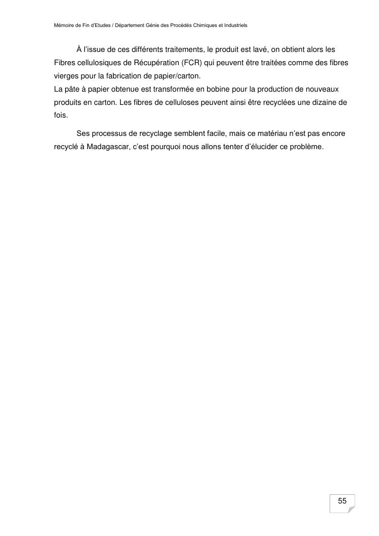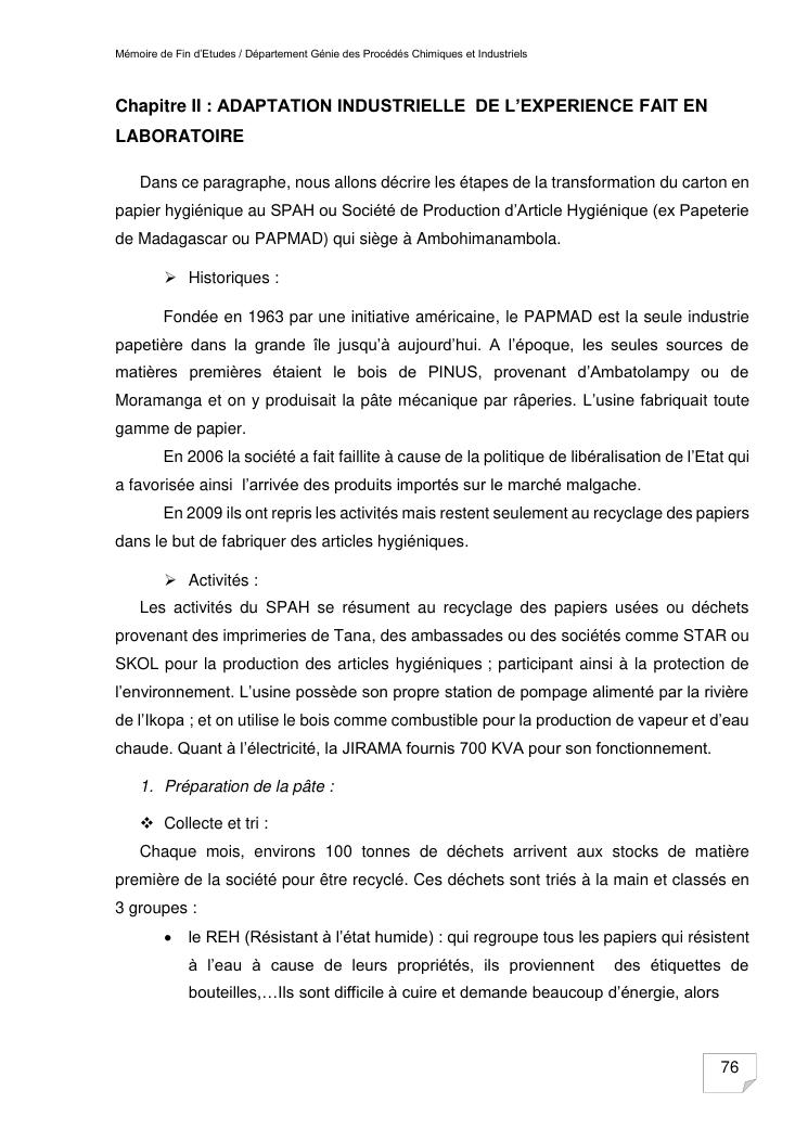 contribution à la valorisation de déchet de carton pour la production des articles hygiéniques chez s.p.a.h. ambohimanambola et éssai de valorisation de débris de marbre blanc pour la fabrication de papier.