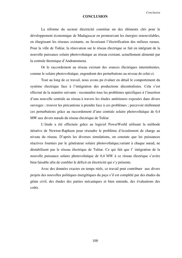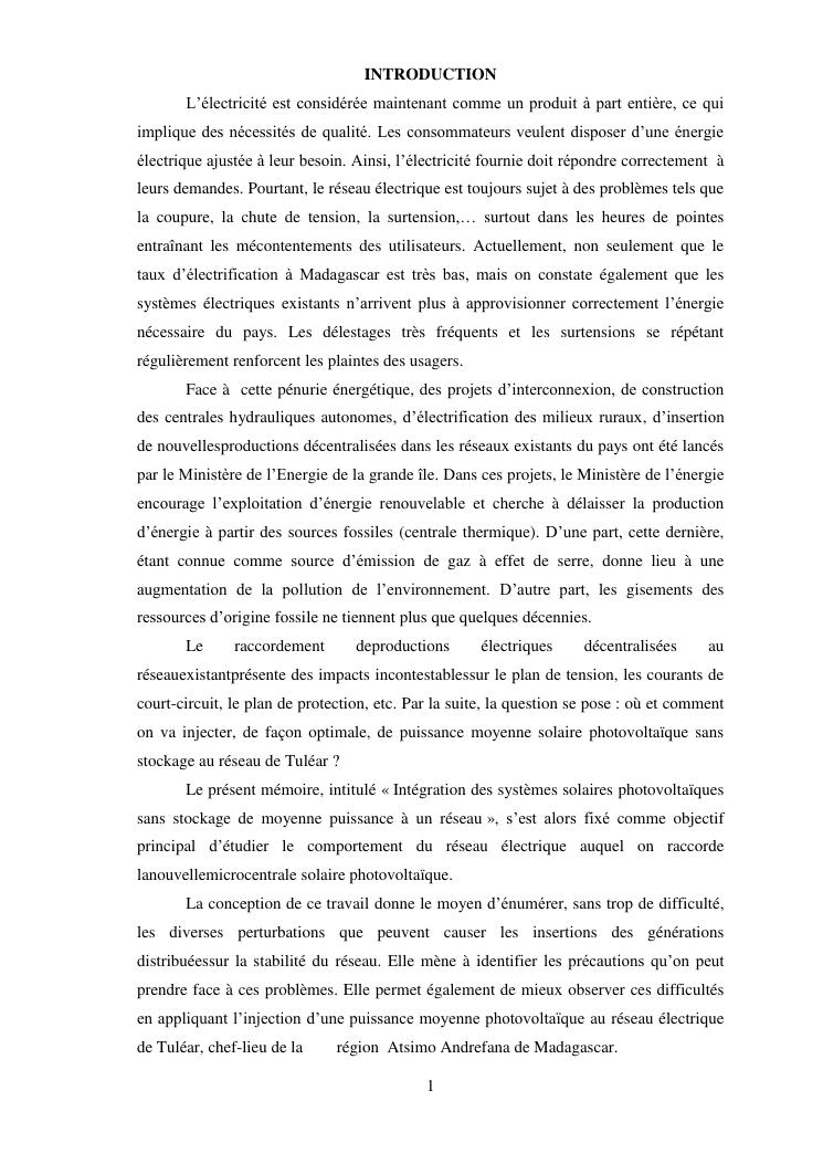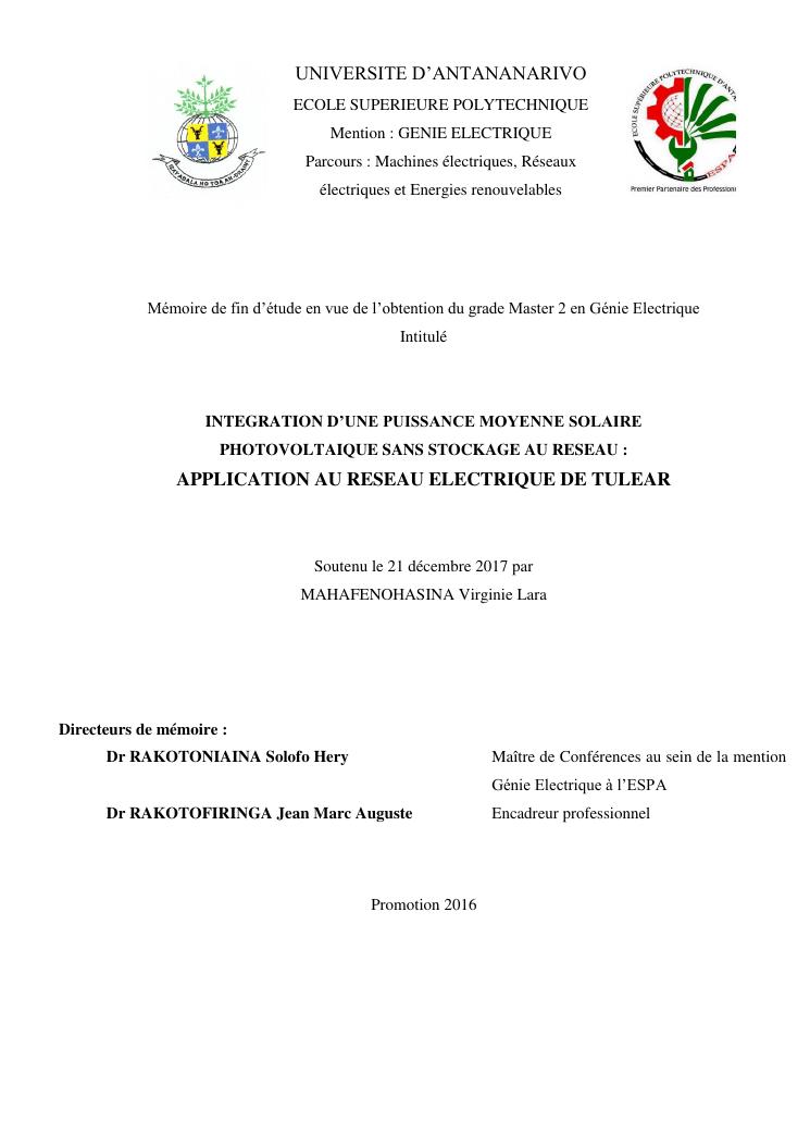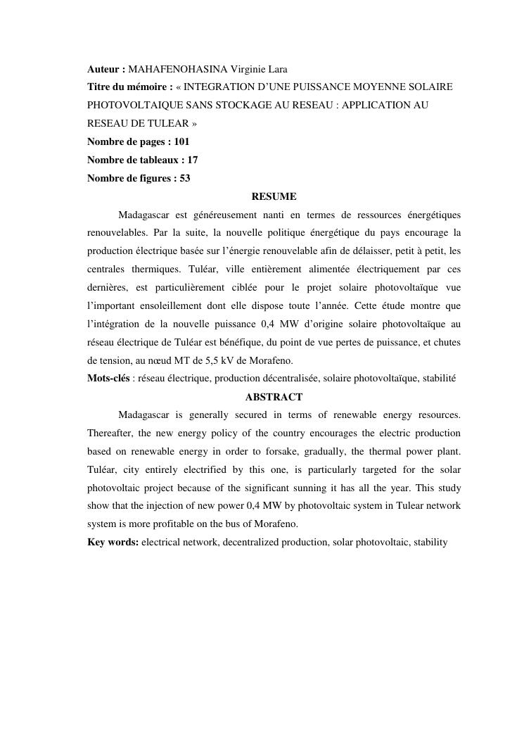 integration d'une puissance moyenne solaire photovoltaique sans stockage au reseau : application au reseau electrique de tulear