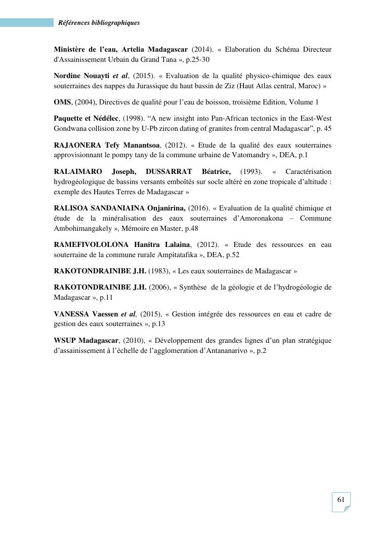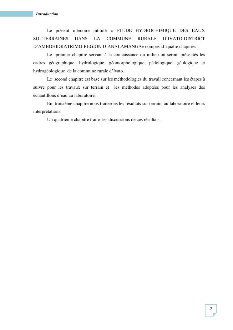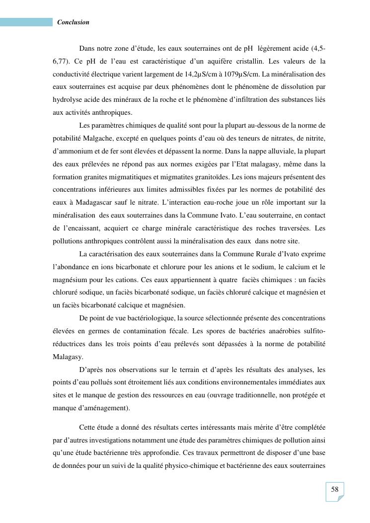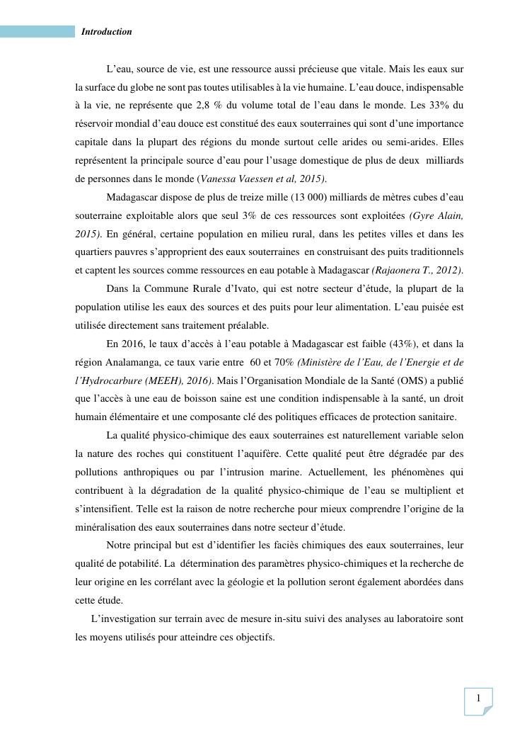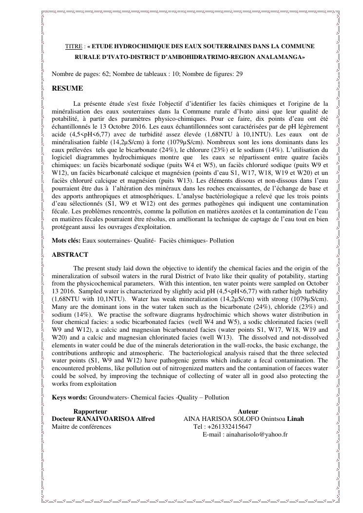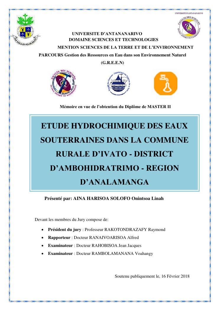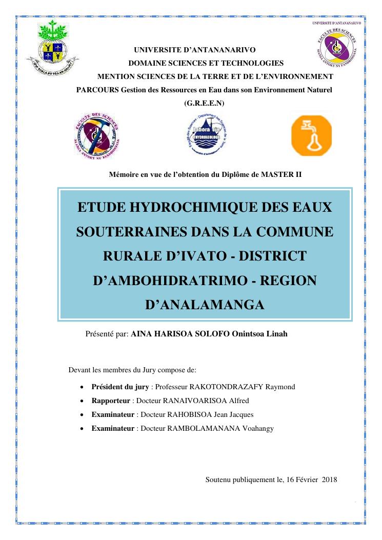 etude hydrochimique des eaux souterraines dans la commune rurale d'ivato - district d'ambohidratrimo - region d'analamanga