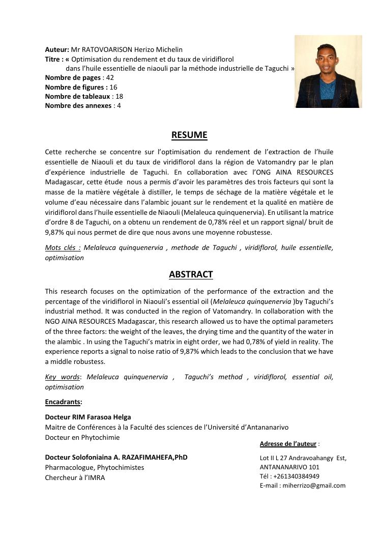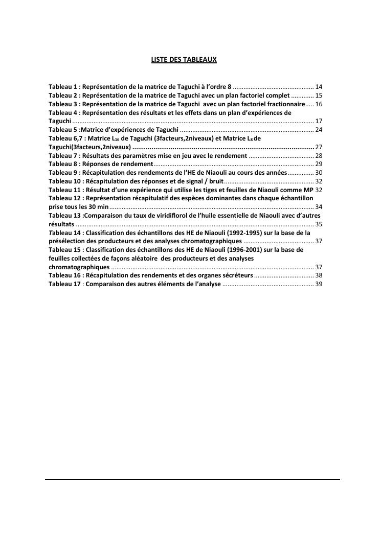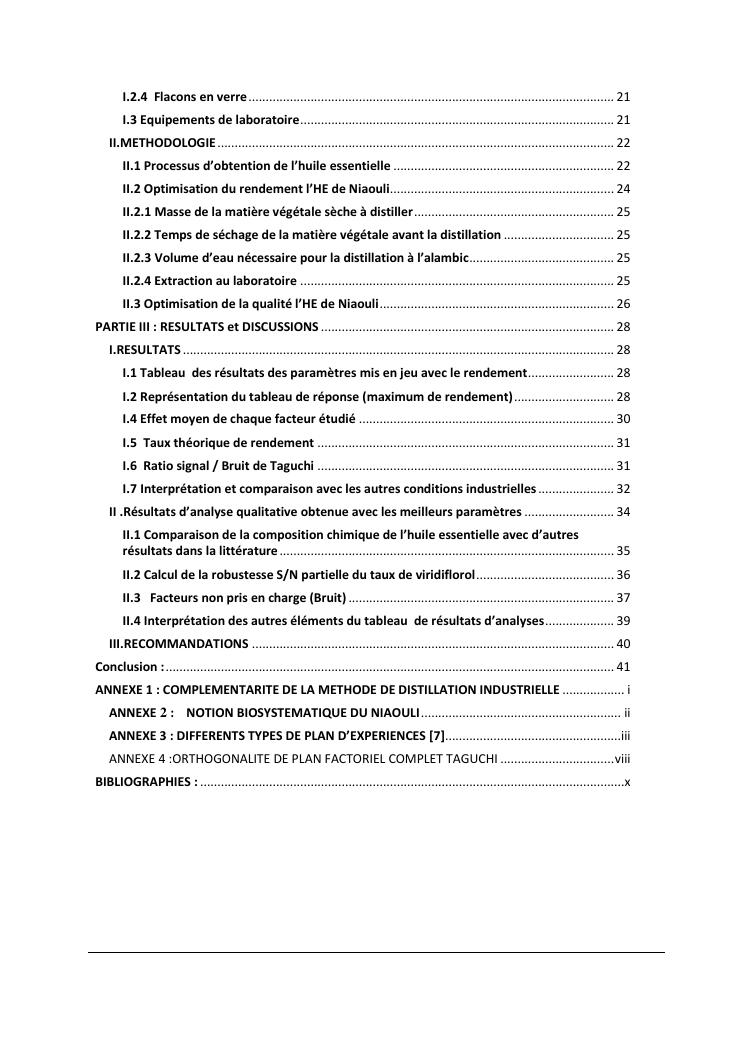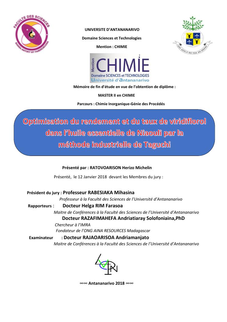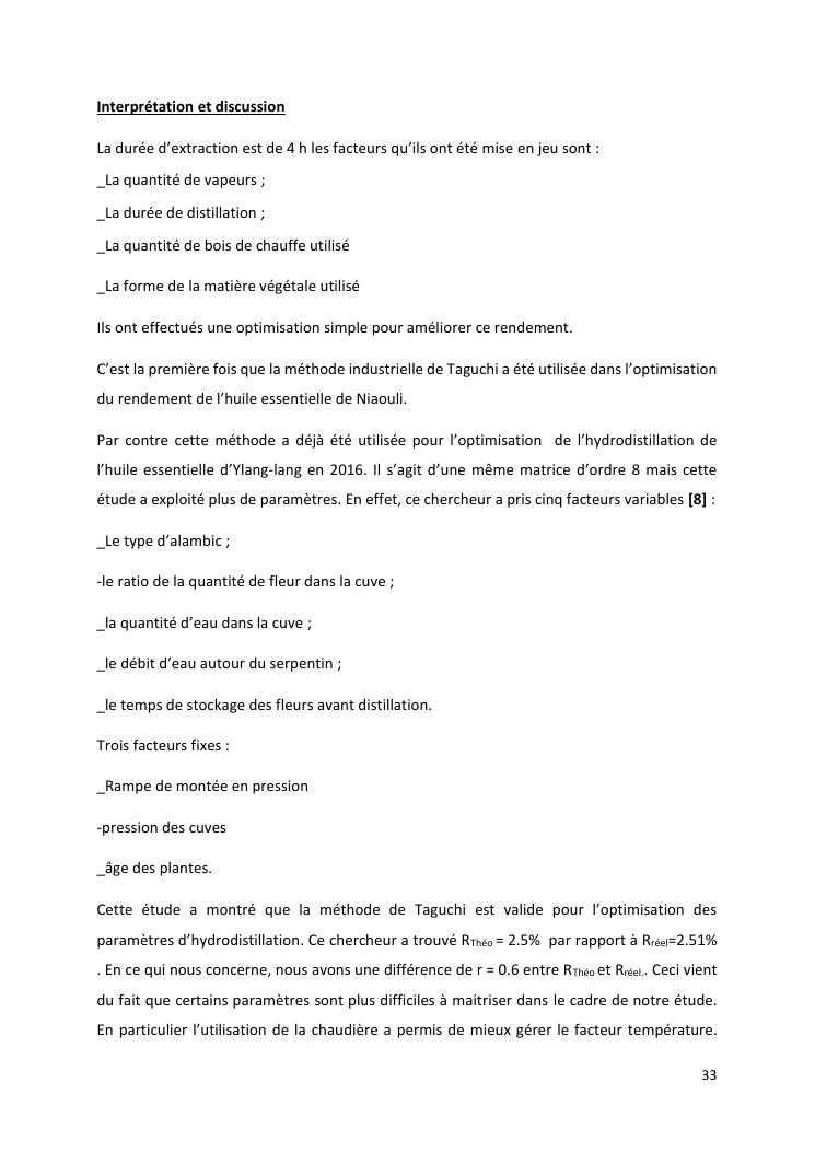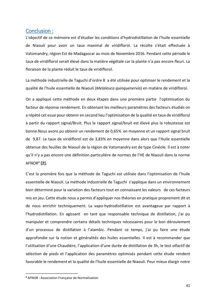 optimisation du rendement et du taux de viridiflorol dans l'huile essentielle de niaouli par la méthode industrielle de taguchi
