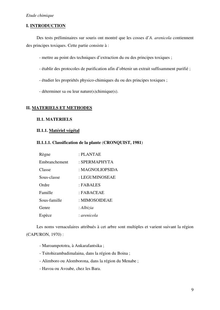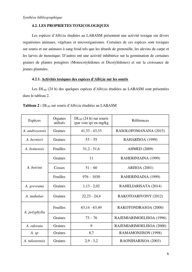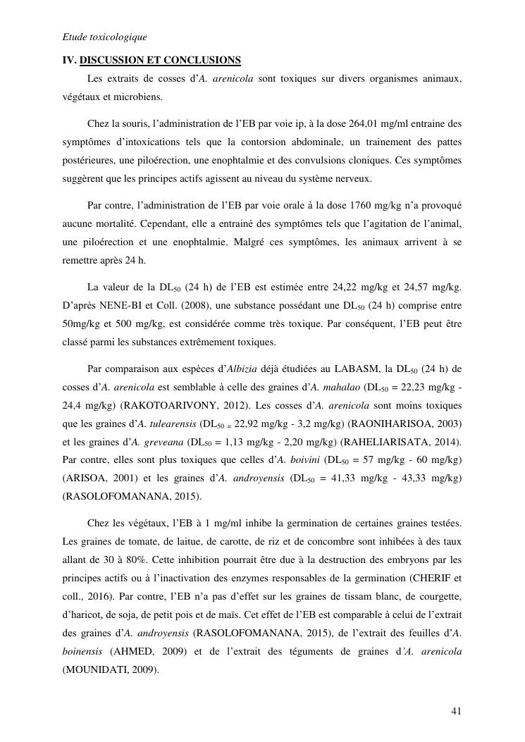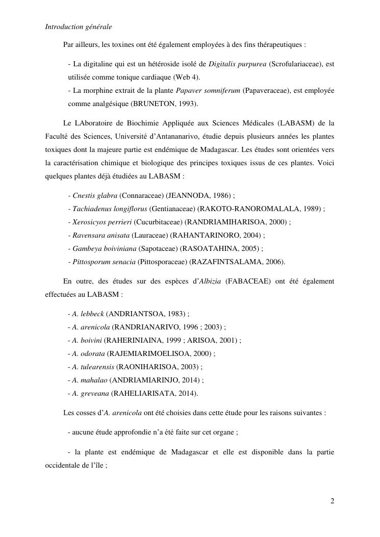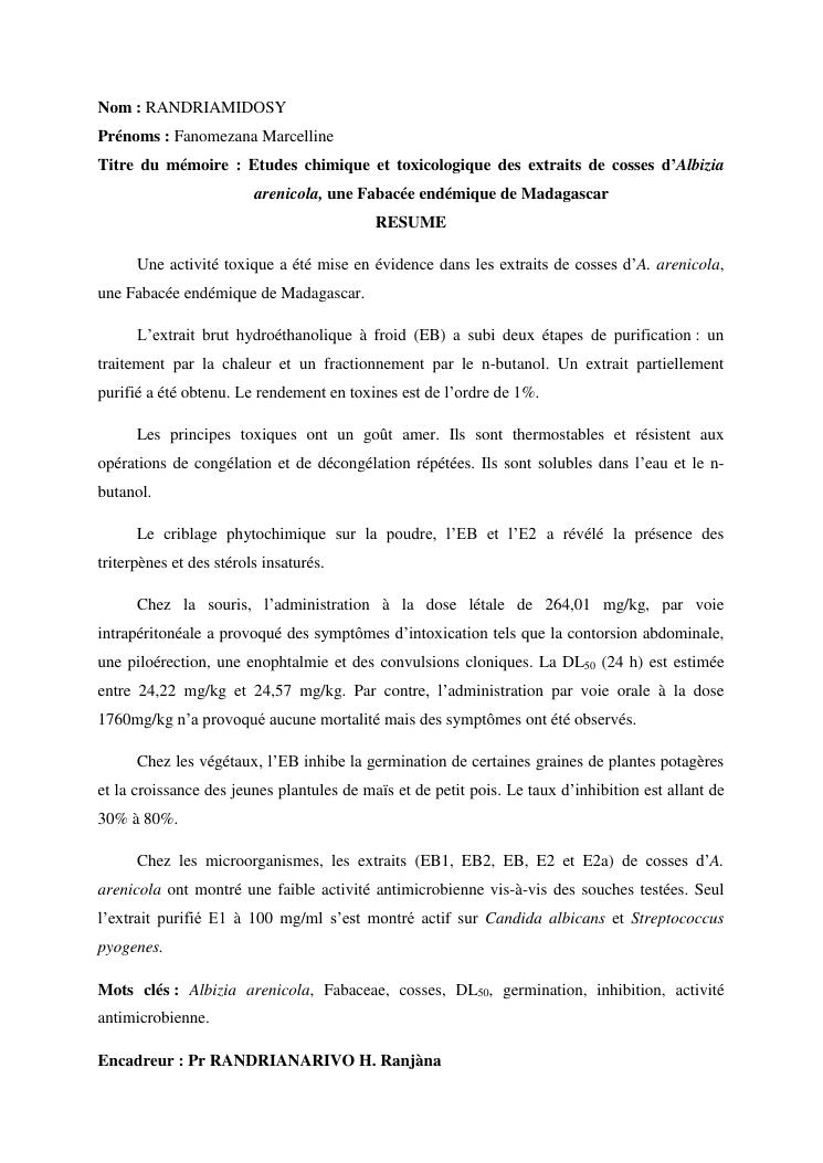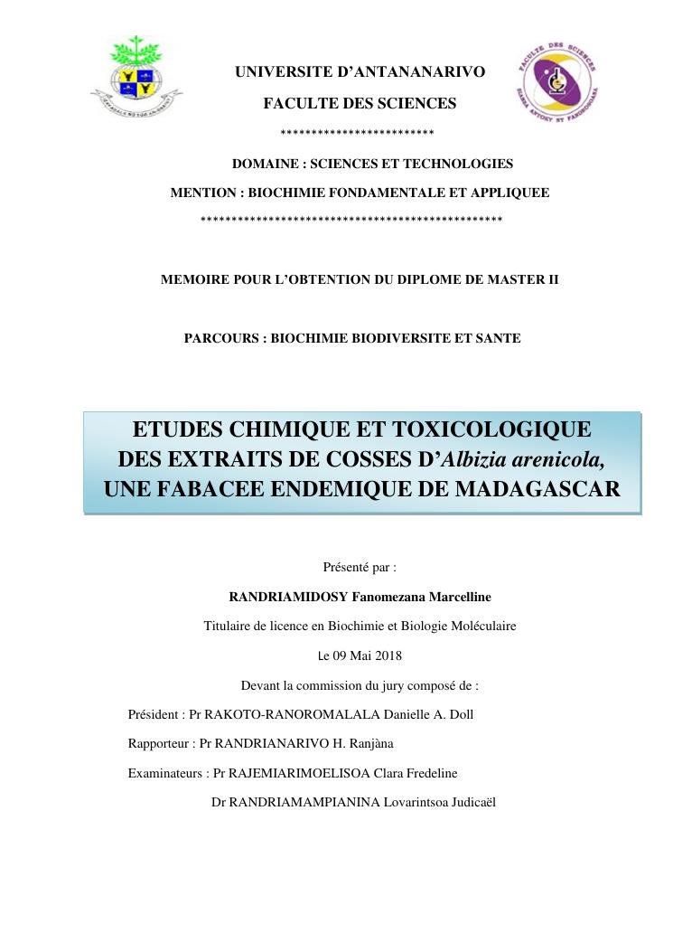 etudes chimique et toxicologique des extraits de cosses d'albizia arenicola, une fabacee endemique de madagascar