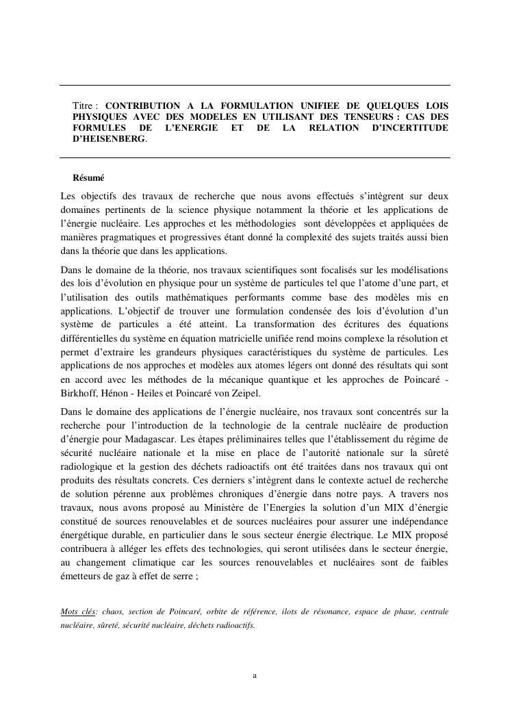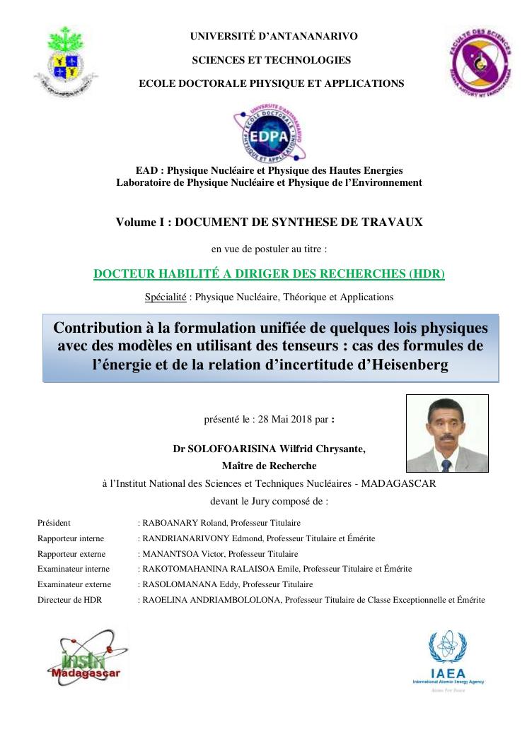 contribution à la formulation unifiée de quelques lois physiques avec des modèles en utilisant des tenseurs : cas des formules de l'énergie et de la relation d'incertitude d'heisenberg. volume i : document de synthese de travaux