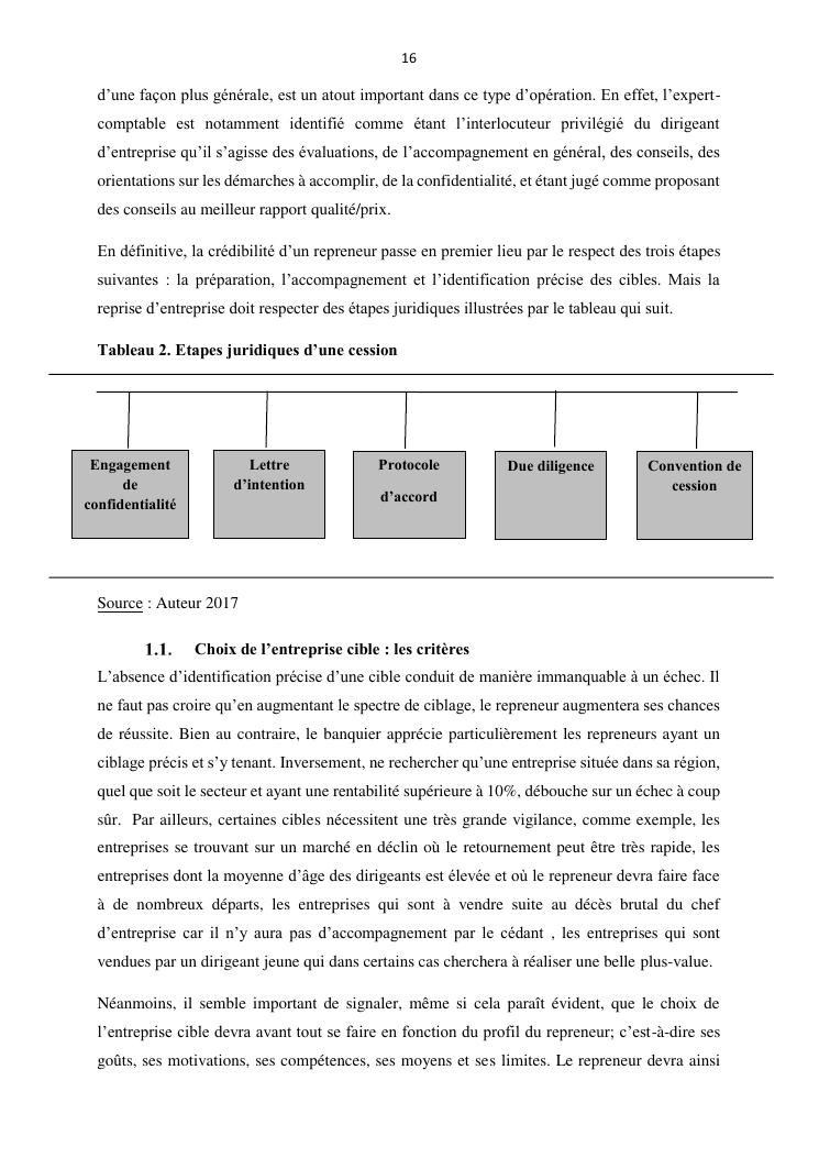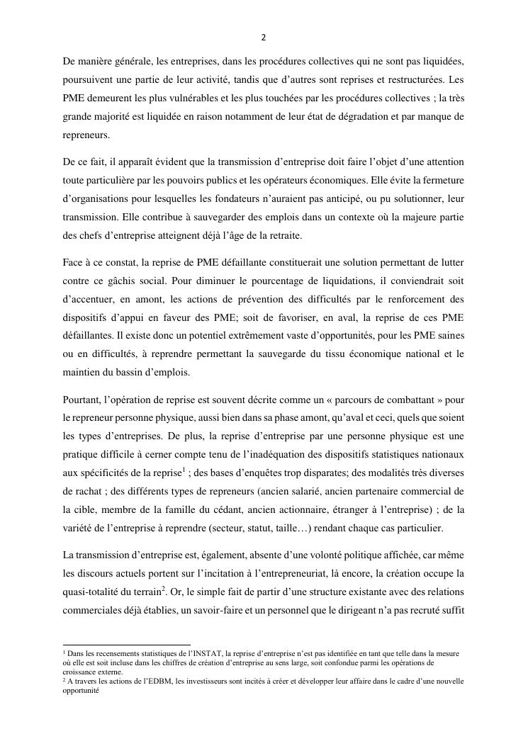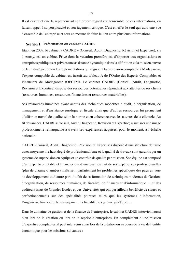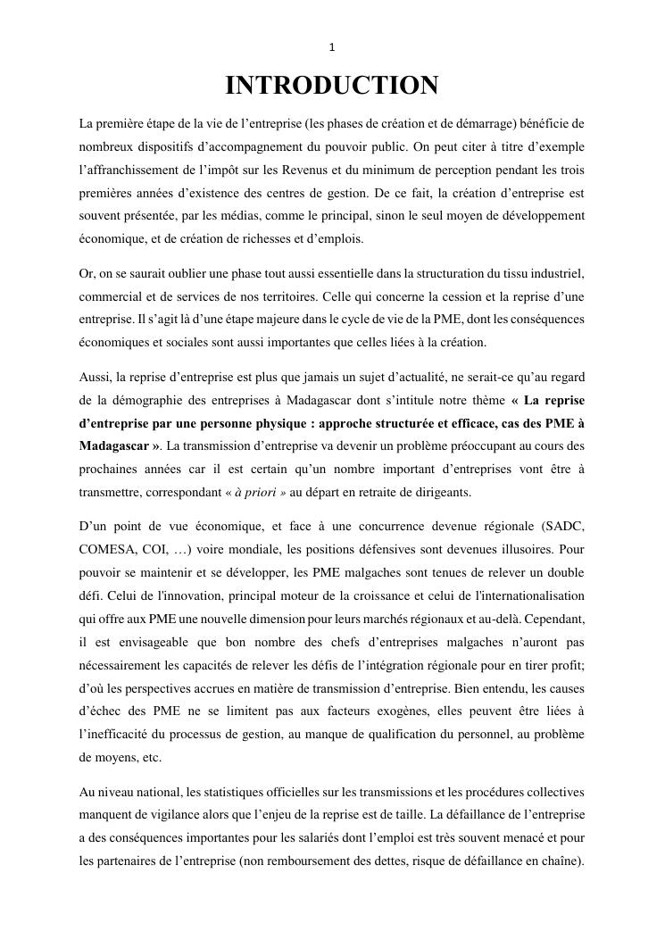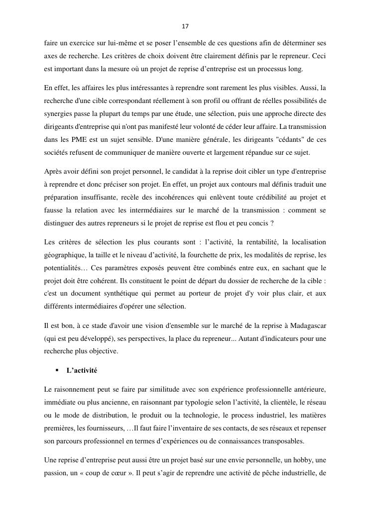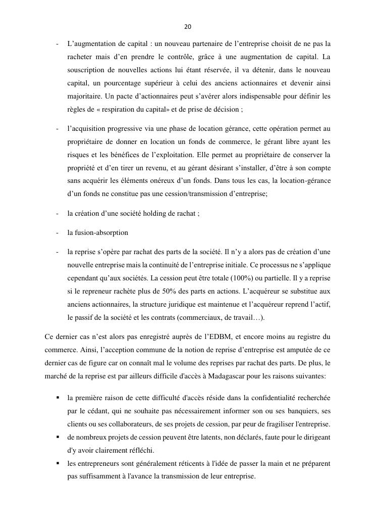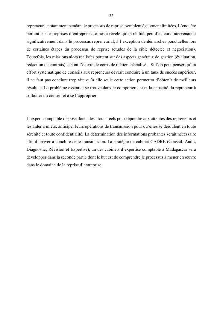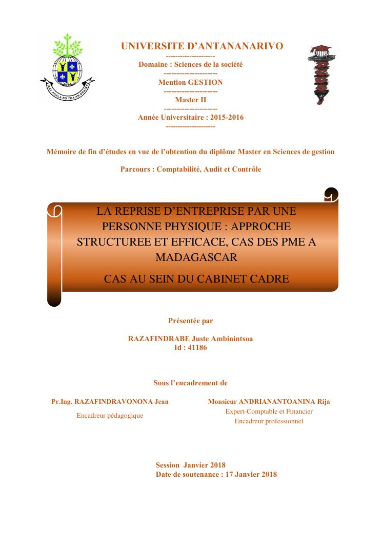 la reprise d'entreprise par une personne physique : approche structuree et efficace, cas des pme a madagascar cas au sein du cabinet cadre