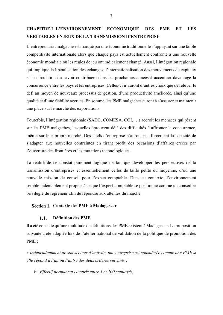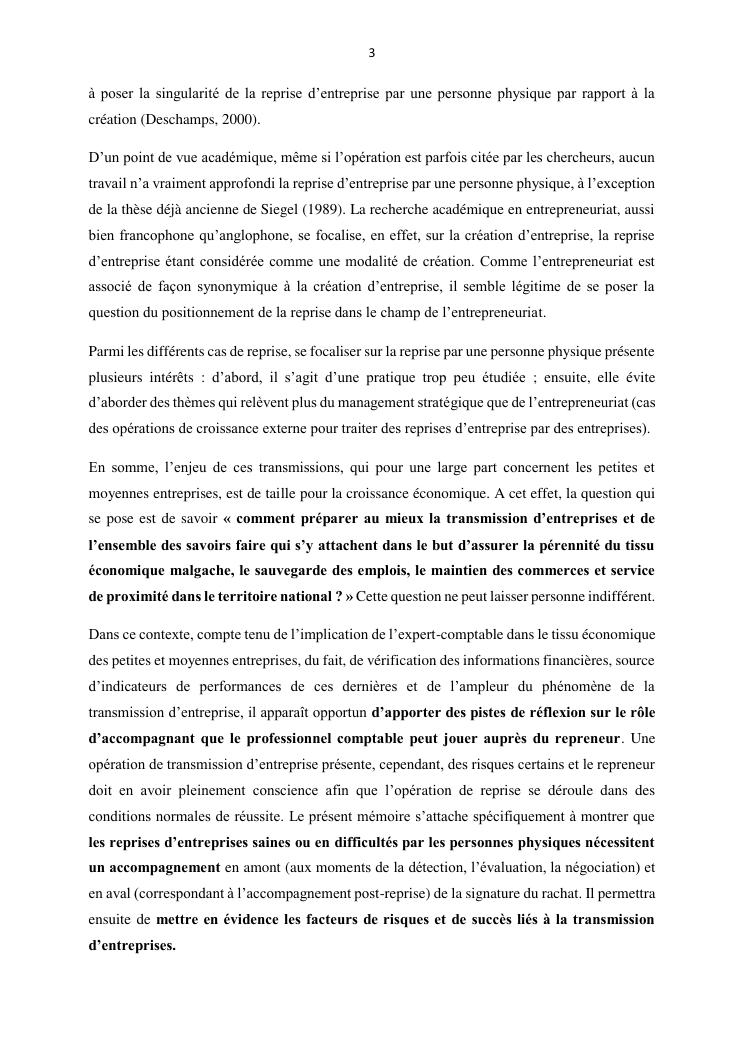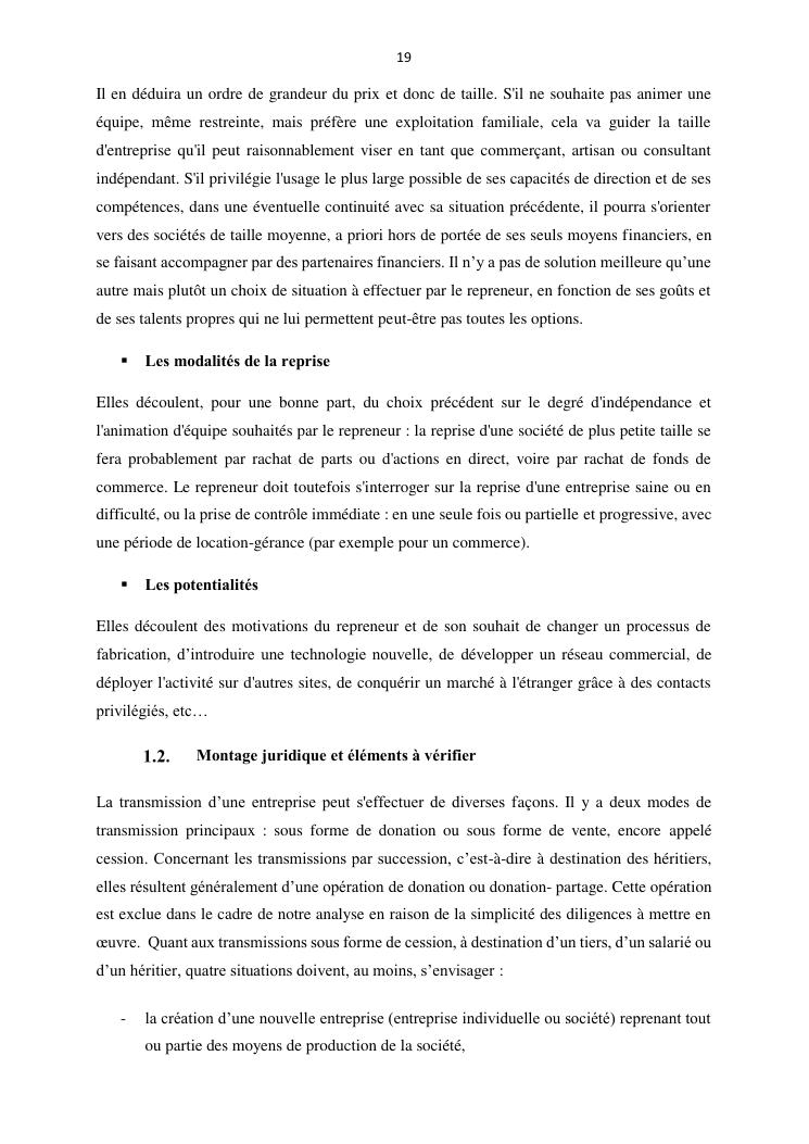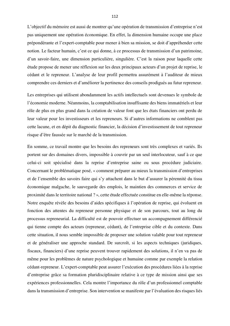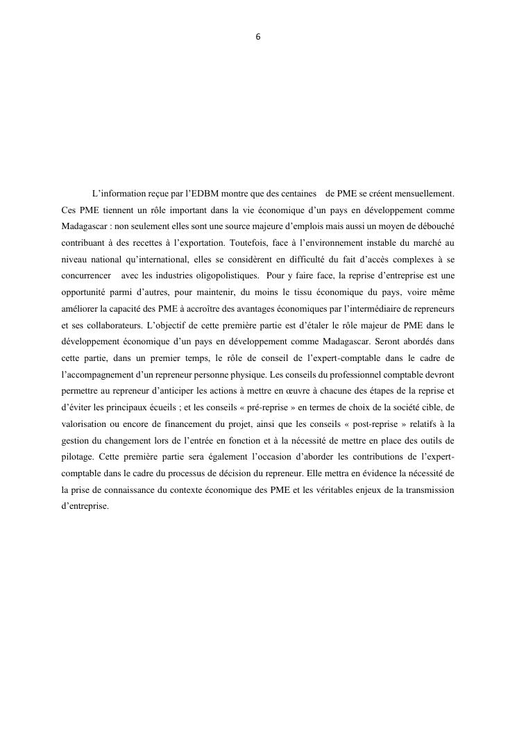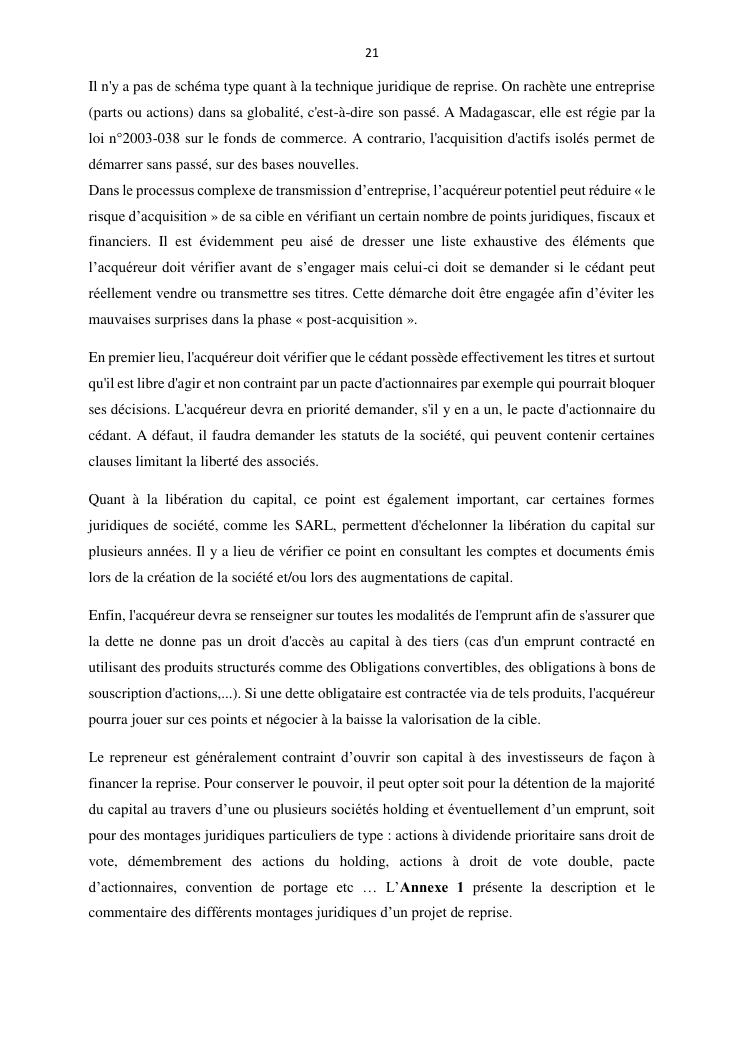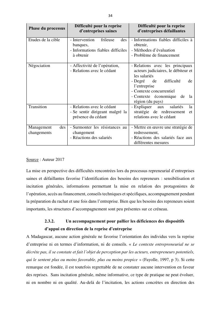 la reprise d'entreprise par une personne physique : approche structuree et efficace, cas des pme a madagascar cas au sein du cabinet cadre