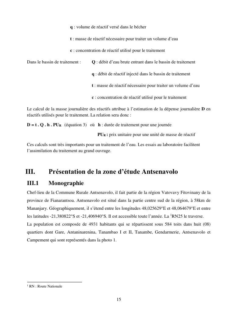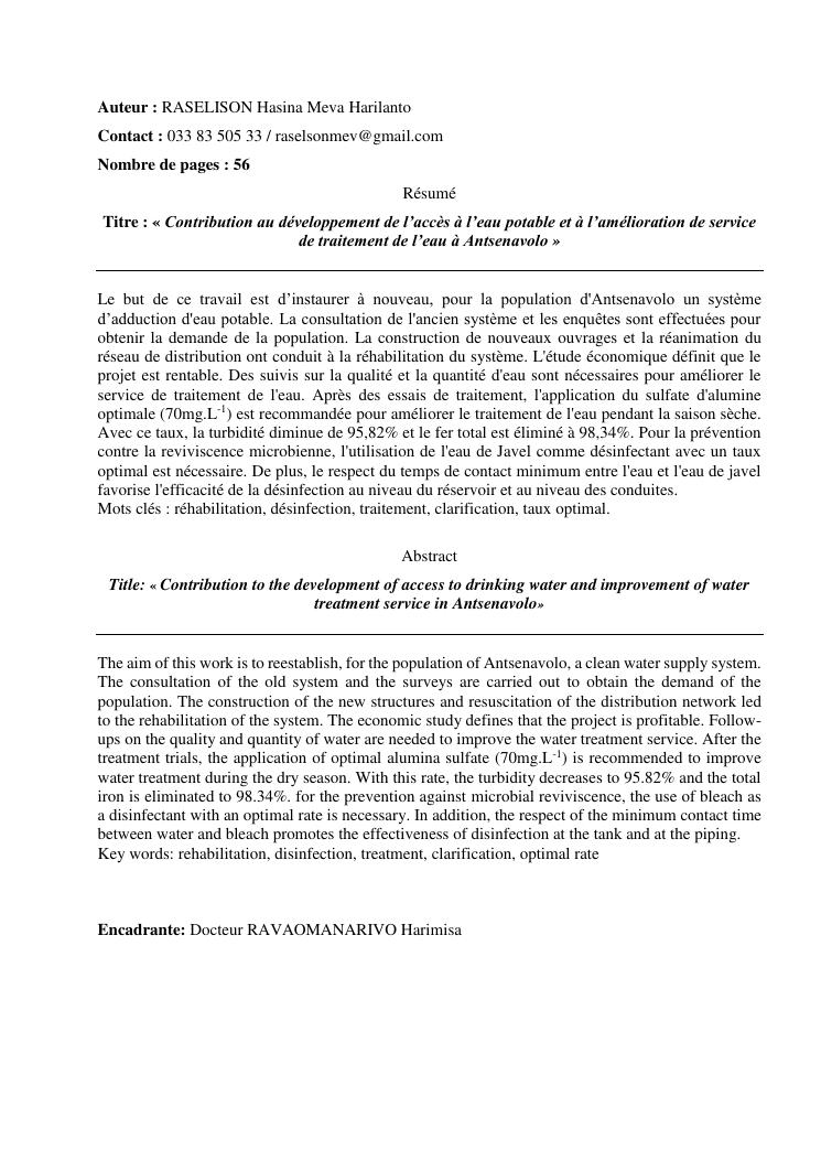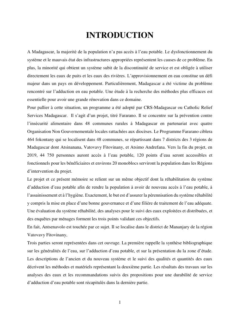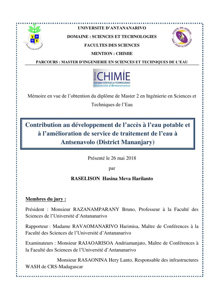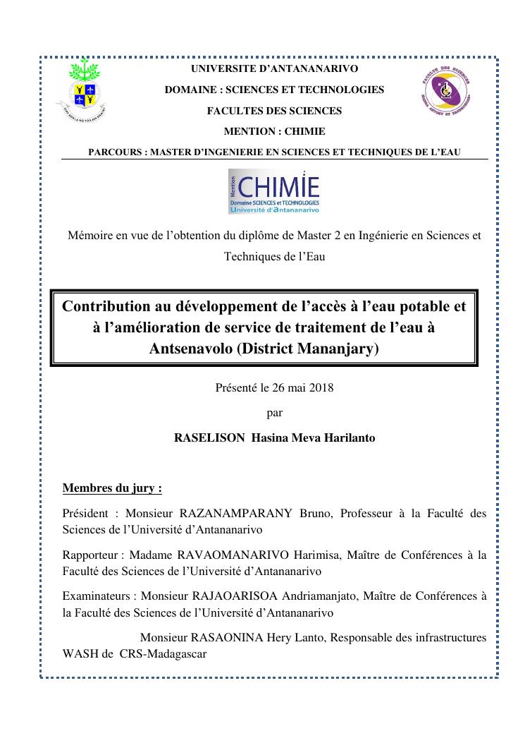 contribution au développement de l'accès à l'eau potable et à l'amélioration de service de traitement de l'eau à antsenavolo (district mananjary)