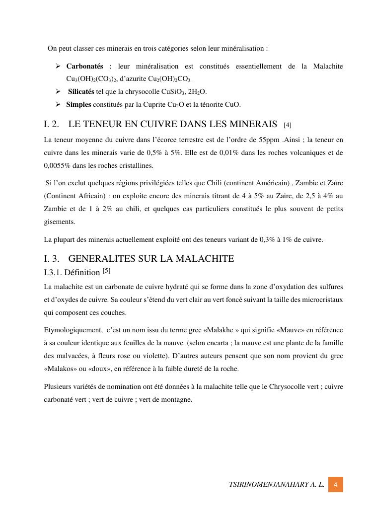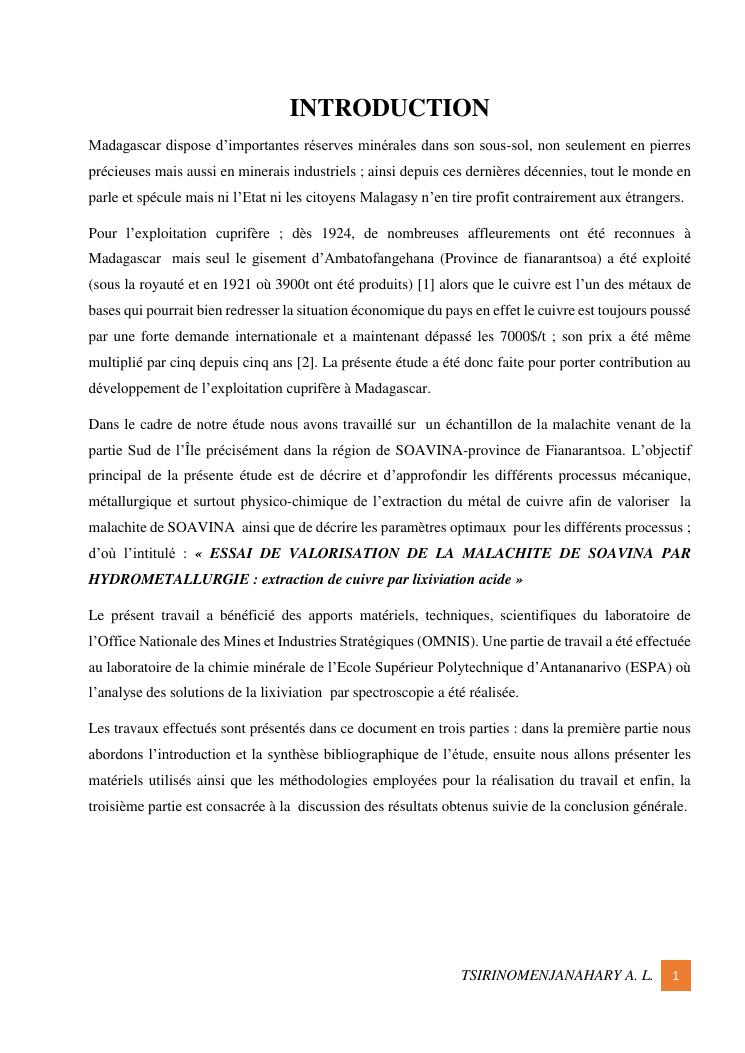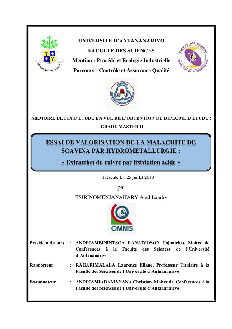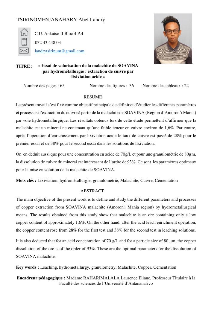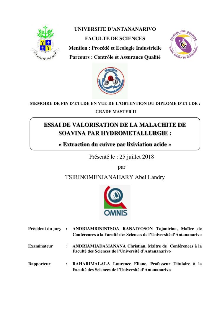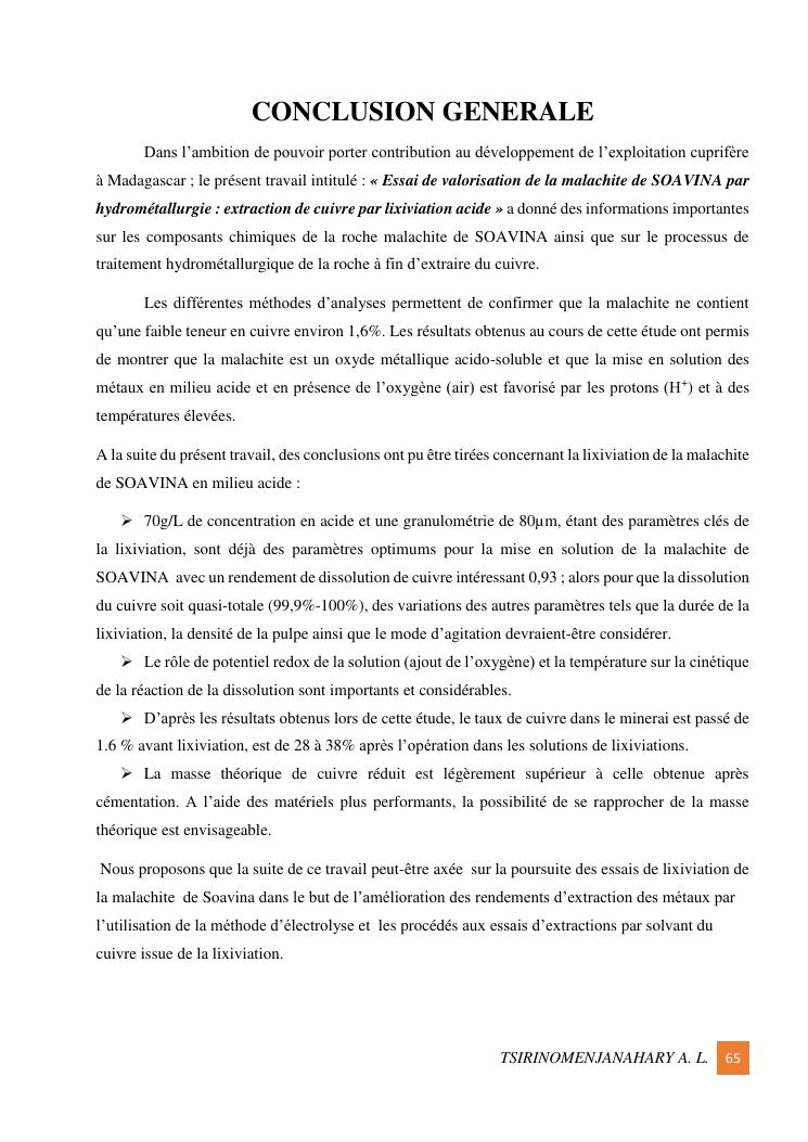 essai de valorisation de la malachite de soavina par hydrometallurgie : « extraction du cuivre par lixiviation acide »