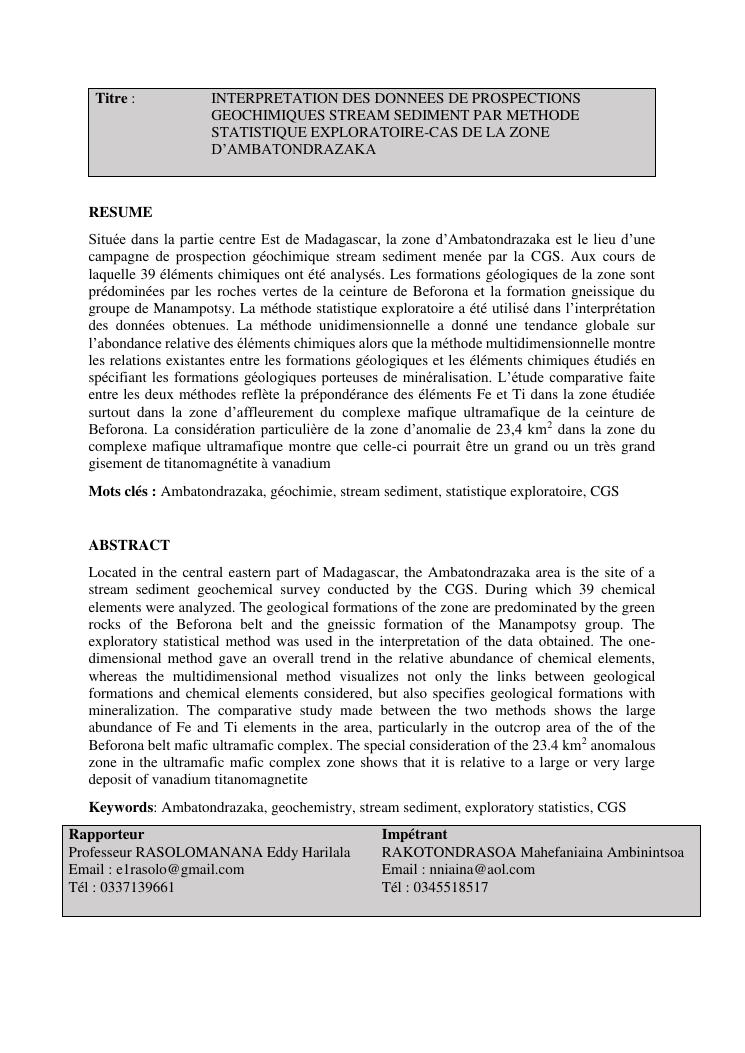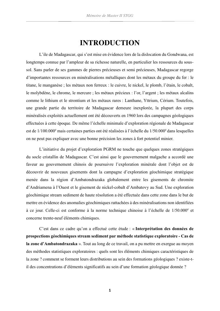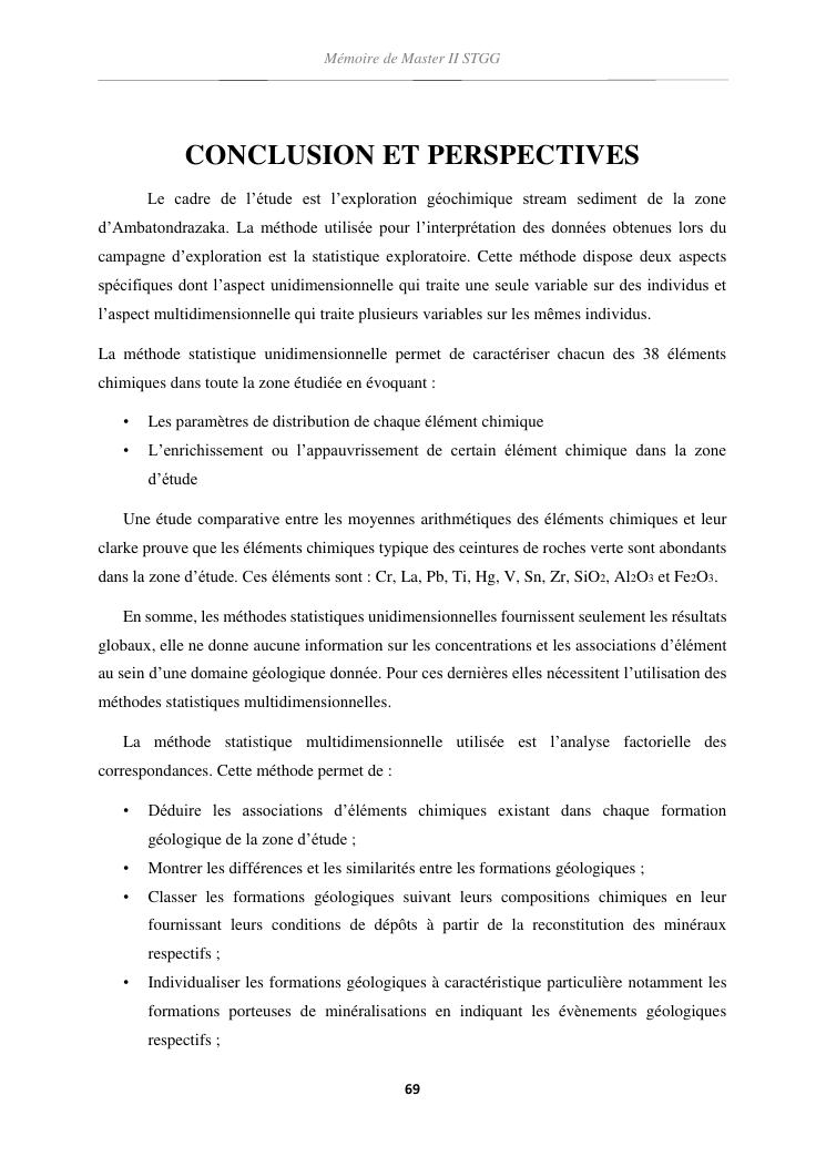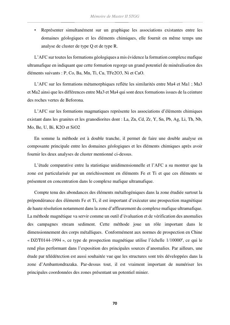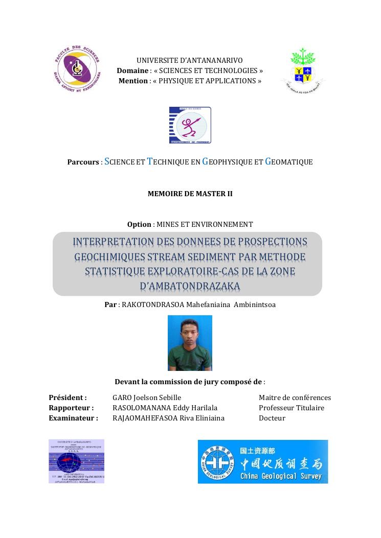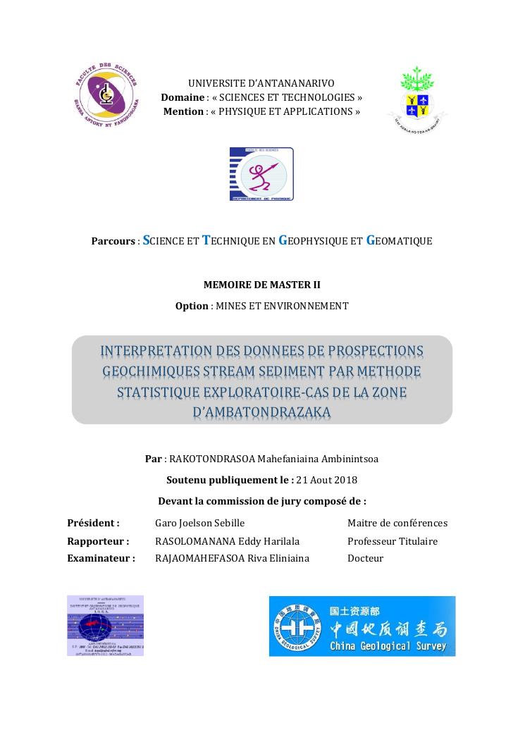 interpretation des donnees de prospections geochimiques stream sediment par methode statistique exploratoire : cas de la zone d'ambatondrazaka