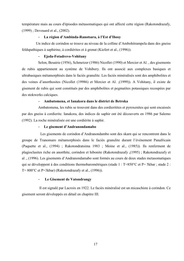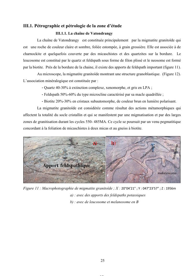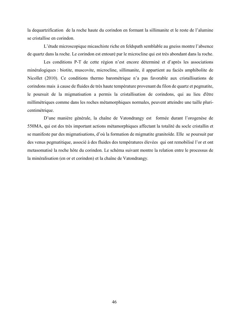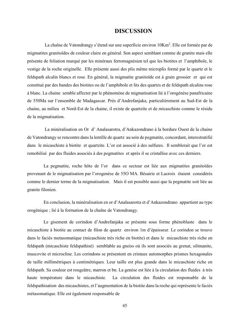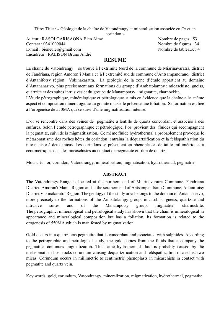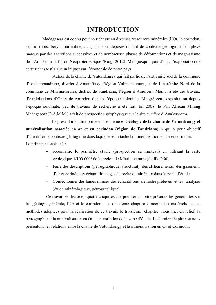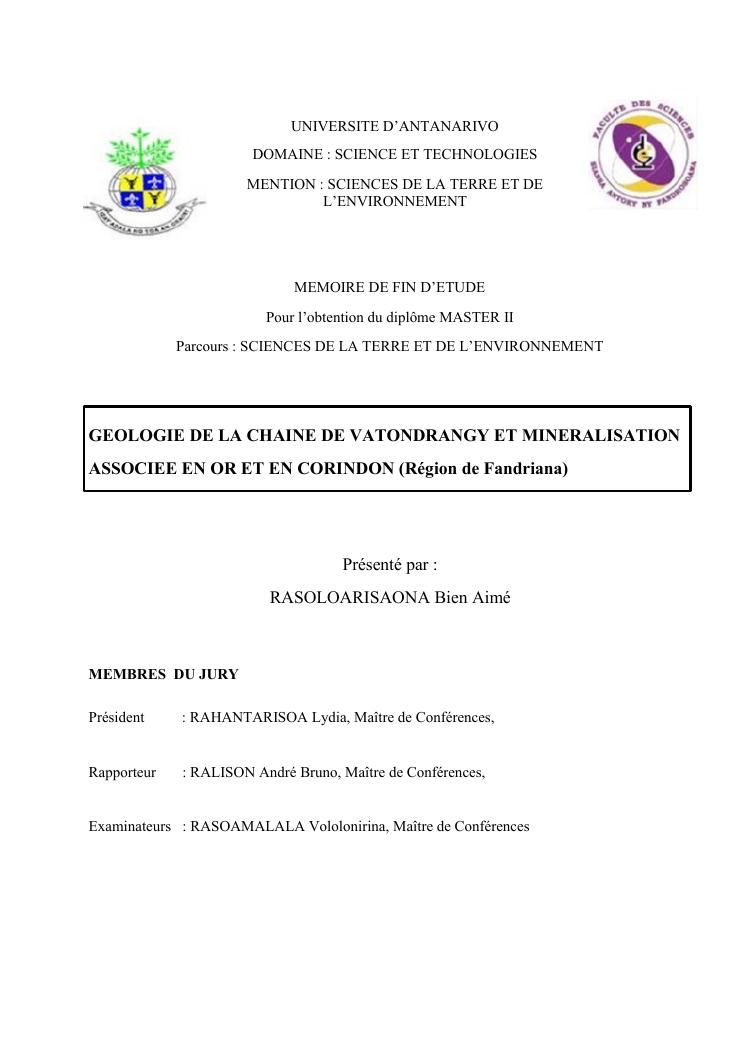 geologie de la chaine de vatondrangy et mineralisation associee en or et en corindon (région de fandriana)